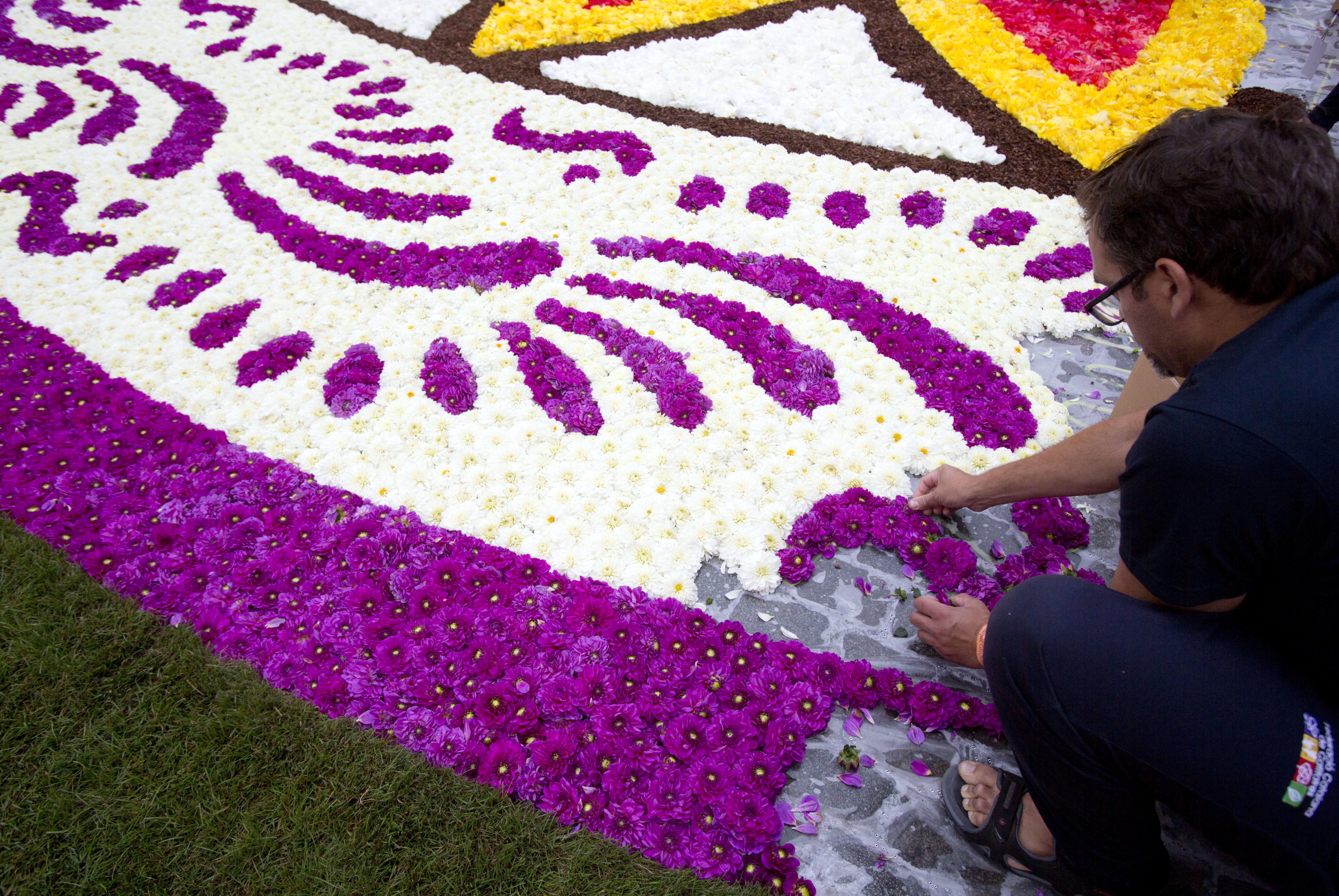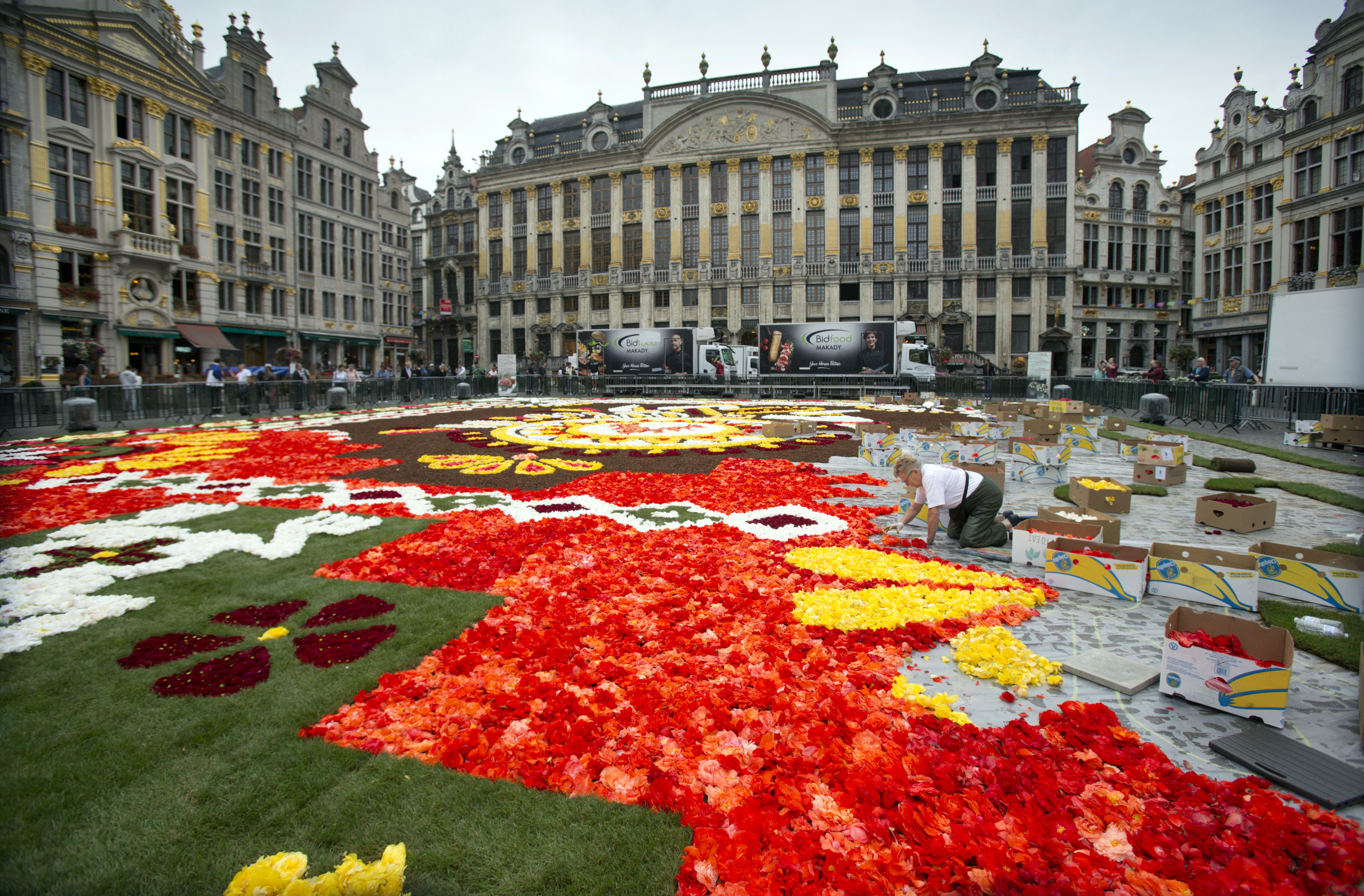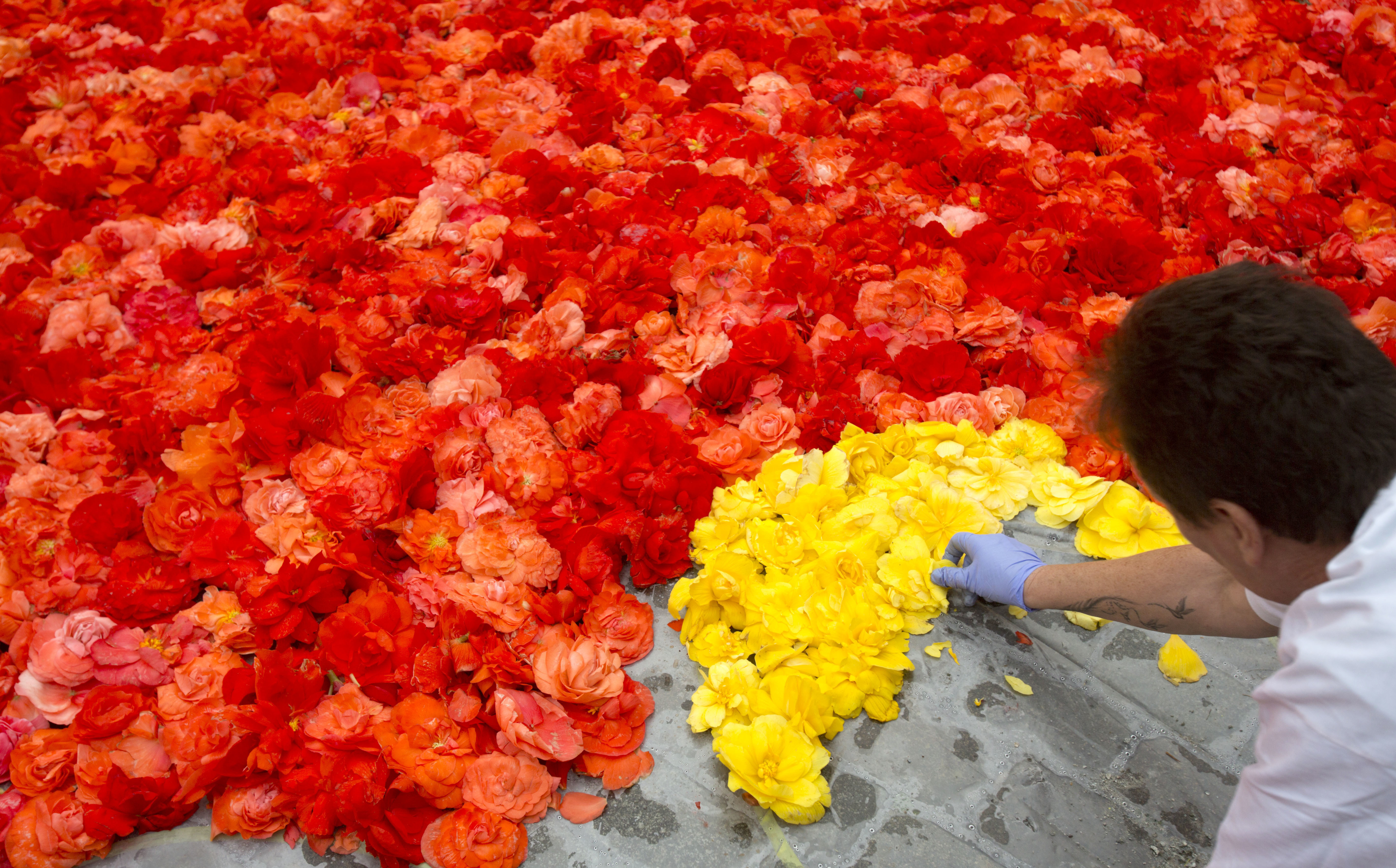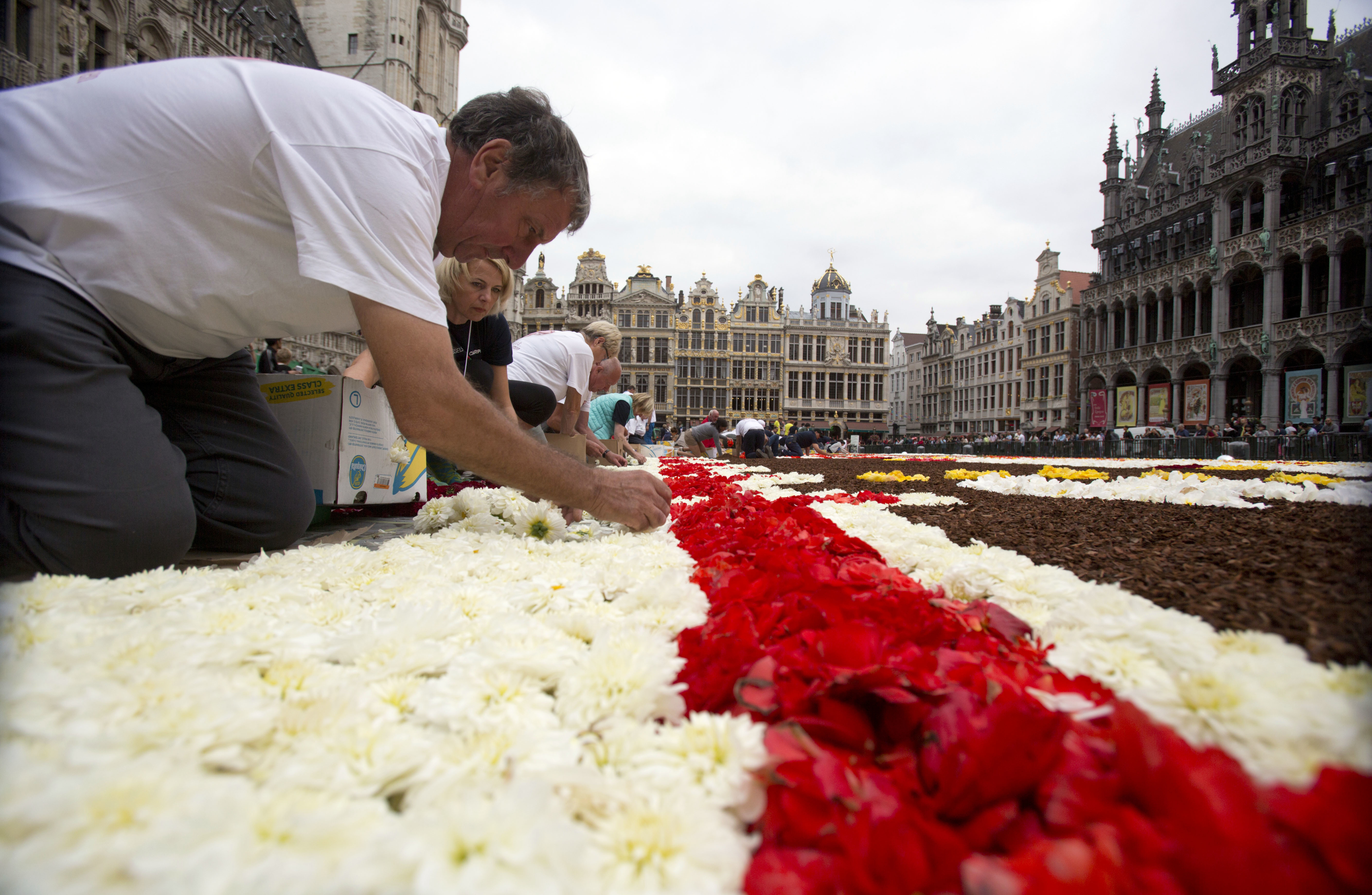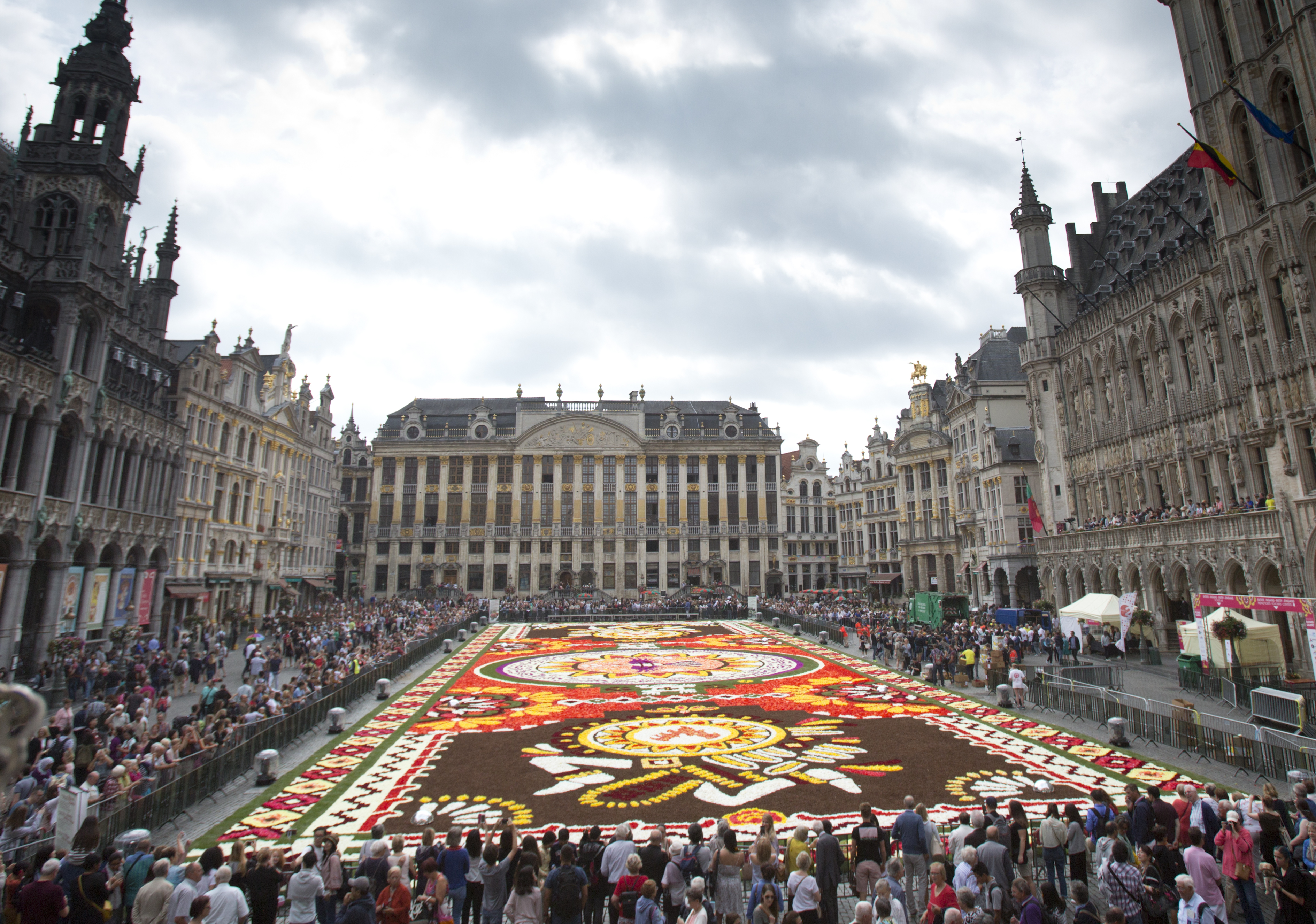 Il tappeto di fiori di Bruxelles, allestito nella sua interezza, sulla Grand Place di Bruxelles, giovedì 16 agosto scorso. Più di 500.000 fiori sono stati usati per creare il tema latino-americano, dedicato alla regione messicana di Guanajuato, che ha un’eccezionale cultura e una ricca tradizione floreale (foto AP).