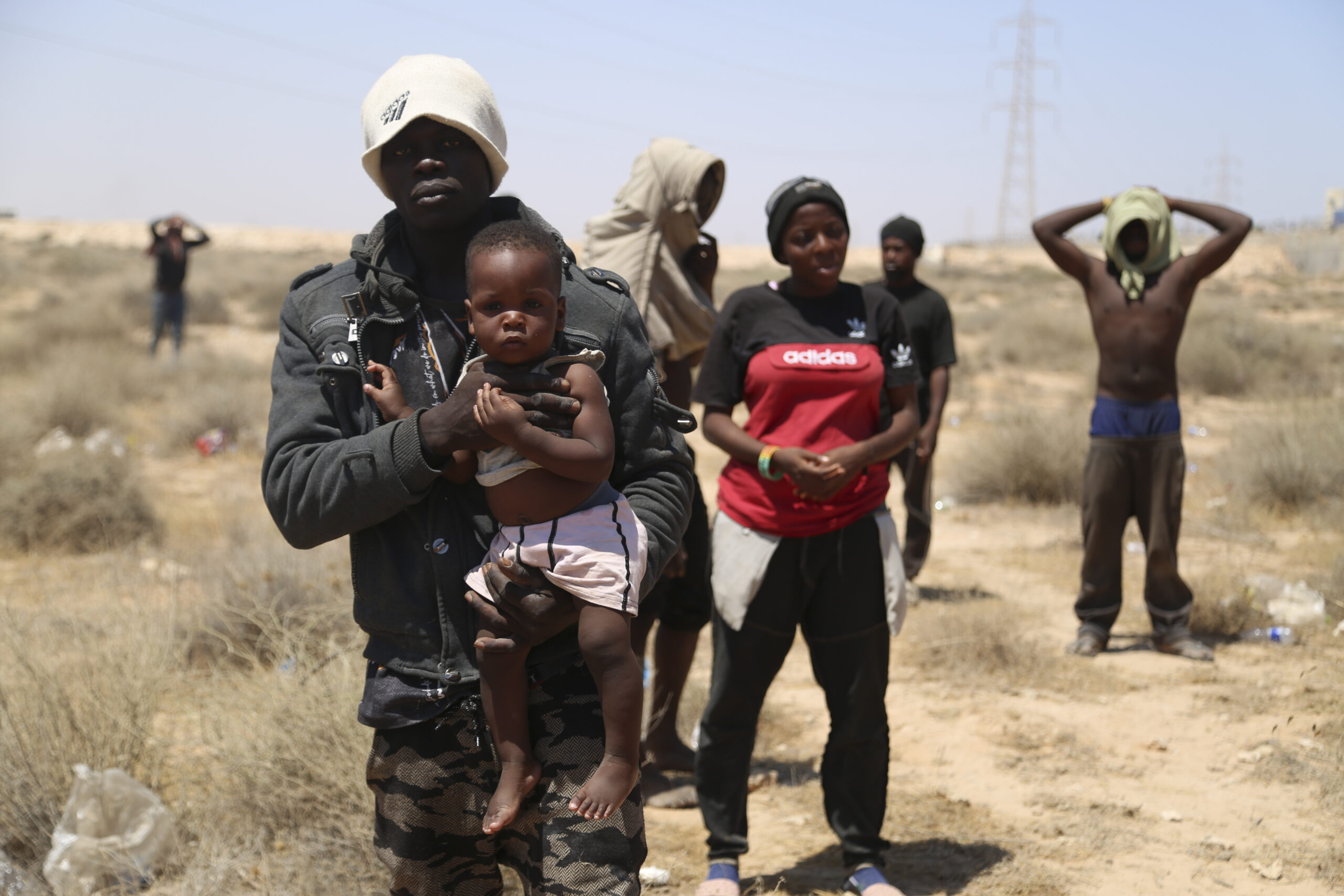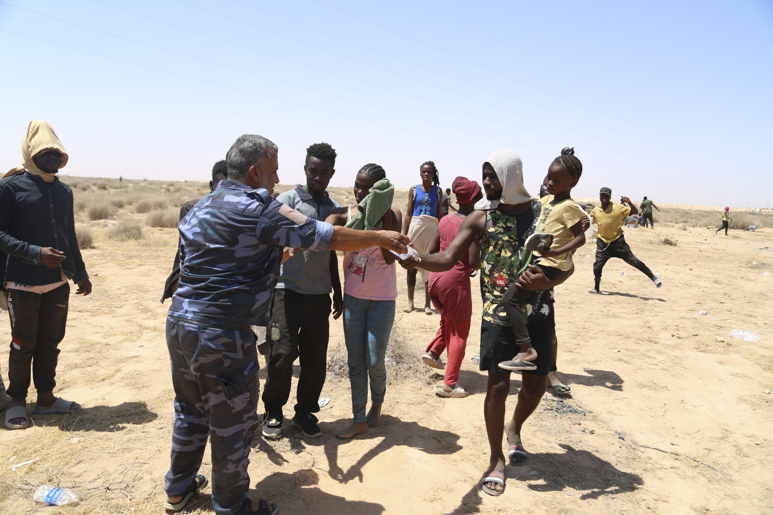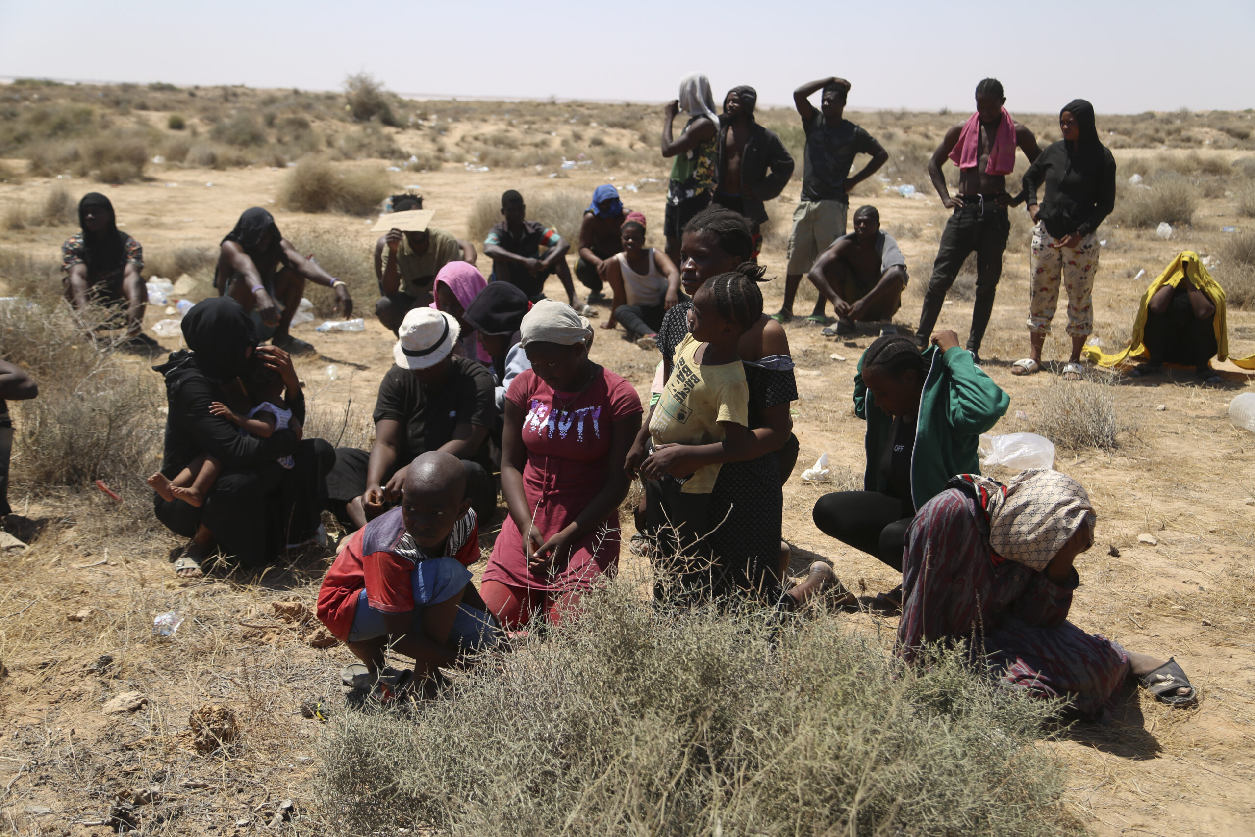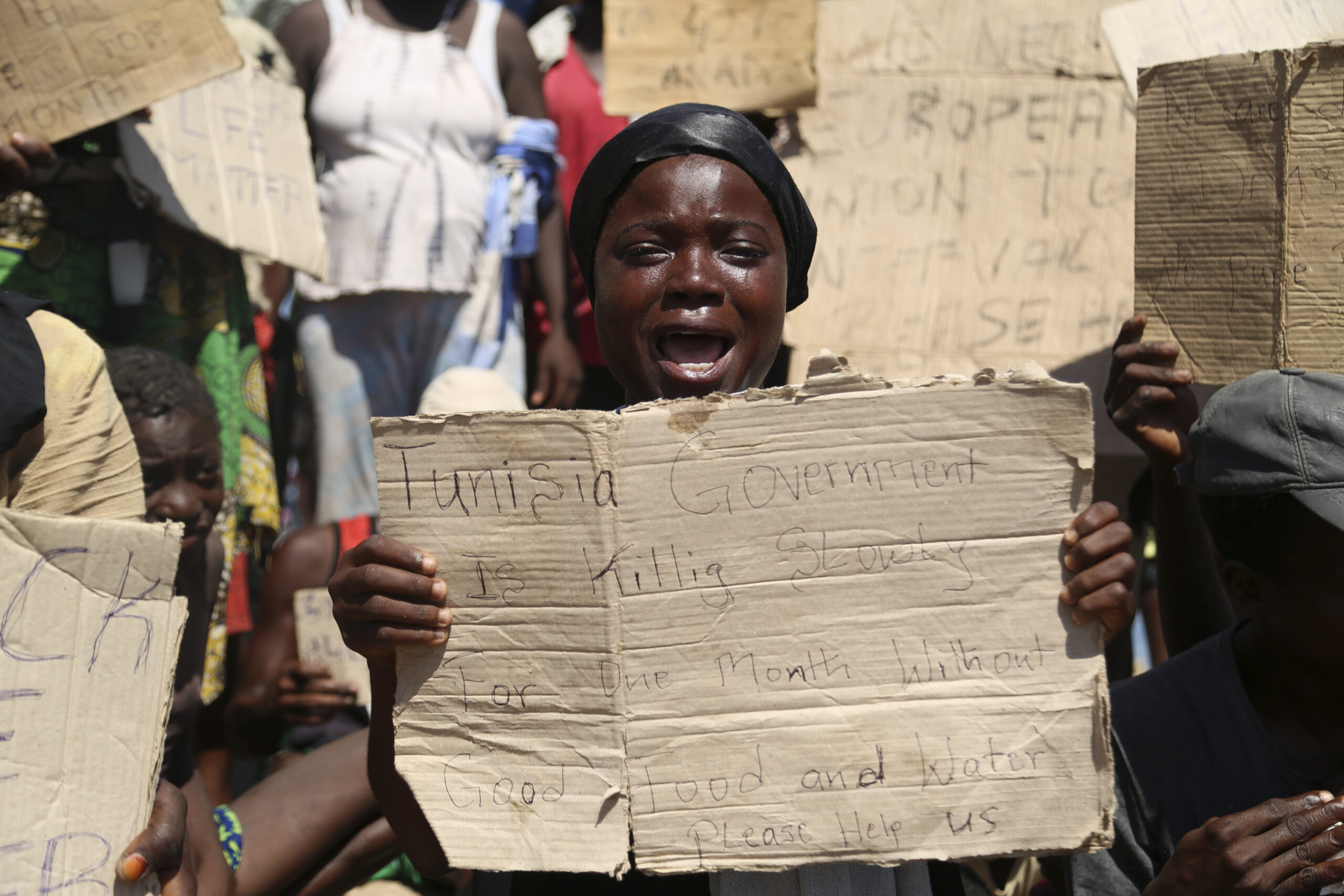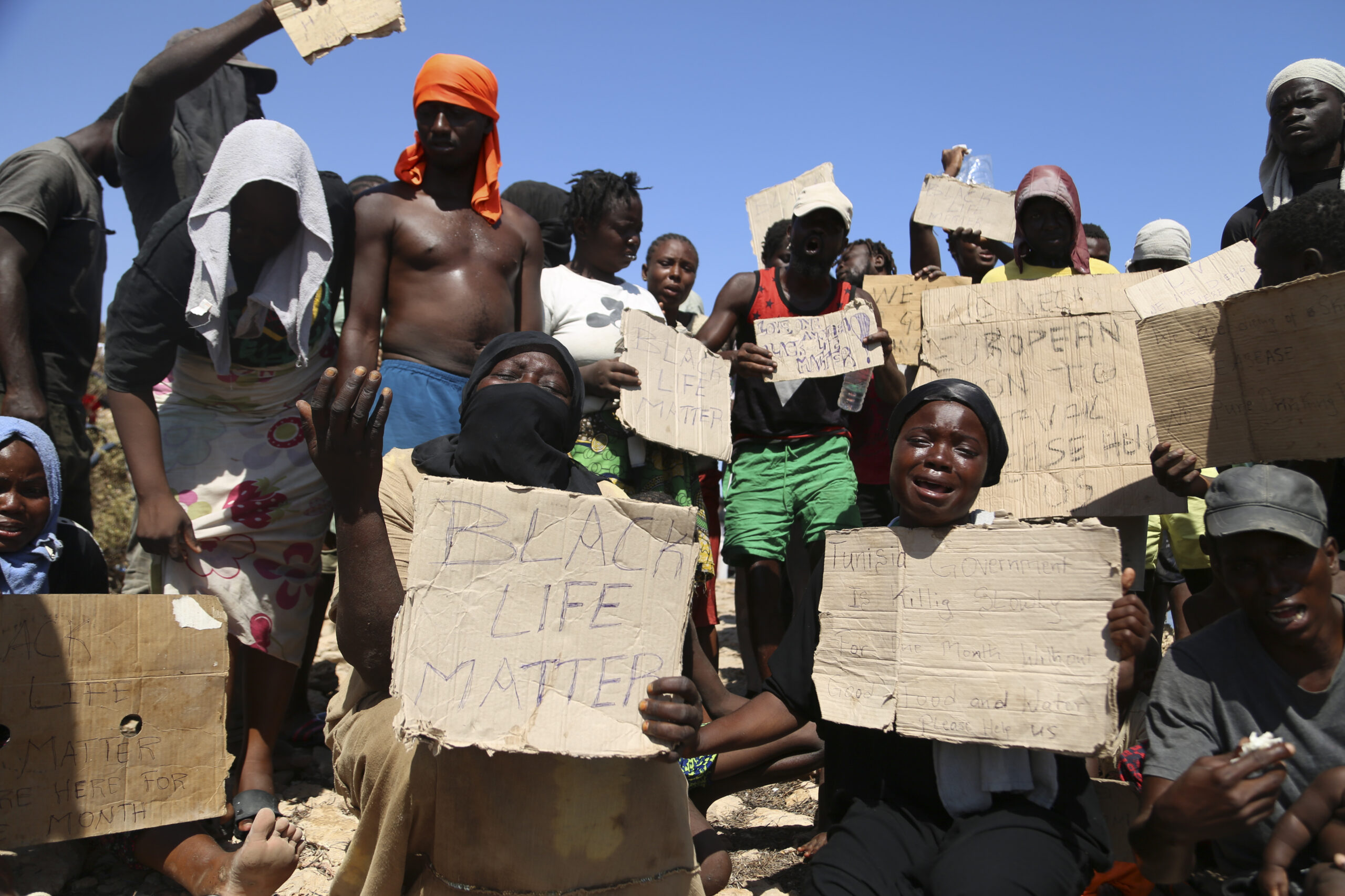 Spentisi i riflettori mediatici sul caso della madre morta di sete e stenti con la figlia di cinque anni al confine tra Libia e Tunisia, non si è però spenta la situazione emergenziale: un numero imprecisato (nella misura in cui non è mai stato effettuato un censimento propriamente detto) di persone si trova infatti ancora nella zona, dove le autorità tunisine avrebbero fatto letteralmente abbandonare senza acqua né ripari centinaia (forse migliaia) di migranti subsahariani senza acqua né ripari. Solo la polizia libica, almeno stando alle foto, avrebbe distribuito bottiglie d’acqua. Stretti tra le forze di sicurezza tunisine da un lato e quelle libiche dall’altro, alcune di queste persone hanno messo in scena una vera e propria disperata protesta, confidando che grazie alle foto dei reporter questa potesse arrivare agli occhi del mondo. Tra di loro anche diverse donne e bambini. “siamo uomini, non animali”, si legge in uno dei cartelli; in un altro “Balck lives matter”, facendo riferimento al noto movimento americano contro la violenza sugli afroamericani da parte della polizia. In questi giorni d’estate, non dimentichiamoci del grido che sale d’all’Africa. (AP Photo/Yousef Murad)