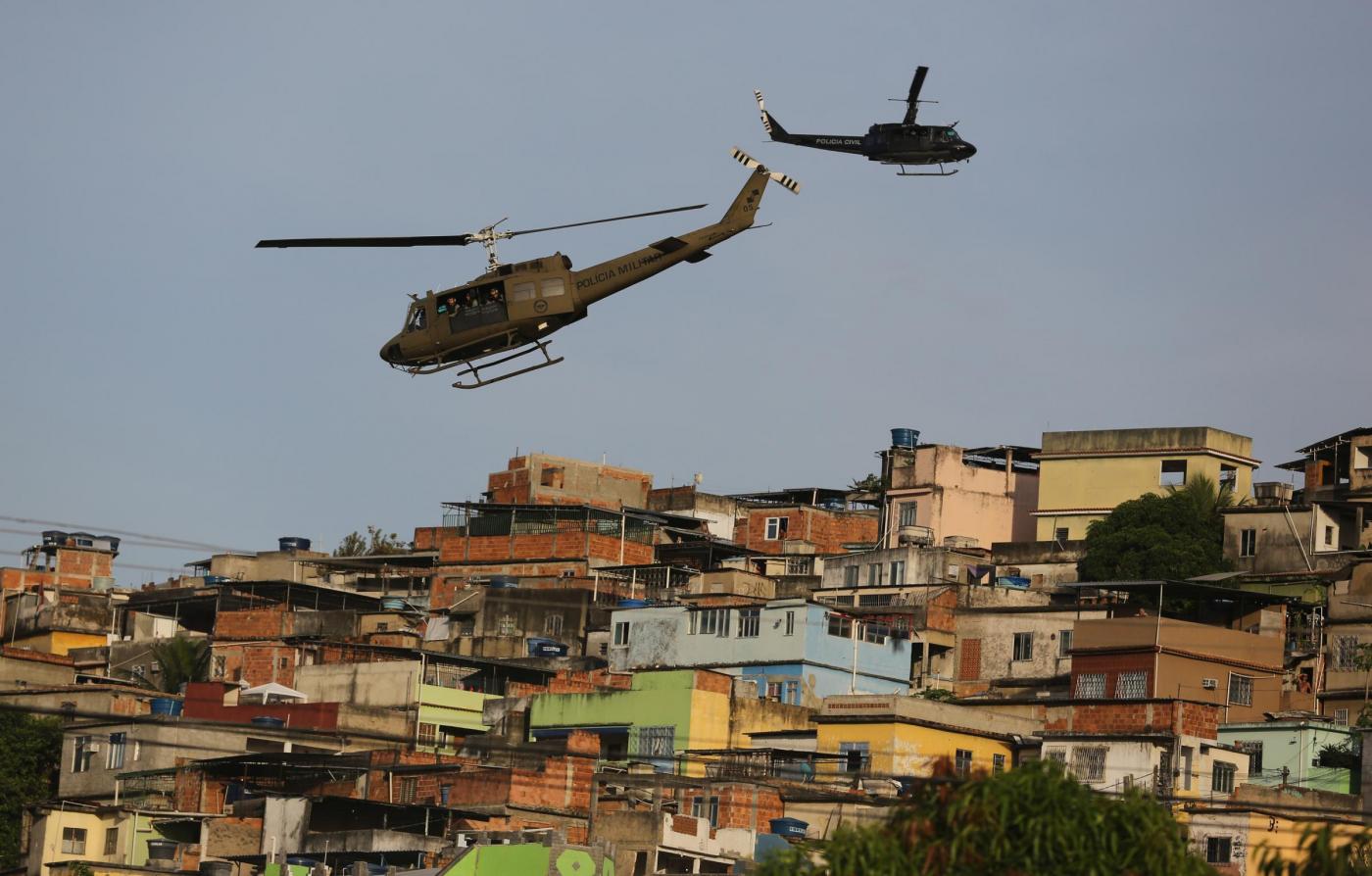 Rio de Janeiro, Brasile, elicotteri delle forze dell'ordine sorvolano le favelas di Mare, zona adiacente all'aeroporto, durante una retata contro le bande di narcotrafficanti che dominano il quartiere.