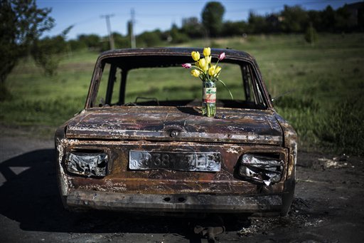 Slovyansk, Ucraina, un mazzo di fiori è stato deposto su una macchina data alle fiamme durante gli scontri tra esercito ucraino e filorussi.