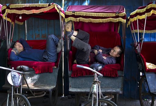 Pechino, Cina, due giovani conducenti si riposano adagiati sui risciò.