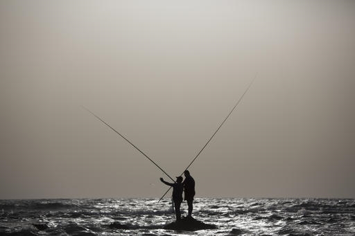 A Michmoret, Israele, due pescatori gettano la rete per la pesca in mare.