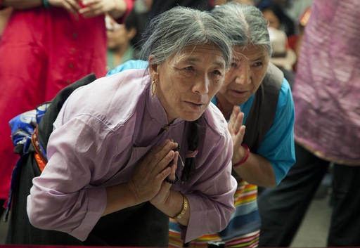 A Dharmsala, India, esuli tibetani salutano il Dalai Lama, loro leader spirituale.