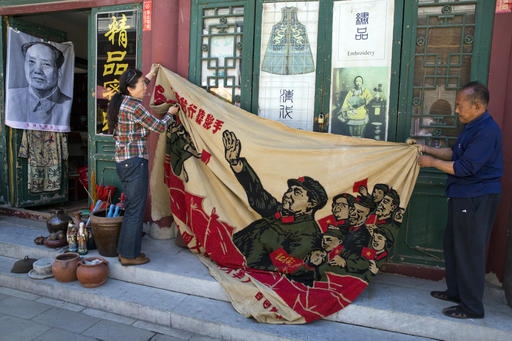 A Pechino, Cina, uno striscione raffigura l'ex leader comunista Mao Zedong, che 50 anni fa promosse la Rivoluzione culturale, per riaffermare l'ortodossia marxista (foto Ap).