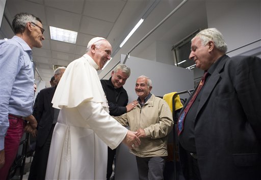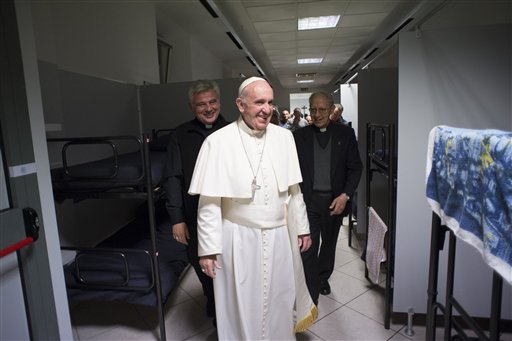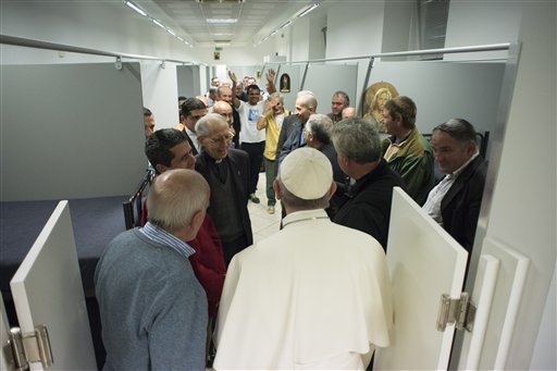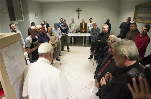 Francesco, lo scorso giovedì, dopo i lavori del Sinodo, si è recato a far visita a una trentina di senza fissa dimora ospitati presso il dormitorio che porta il nome di "Dono di misericordia", nei pressi dell'ospedale Santo Spirito, che è stato aperto il 7 ottobre. Durate la mezz'ora trascorsa coi senzatetto, ha voluto salutare ciascuno e ascoltare le loro storie. Un momento di grande commozione per una visita assolutamente a sorpresa. (foto Ap)