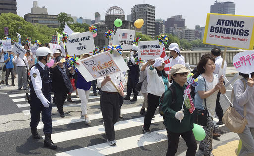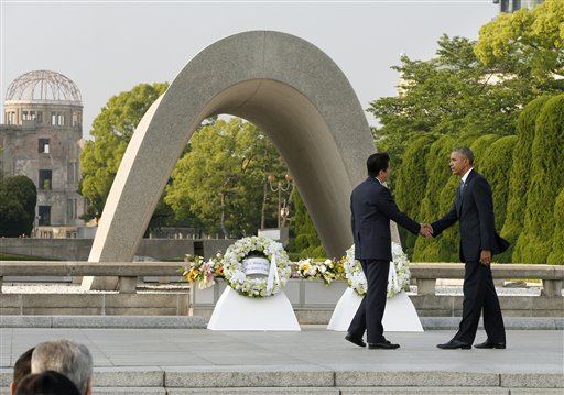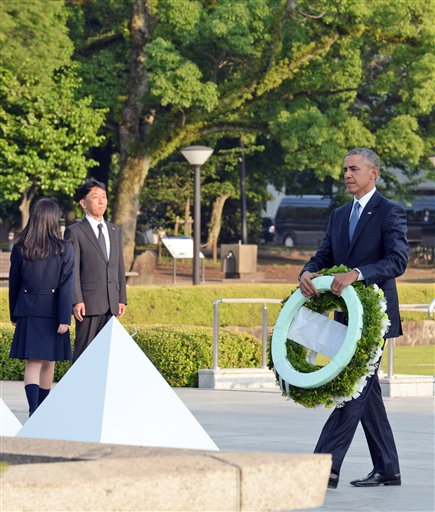 È la prima volta che un presidente statunitense in carica visita la città rasa al suolo dalla bomba atomica di 71 anni fa lanciata proprio dagli americani. «La guerra nucleare ha raggiunto qui il suo picco peggiore», ha detto Obama, che poco prima ha deposto una corona di fiori, a suo nome, sul Memoriale della Pace. (foto Ap)