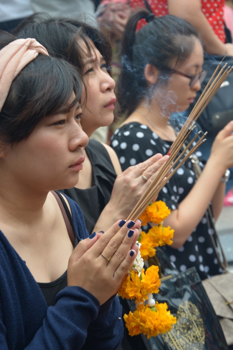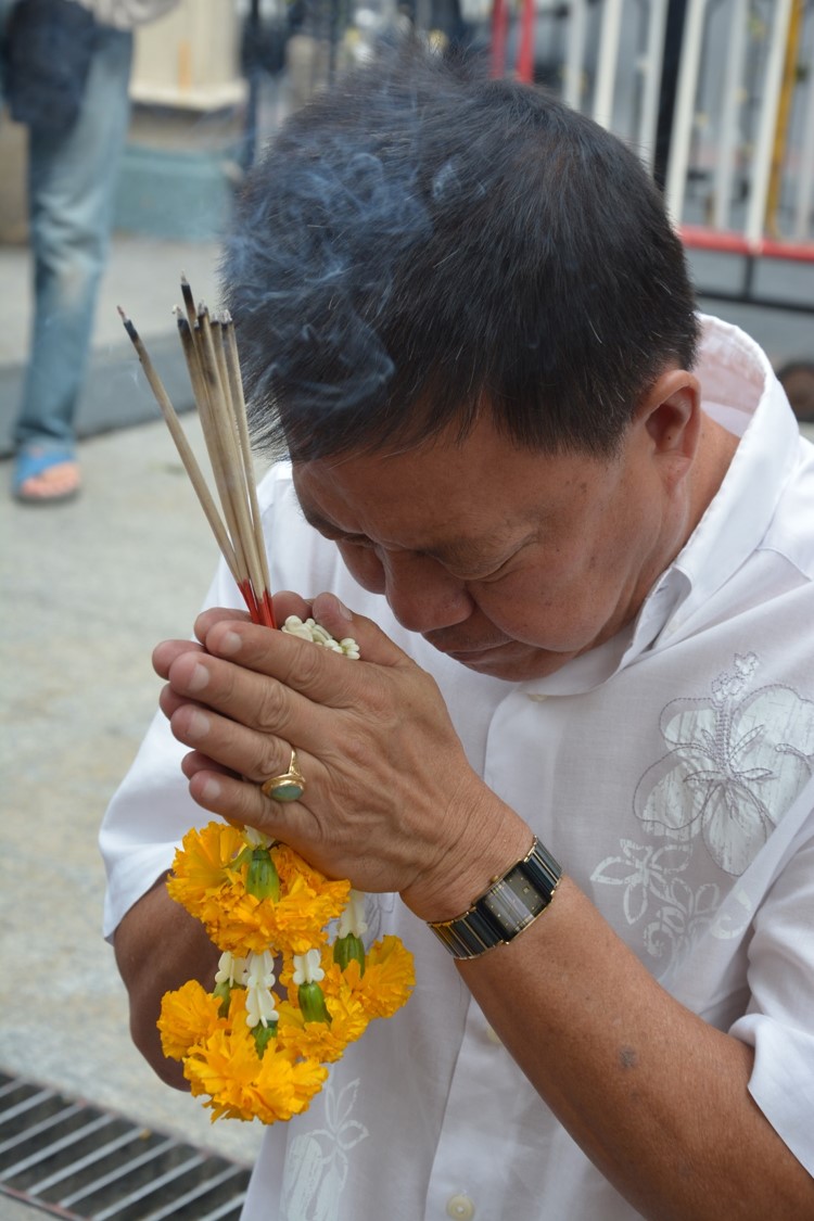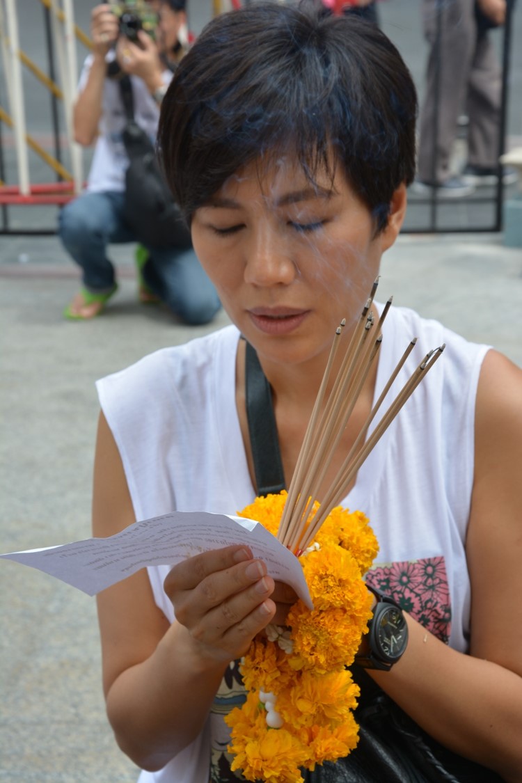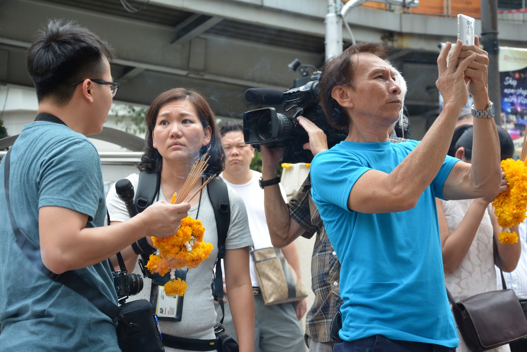 Bangkok, ore 10:00 del mattino di domenica 23 Agosto: mi sono fatto lasciare dal taxi vicino al tempio di Erawan, dove pochi giorni è avvenuto l’attentato. Mentre mi avvicinavo a piedi, piano piano le mie gambe hanno iniziato a tremare: una senzione provata poche volte nella vita. Ho dovuto fermarmi ed appoggiarmi ad un palo. Ho sentito la paura dentro mentre arrivavo al luogo del terribile attentato. Ho proseguito dopo pochi secondi di sosta e mi sono trovato sopra il cratere della bomba, circondato da centinaia di persone in preghiera: chi piangeva, chi offriva incenso, fiori, chi si nascondeva il viso per la commozione. Ho avuto la forte sensazione come d’essere sulla cima di una montagna, dove tutti vorrebbero essere in questo momento: ho sentito l‘umanità presente in quel punto della terra, in quel luogo dove tanta gente è stata letteralmente smembrata; dove hanno perso la vita anche bambini, gente innocente, immolata dalla follia dell’uomo che non ha più paura, nemmeno di un dio: ho sentito un senso di sacro sotto i miei piedi, sotto quel cratere ormai ricoperto di cemento fresco. Davanti a me, sull’altarino, lui, il dio Brahma, colpito in volto; penso rappresenti ognuno di noi, colpito ‘dentro’ da questo attentato, da questa bomba terribile che s’è presa la vita di tanta gente; s’è presa il futuro di tante famiglie, la gioia di vivere e di voler far felice il mondo.