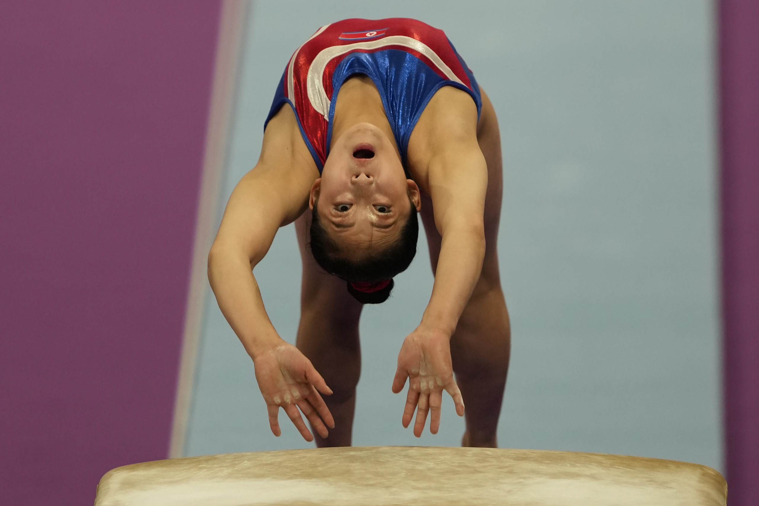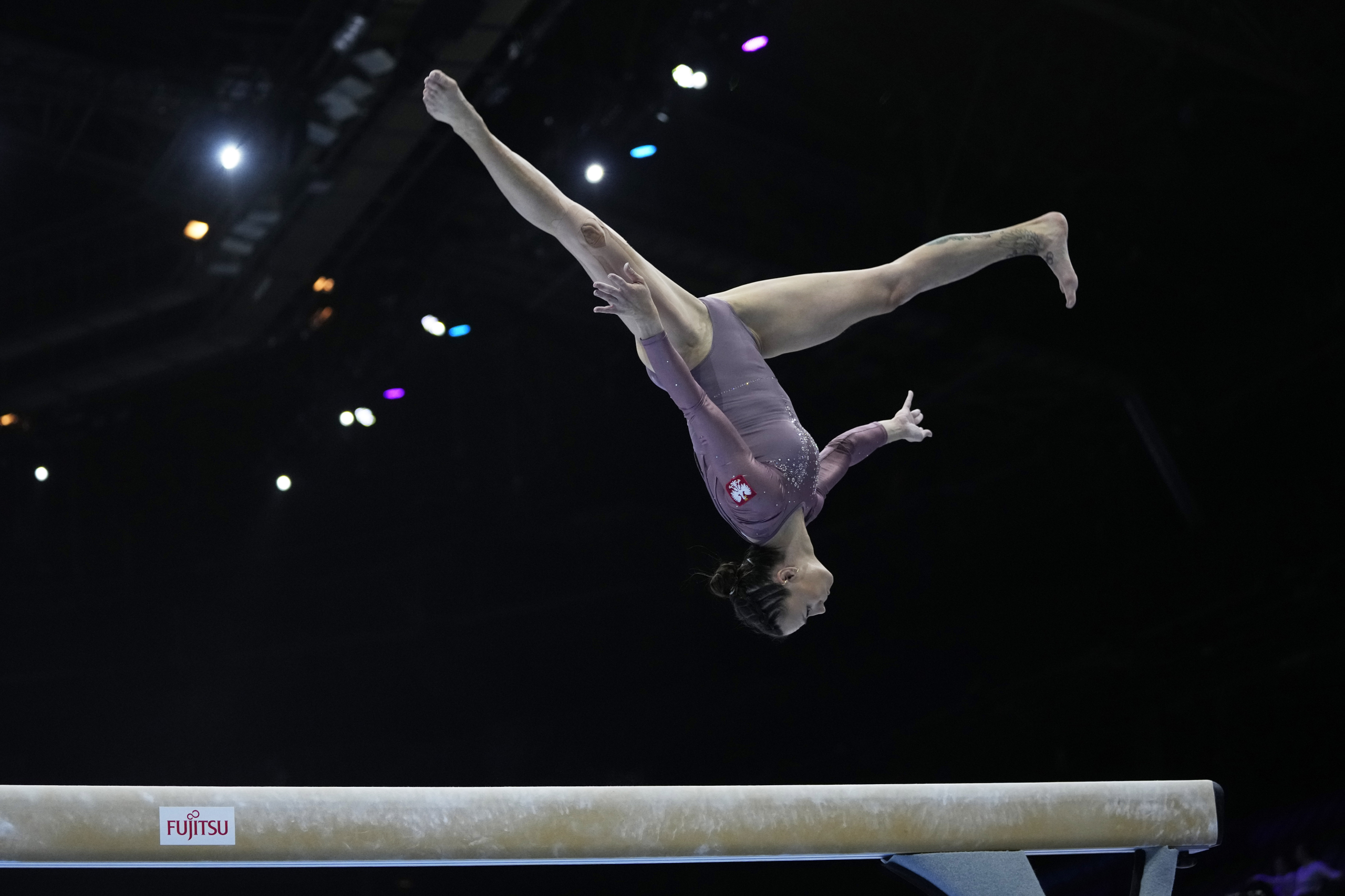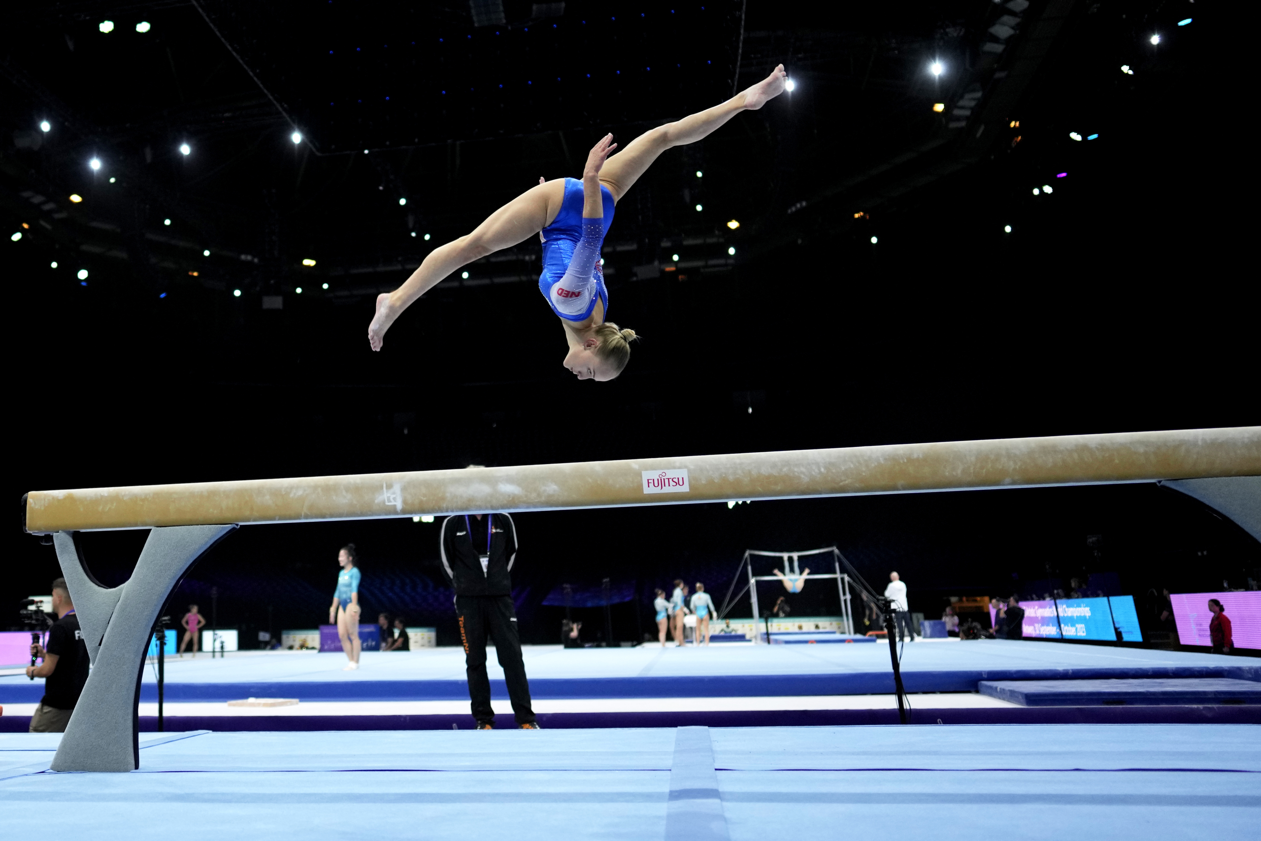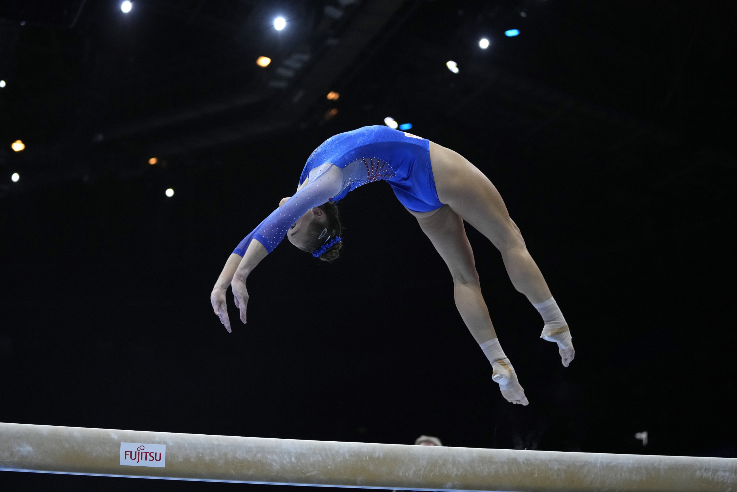 Sono in corso fino all’8 ottobre i mondiali di ginnastica artistica ad Anversa, in Belgio: e queste foto rendono bene le spettacolari evoluzioni tra parallele asimmetriche, volteggio, trave e corpo libero. Da segnalare il ritorno di Simone Biles, considerata una delle più grandi ginnaste di tutti i tempi, dopo il suo ritiro in piena olimpiade a Tokyo. (AP Photo/Virginia Mayo)