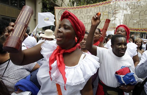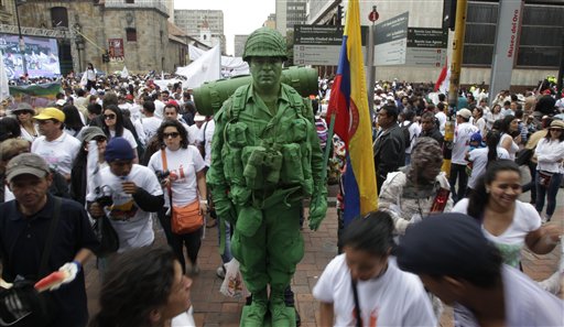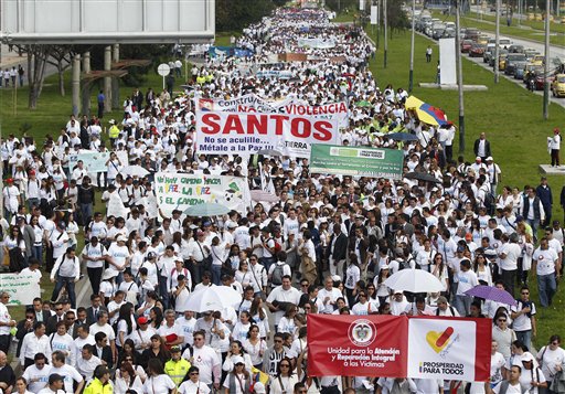 Le strade di Bogotà si sono riempite di migliaia di colombiani in marcia per sostenere il proseguimento dei colloqui di pace tra il governo e le Forze armate rivoluzionarie della Colombia (foto Ap).