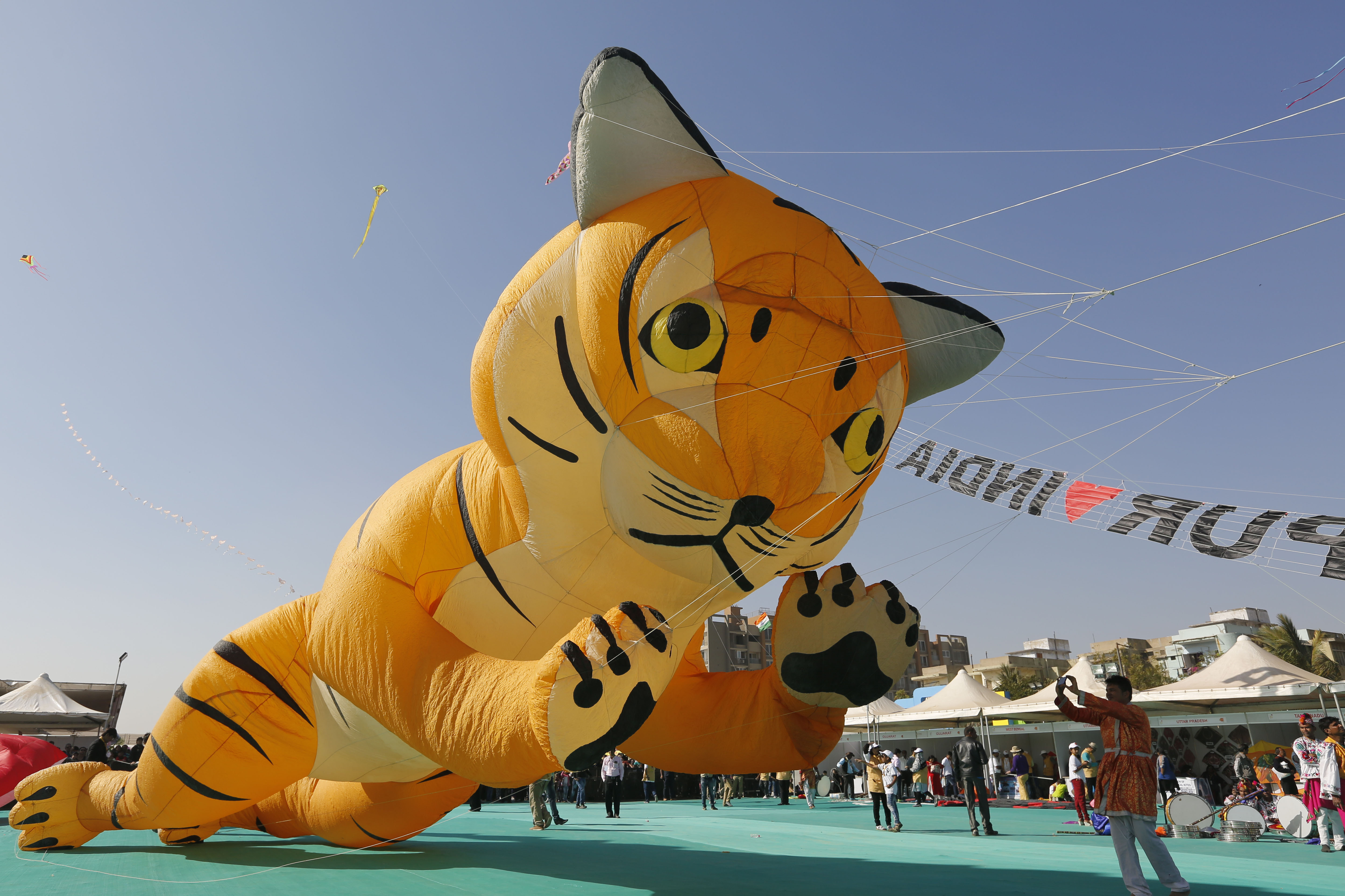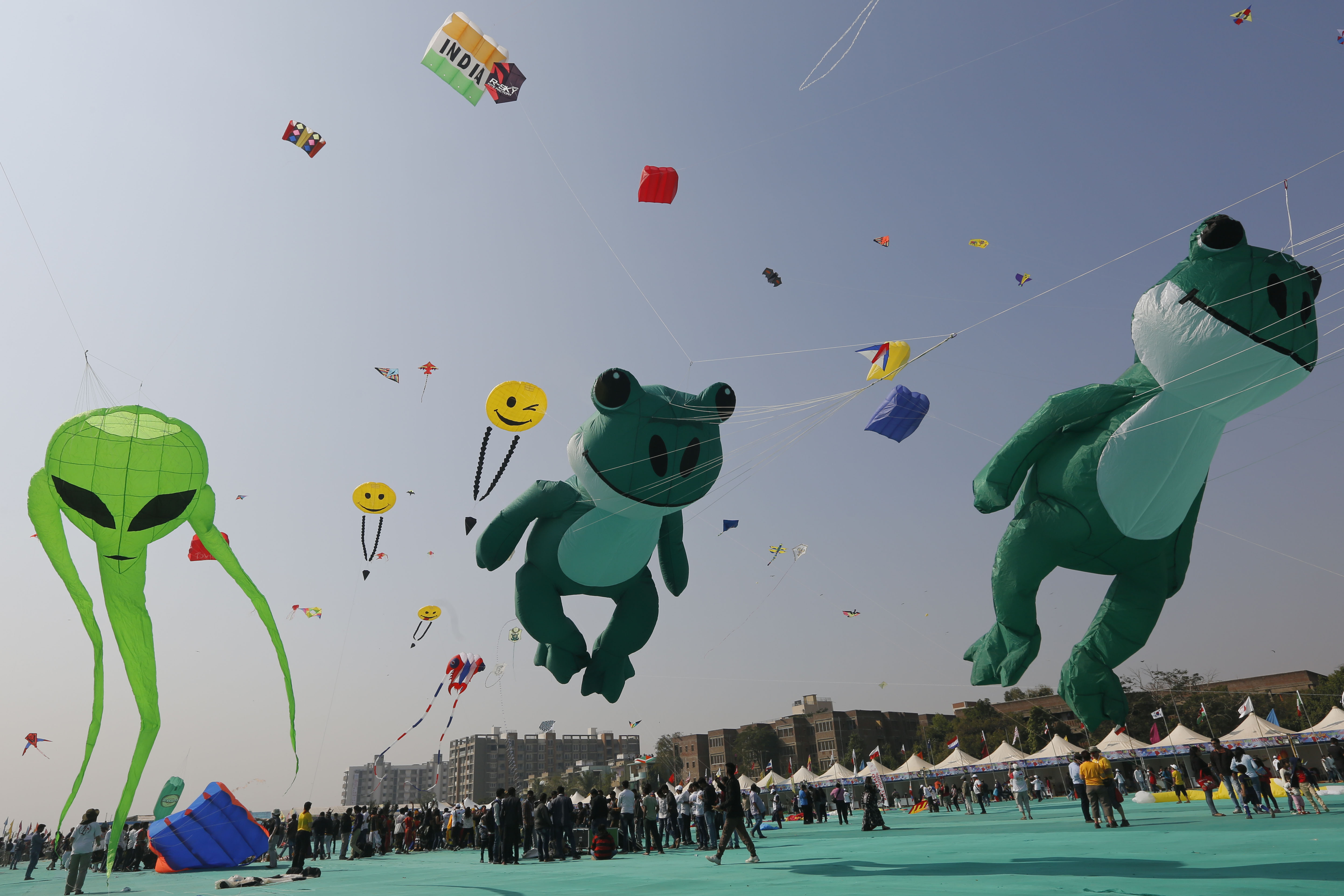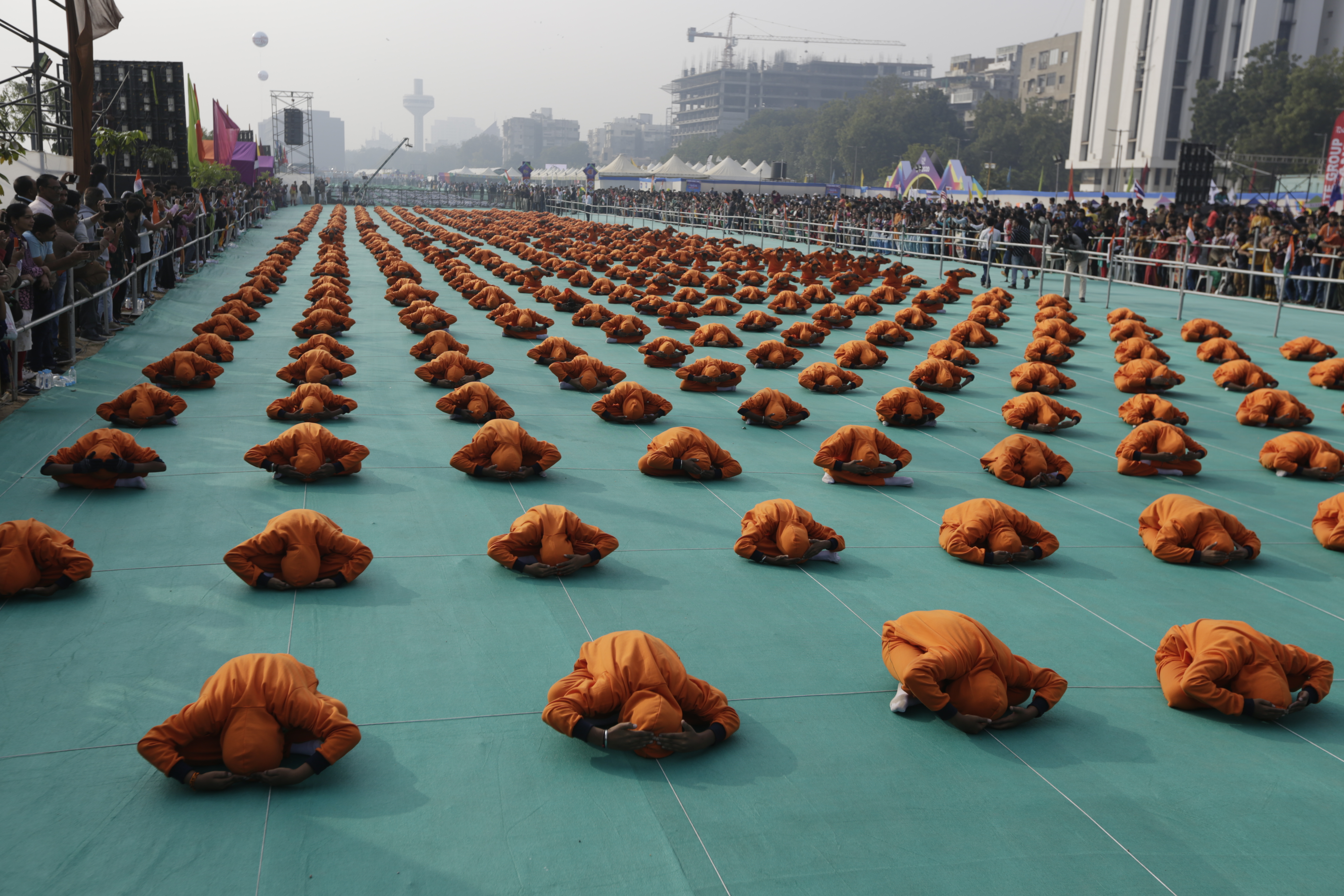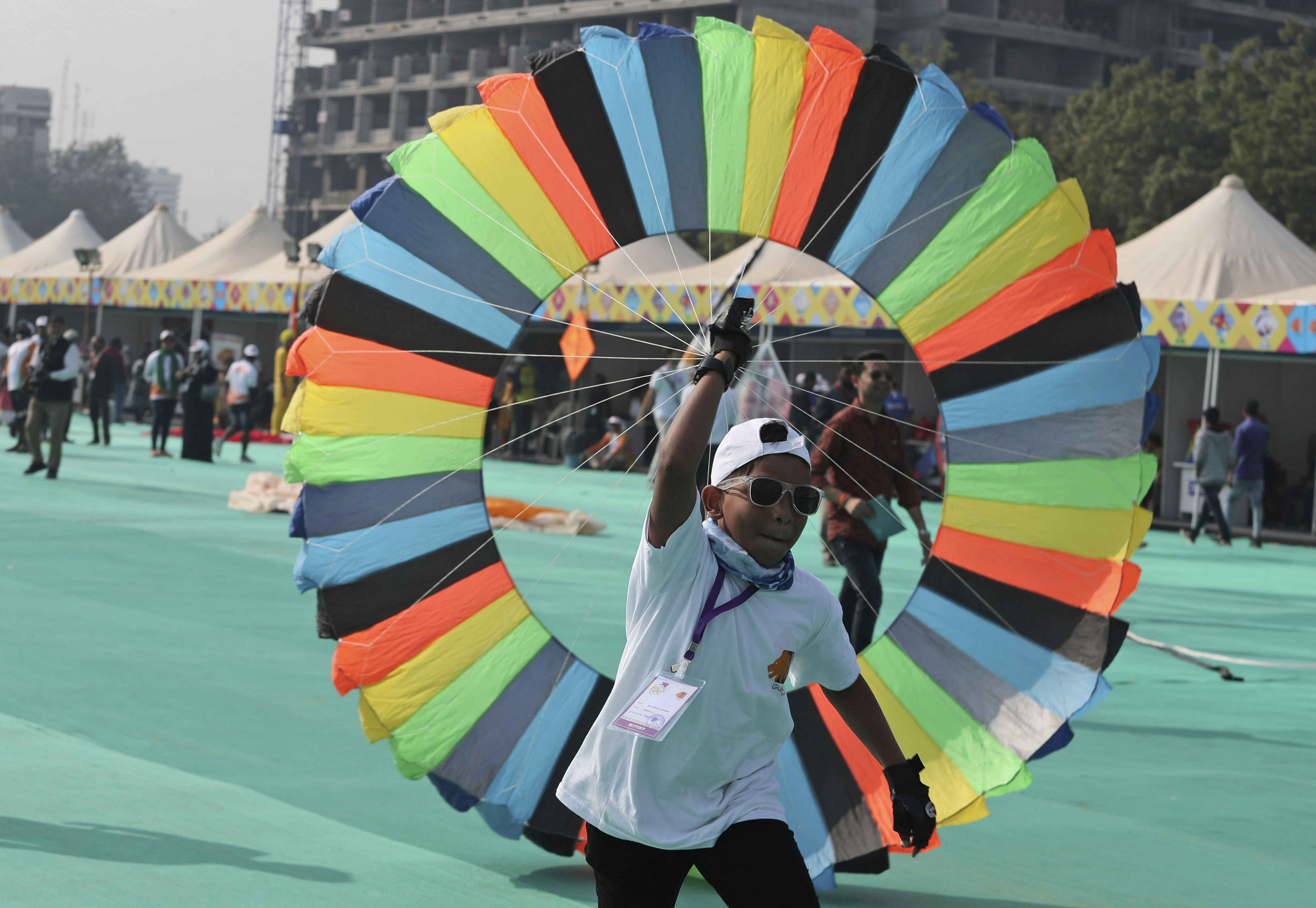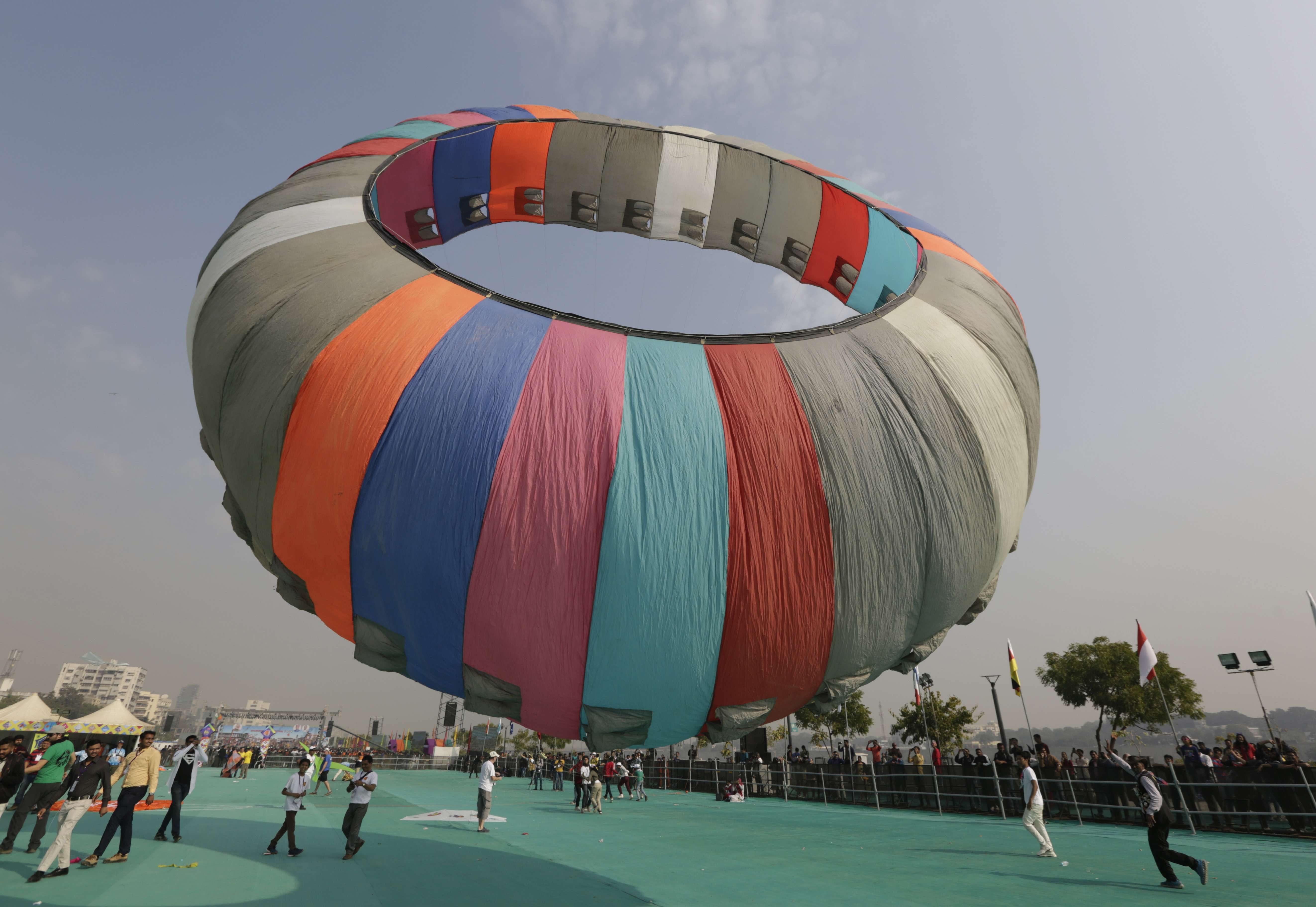 Come ogni anno, in questi giorni sul lungofiume Sabarmati ad Ahmadabad si svolge il festival degli aquiloni provenienti da tutta l’India, oltre che dall’estero. I bambini delle scuole indiane eseguono yoga durante l’inaugurazione del festival internazionale.