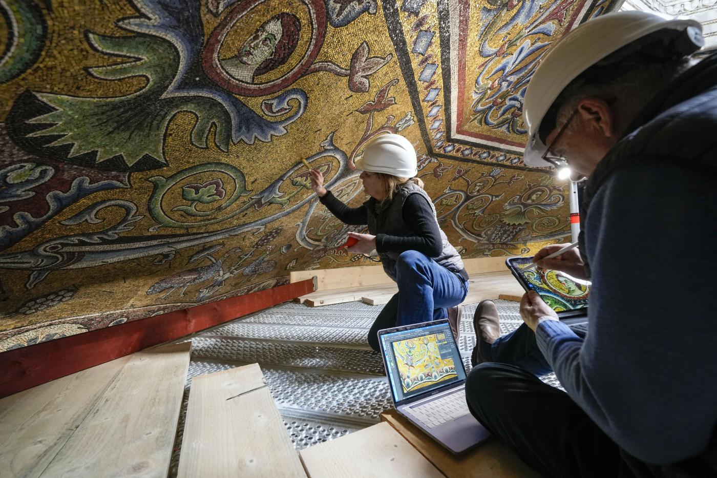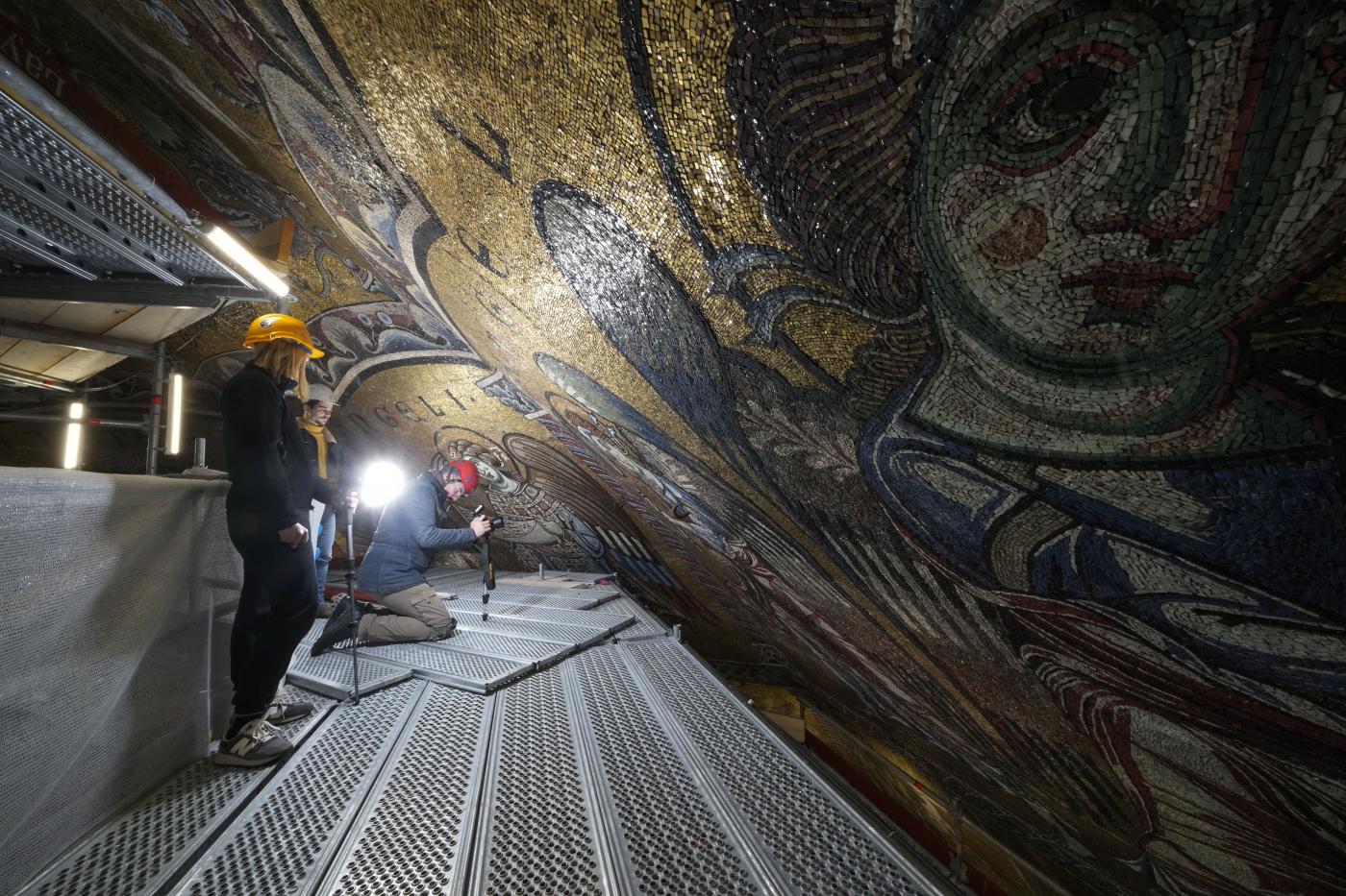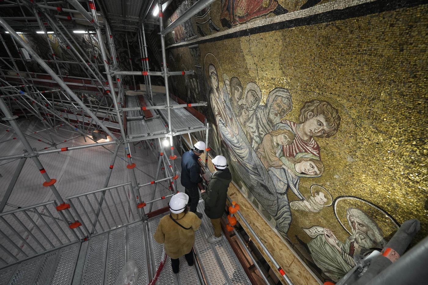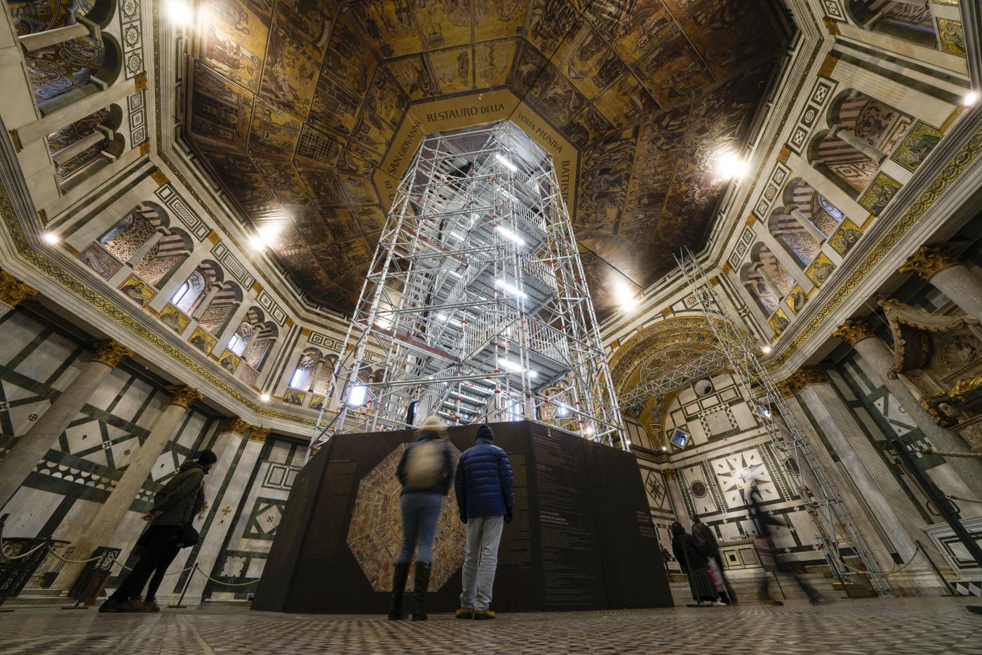 Le visite avranno inizio il 24 febbraio, prenotandosi sul sito dell’Opera di Santa Maria del Fiore, che ha commissionato e finanzia il cantiere e il restauro per un investimento di 10 milioni di euro. Dal 2014 aveva già restaurato l’esterno della chiesa e poi le pareti interne con i mosaici. In questi giorni inizieranno le indagini diagnostiche per verificare l’entità dei distacchi e del degrado delle tessere nonché lo stato di salute dei diversi materiali che compongono i supporti. (AP Photo/Andrew Medichini), Associated Press