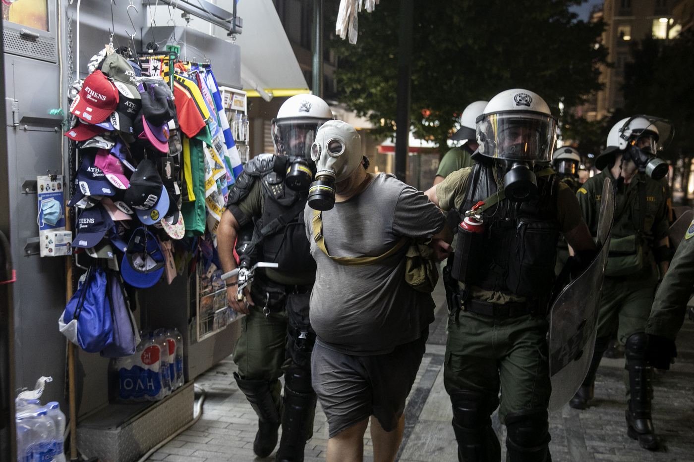 La polizia arresta un manifestante con una maschera anti-vaccino durante gli scontri intorno alla centrale piazza Syntagma, ad Atene, in Grecia. La polizia ha usato gas lacrimogeni per disperdere migliaia di manifestanti che si oppongono ai piani del governo per la vaccinazione obbligatoria e nuovi tipi di test e restrizioni per le persone che non sono vaccinate contro il COVID-19.