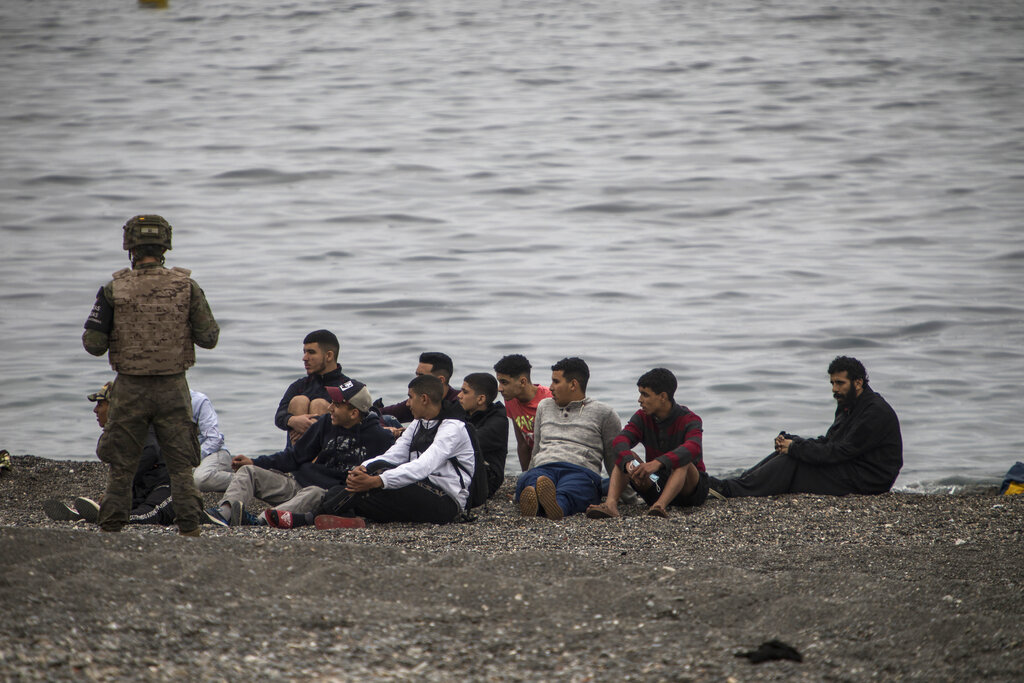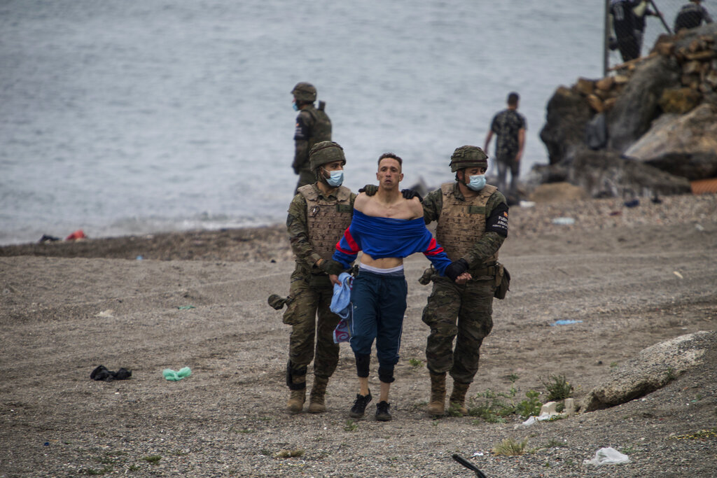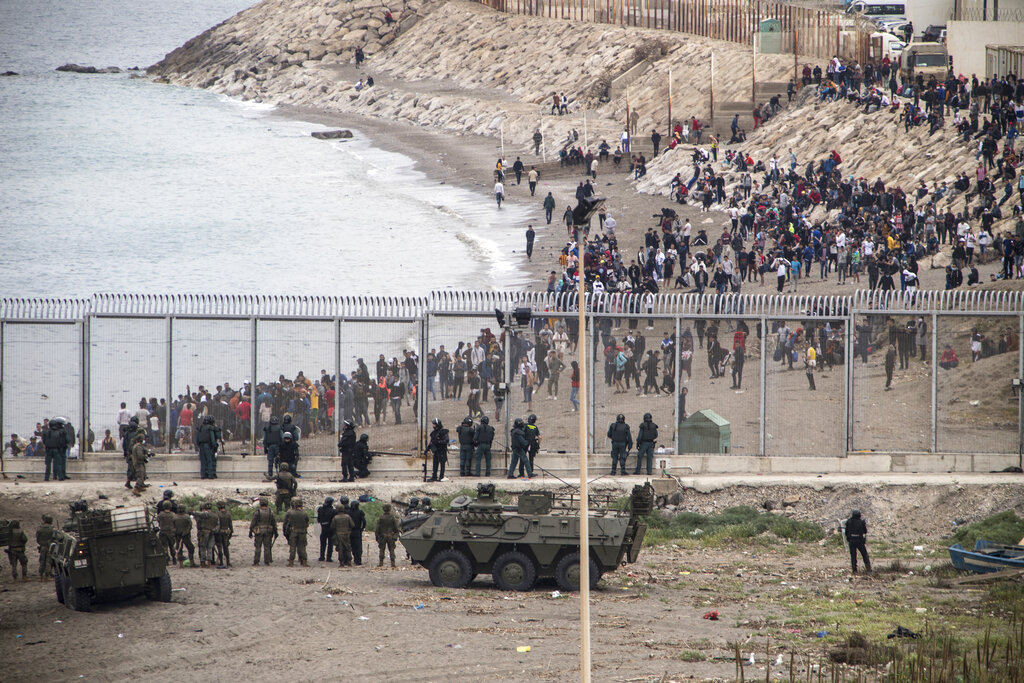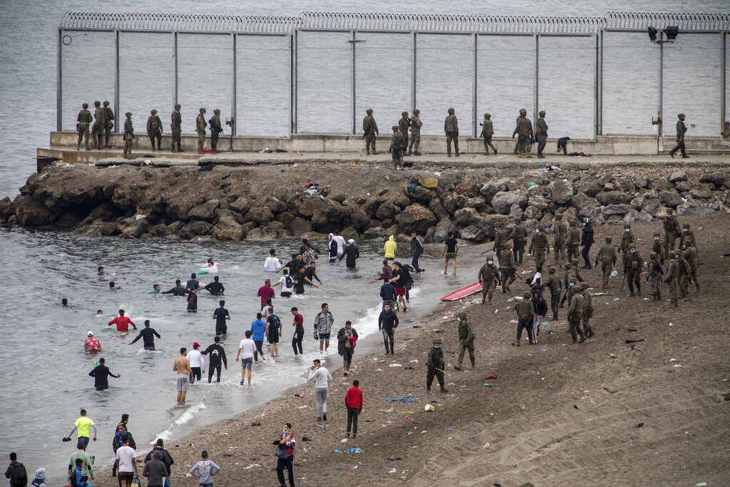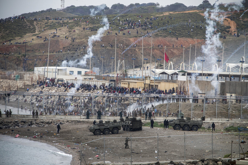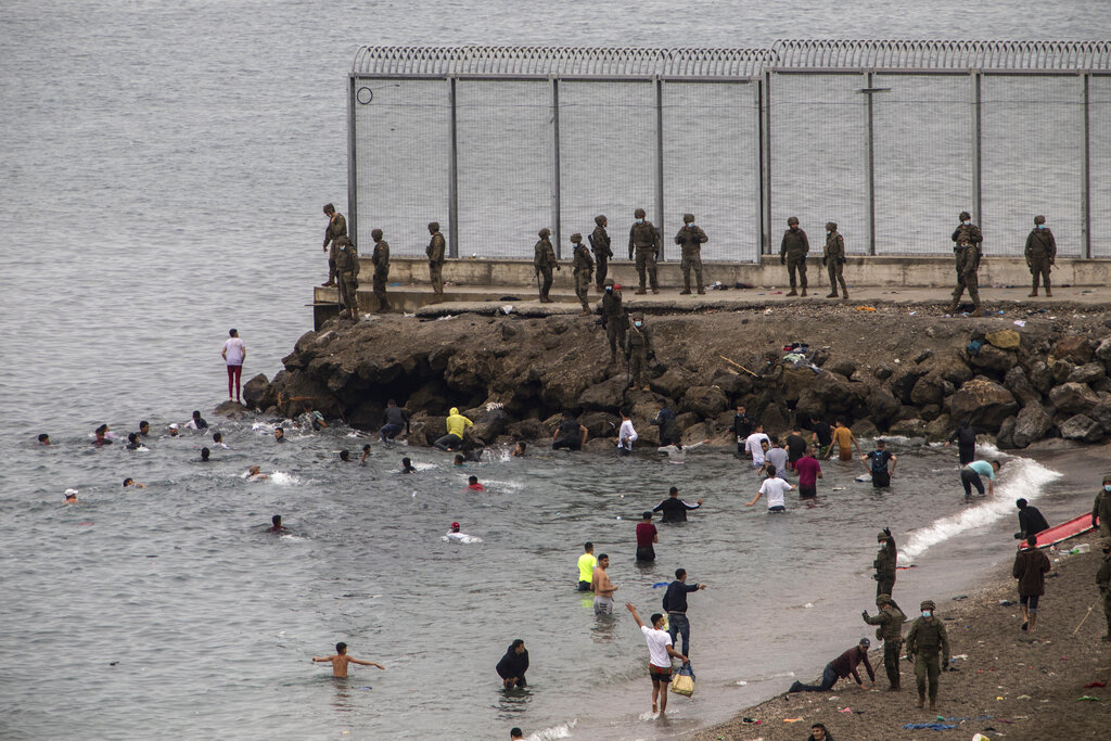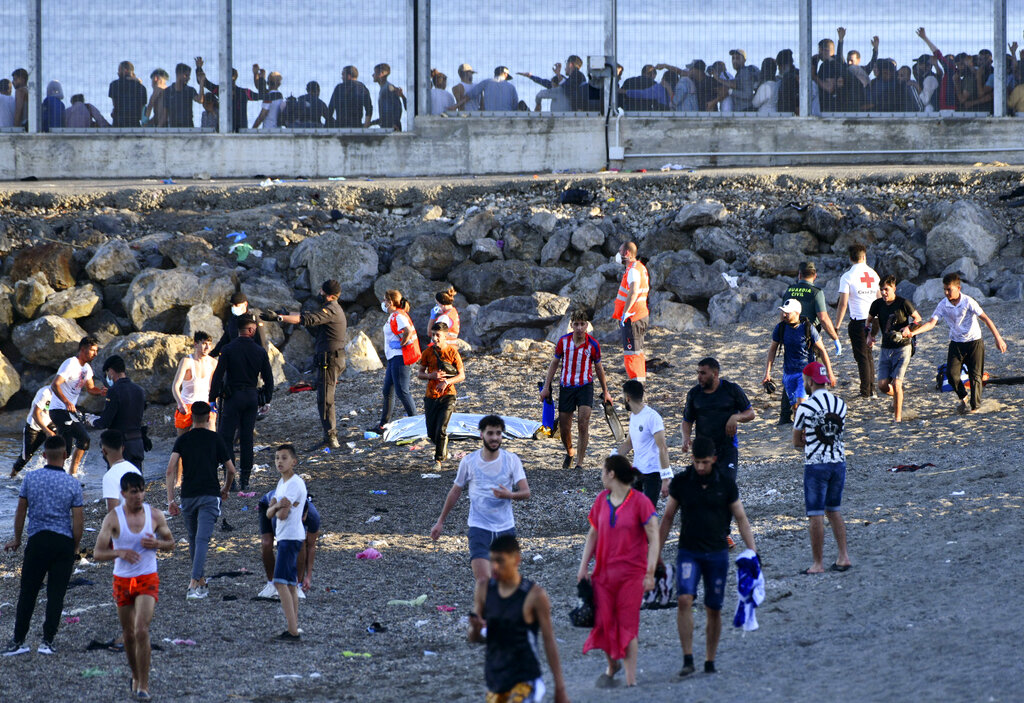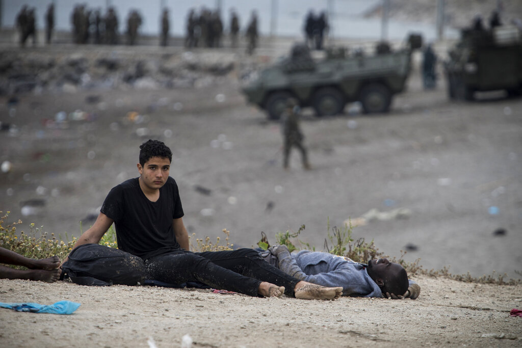L’esercito spagnolo e la Guardia Civile cercano di arginare l’ondata di profughi che si è riversata sul confine tra Marocco e Spagna, presso l’enclave spagnola di Ceuta. Ceuta, una città spagnola di 85 mila abitanti posta sulla costa dell’Africa settentrionale, affronta una crisi umanitaria senza precedenti, dopo che migliaia di marocchini hanno approfittato del controllo alle frontiere rilassato per passare, a nuoto o su barconi, dal loro paese al suolo europeo. Sembra che circa 6.000 persone abbiano già attraversato il confine, 1.500 di loro si presume siano adolescenti. Sembra che il controllo delle frontiere sia stato allentato dal Marocco per protesta contro l’asilo offerto dalla Spagna, per ragioni mediche, ad un leader del fronte rivoluzionario del Polisario (AP Photo / Javier Fergo)