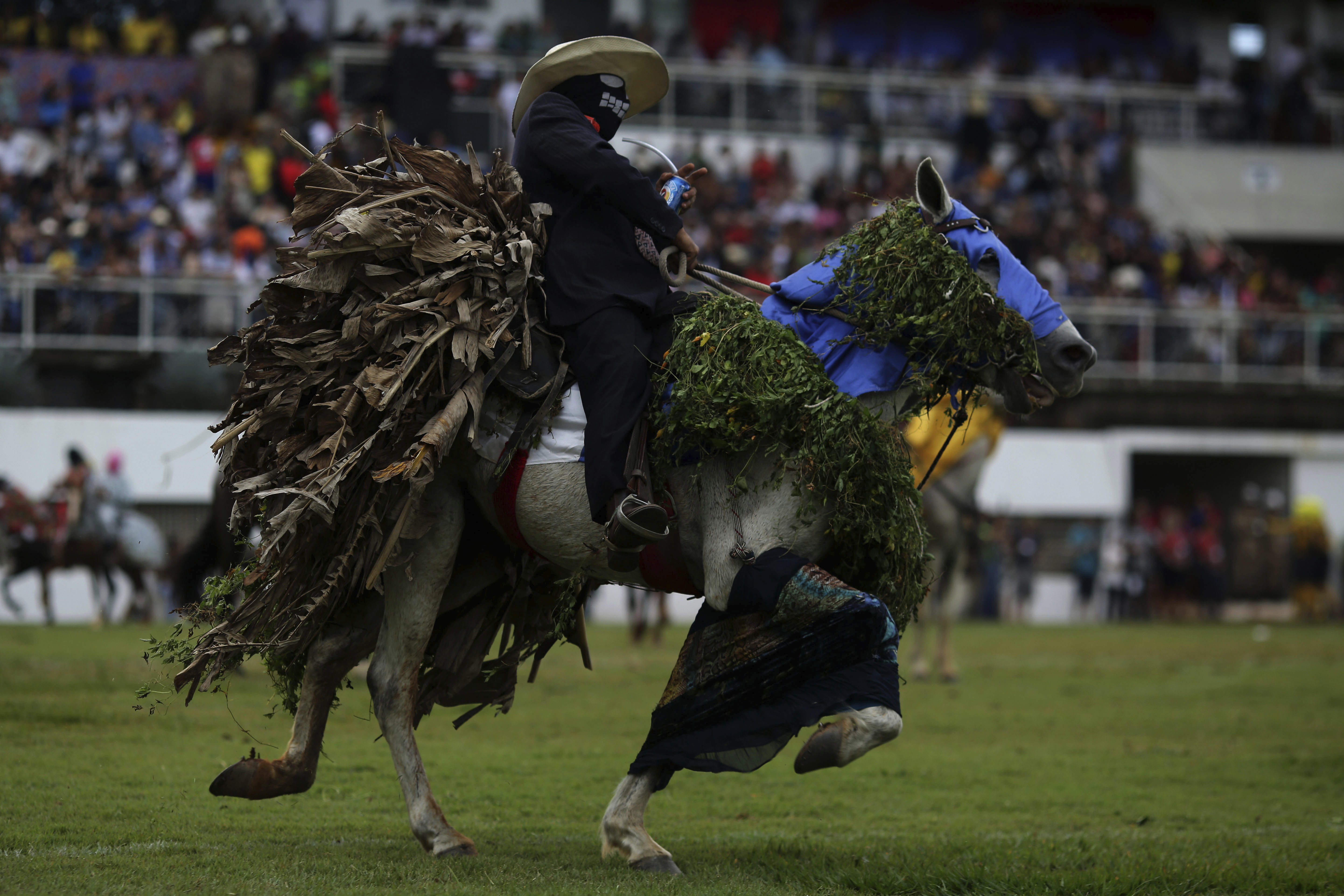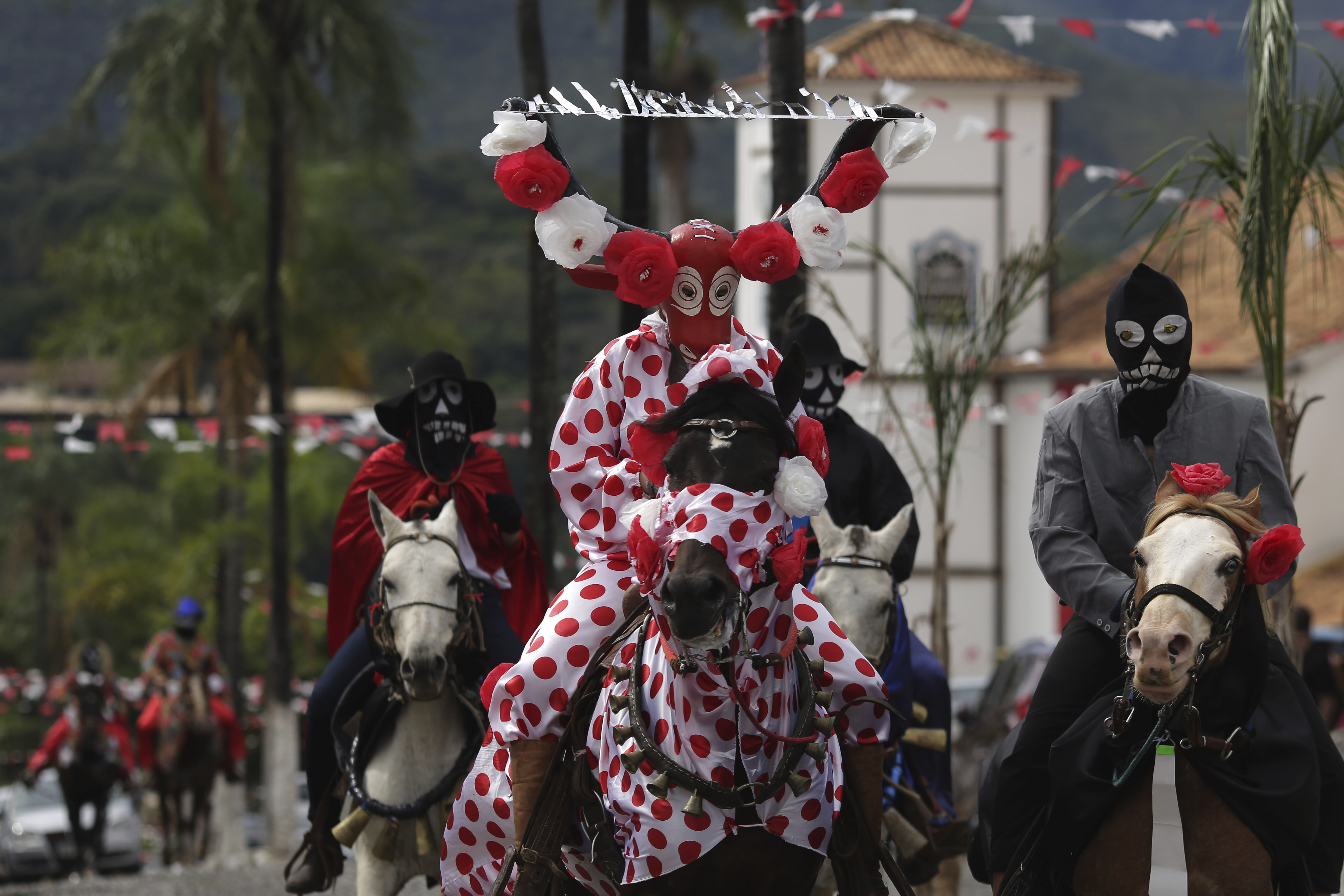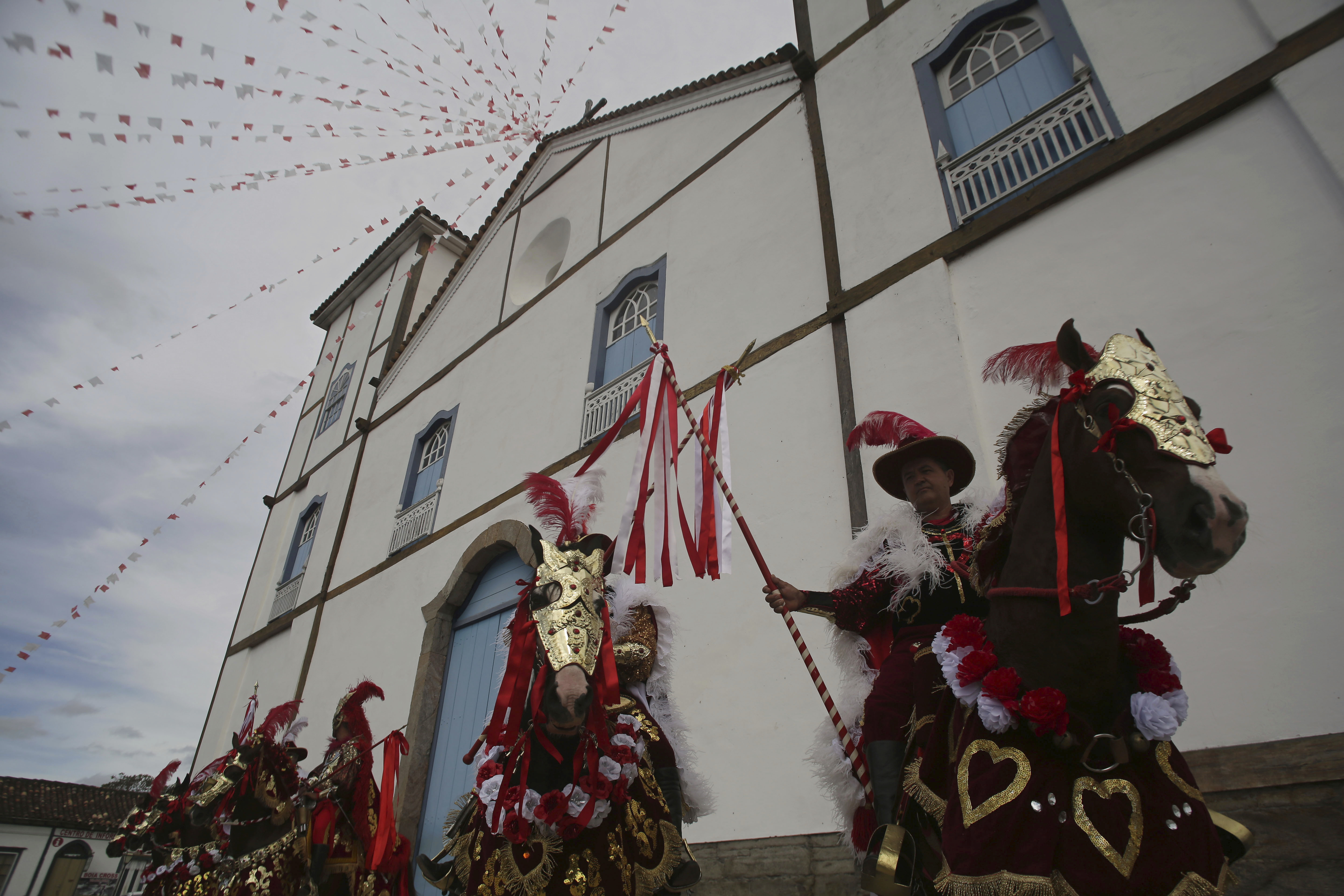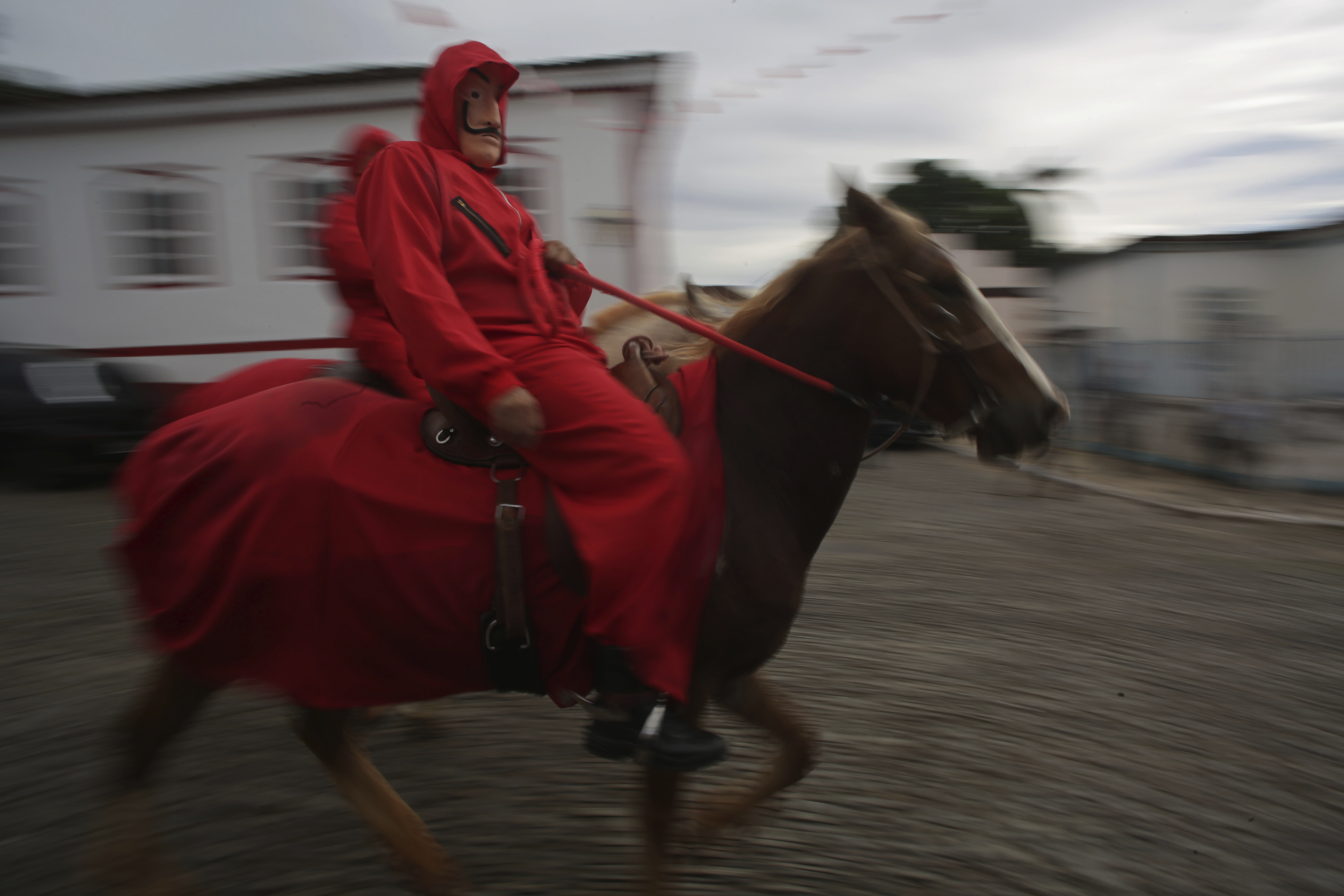 Corse dei cavalli, processioni, maschere e allegria nelle strade durante il festival “Cavalhadas” a Pirenopolis, nello stato di Goias, Brasile. Il festival di tre giorni è stato portato in Brasile nel 1800 da un sacerdote portoghese per celebrare lo “Spirito Santo” e commemorare la vittoria medievale dei cavalieri cristiani iberici sui Mori. (AP Photo / Eraldo Peres)