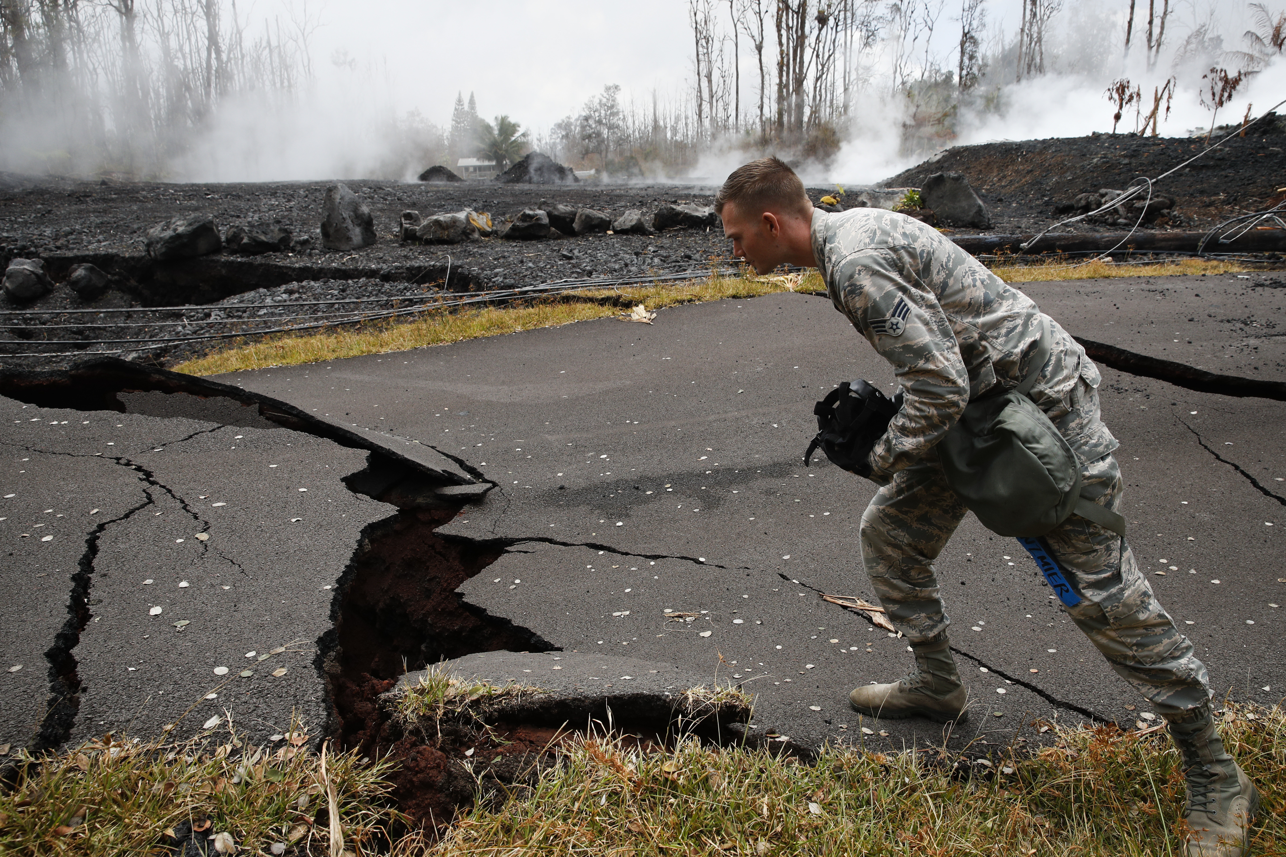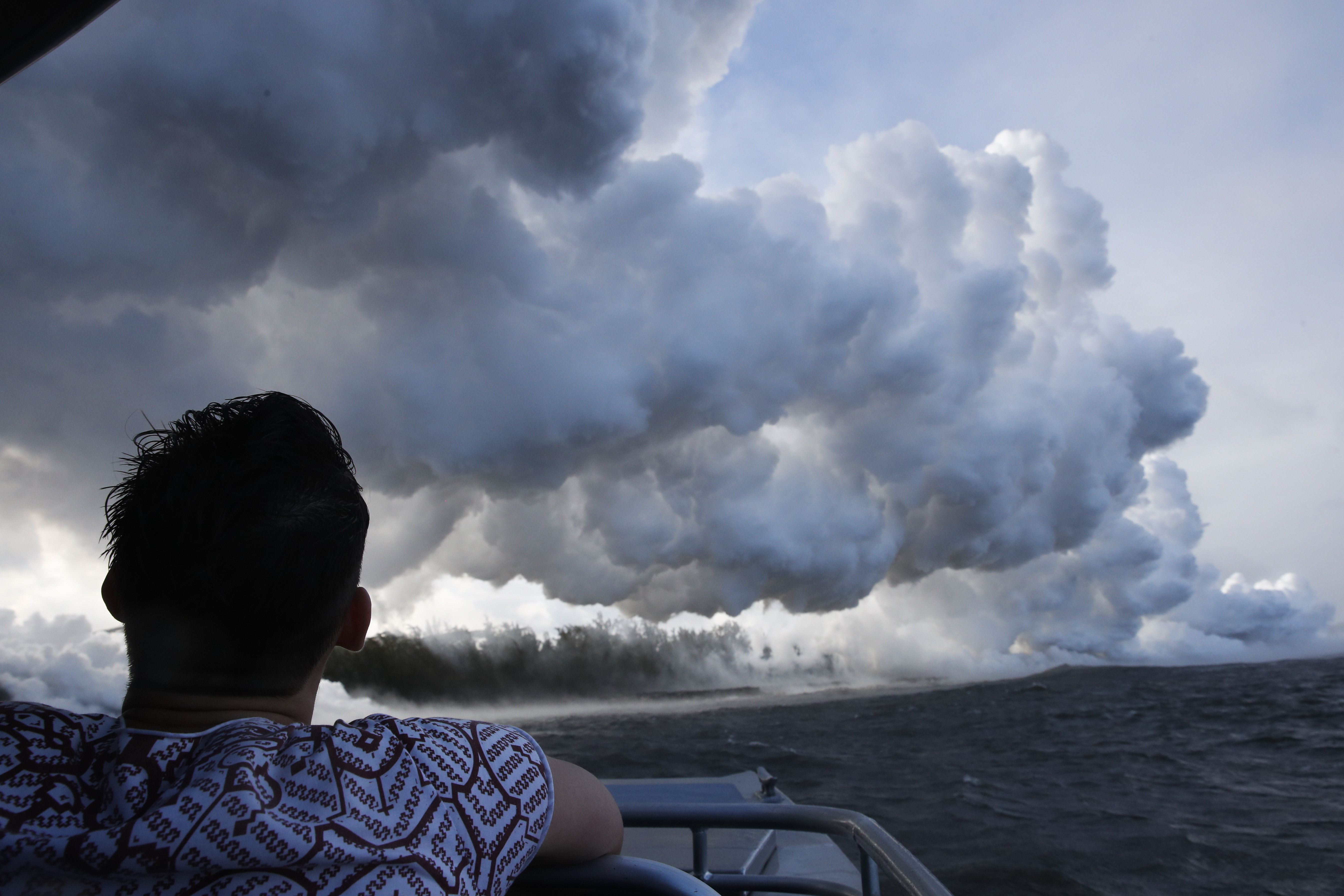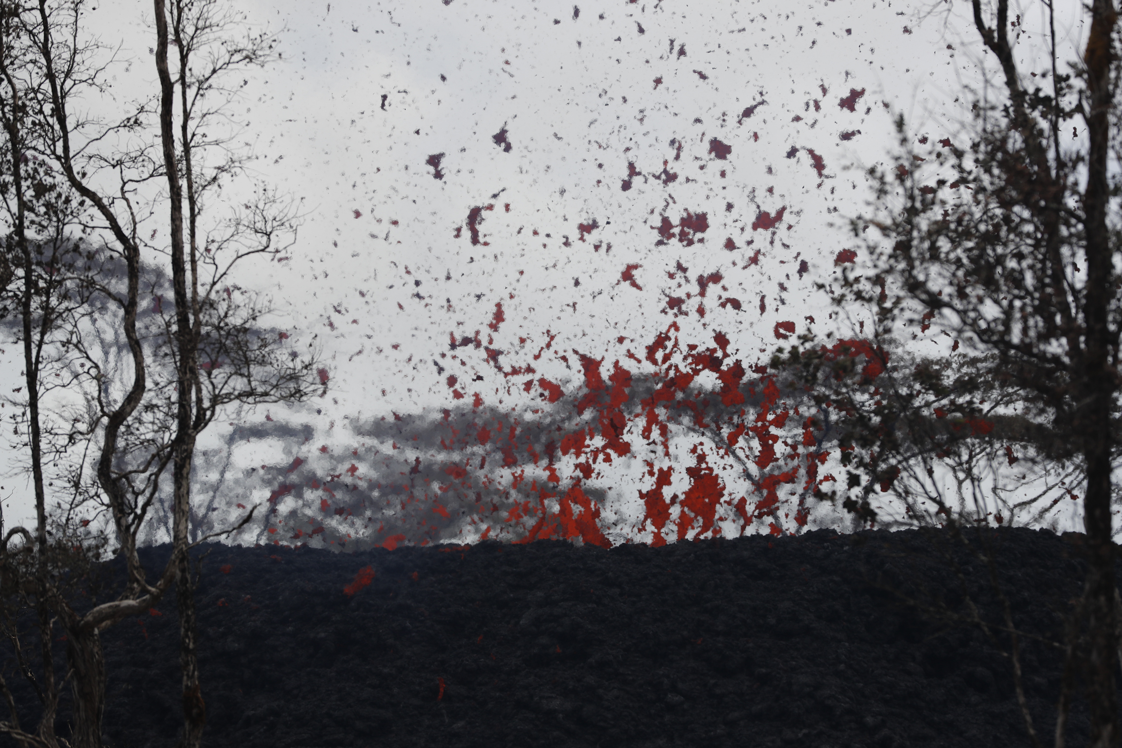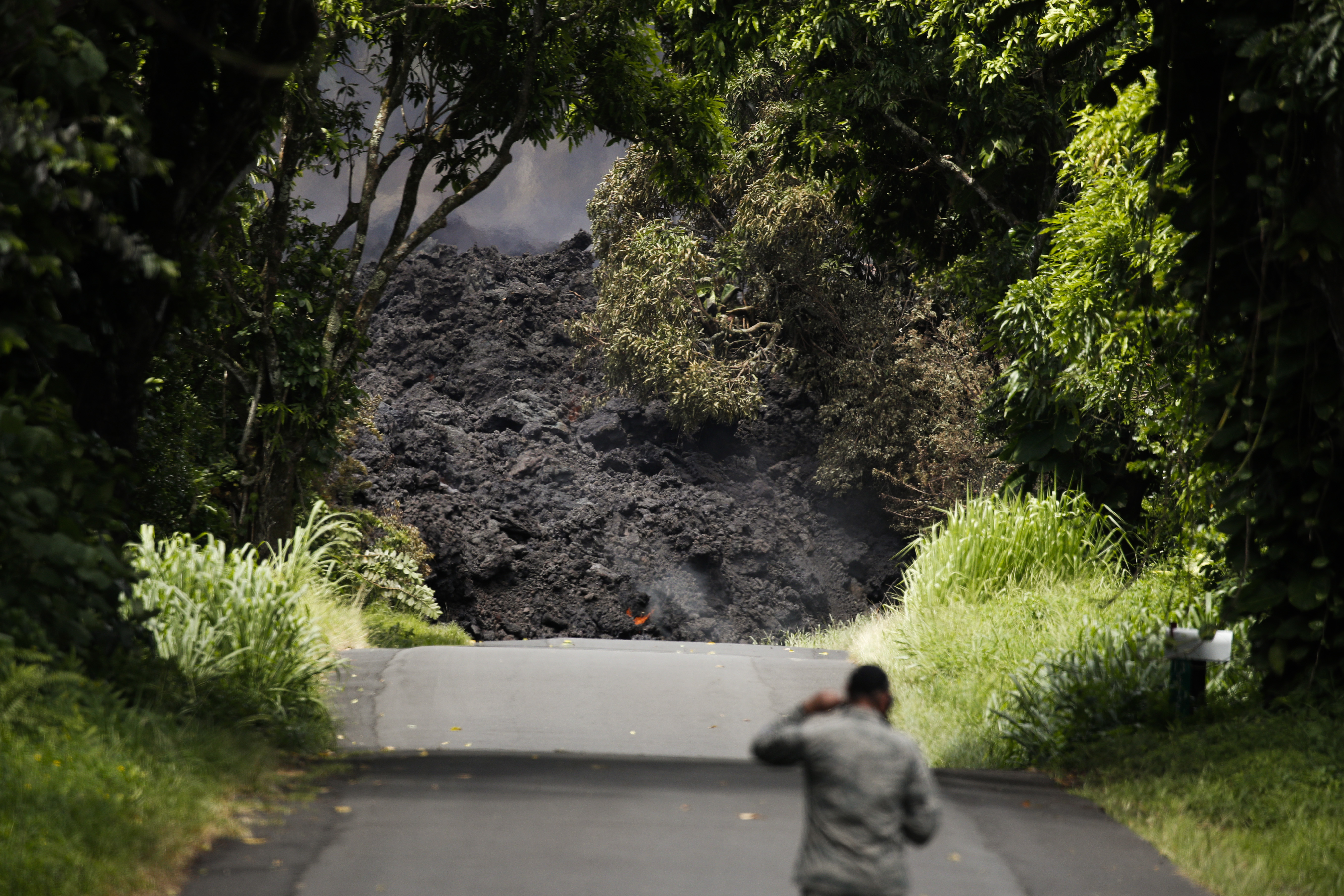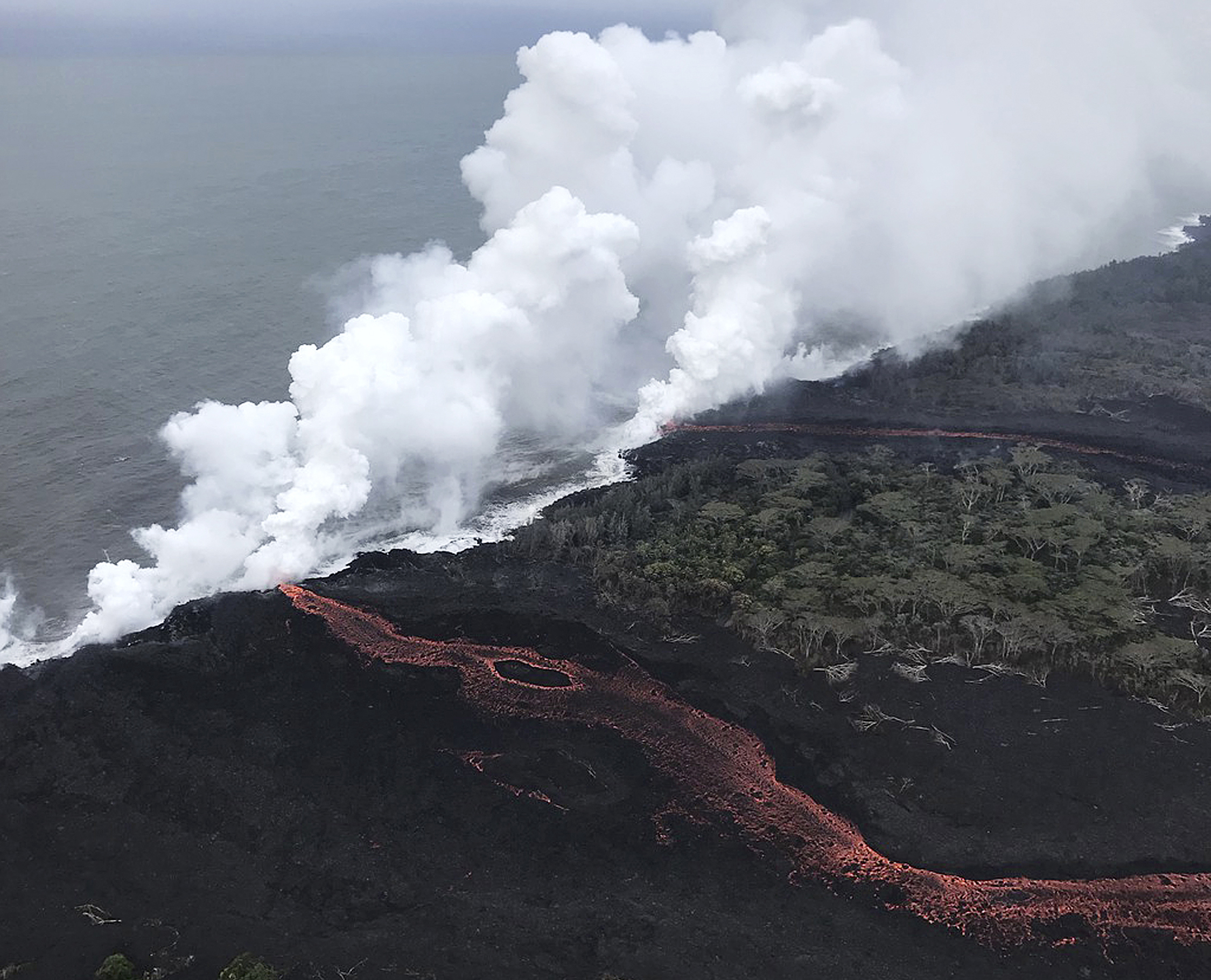 Il vulcano hawaiano, che sta eruttando ormai da alcuni giorni, sta diventando sempre più pericoloso (oltre che spettacolare): fiumi di roccia fusa si riversano ovunque. Nuovi allarmi sono scattati quando la lava, nel suo percorso inarrestabile, è arrivata sulla costa vicino a Pahoa: la reazione chimica provocata dal contatto con le acque dell’oceano ha generato gas tossico che si è diffuso in grandi nuvole. (AP Photo / Jae C. Hong)