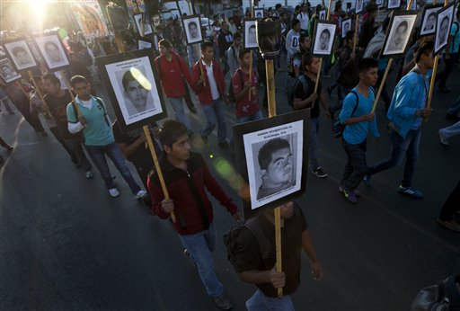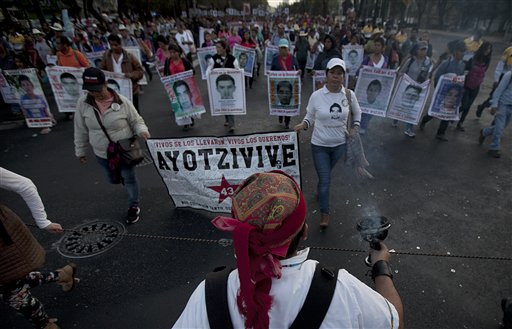 Marcia del 26 dicembre 2015 a Città del Messico dei parenti e amici dei 43 studenti scomparsi nel settembre 2014 mentre protestavano contro la corruzione nel Paese e i legami tra politica e criminalità organizzata. La manifestazione nel giorno di santo Stefano nella capitale messicana ha espresso grande dignità e coraggio nel chiedere l’avvio di una commissione indipendente di inchiesta sulla violazione dei diritti umani e la repressione del dissenso. Un’istanza che chiama in causa la pressione delle reti di solidarietà internazionale ( foto AP)