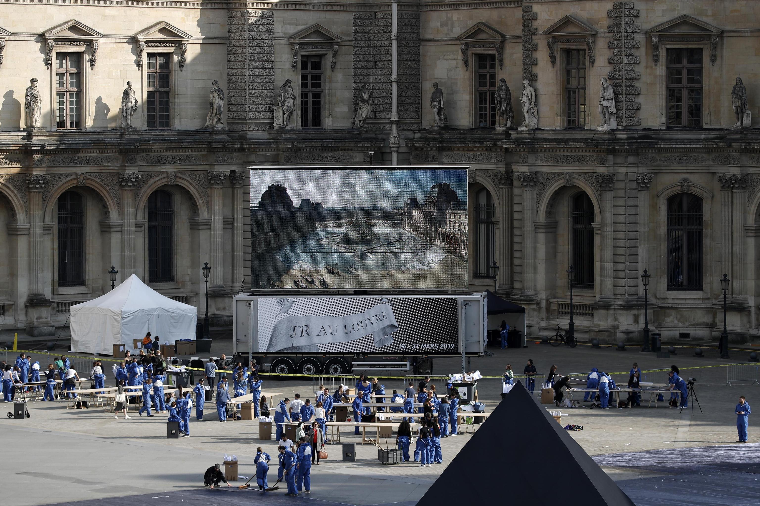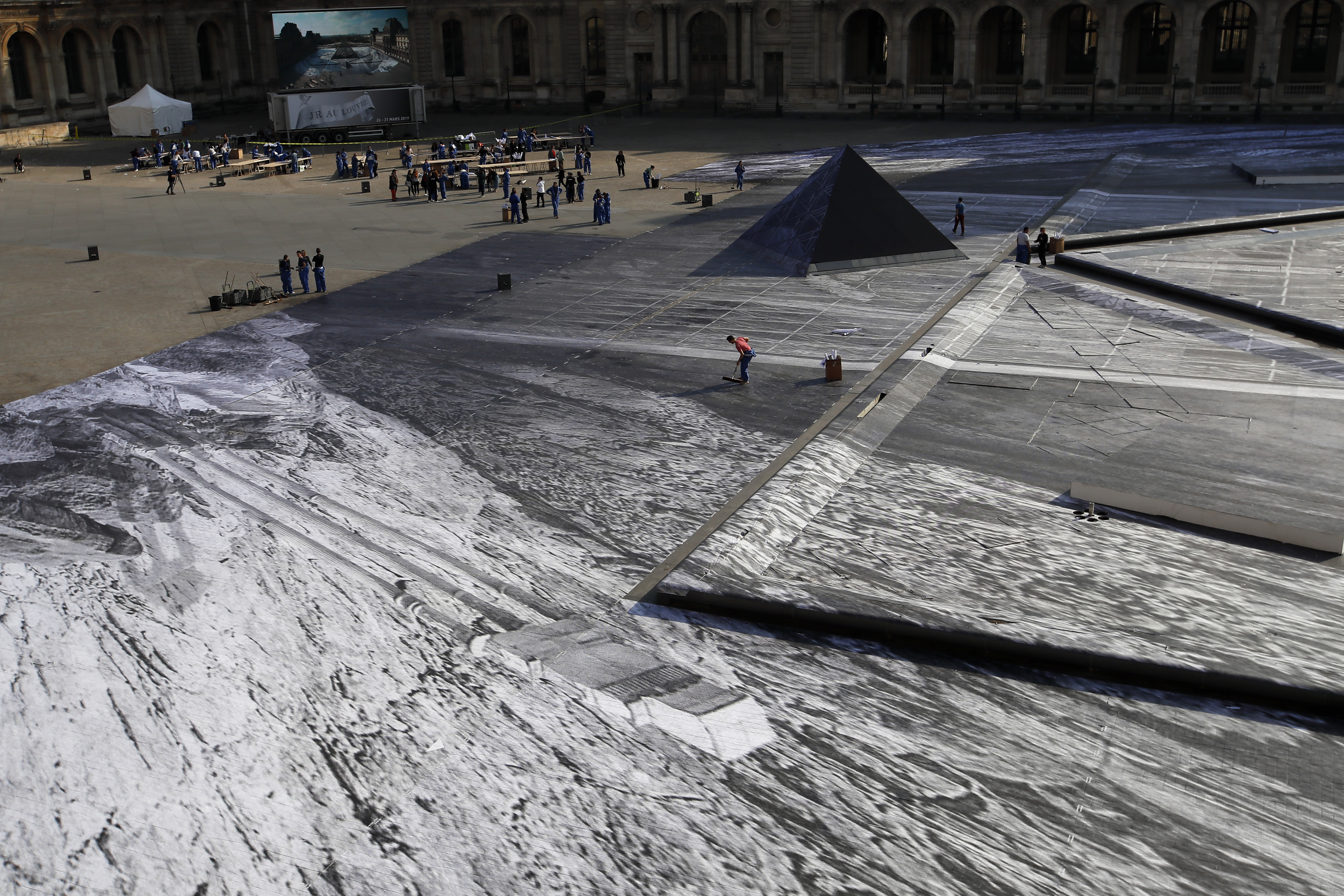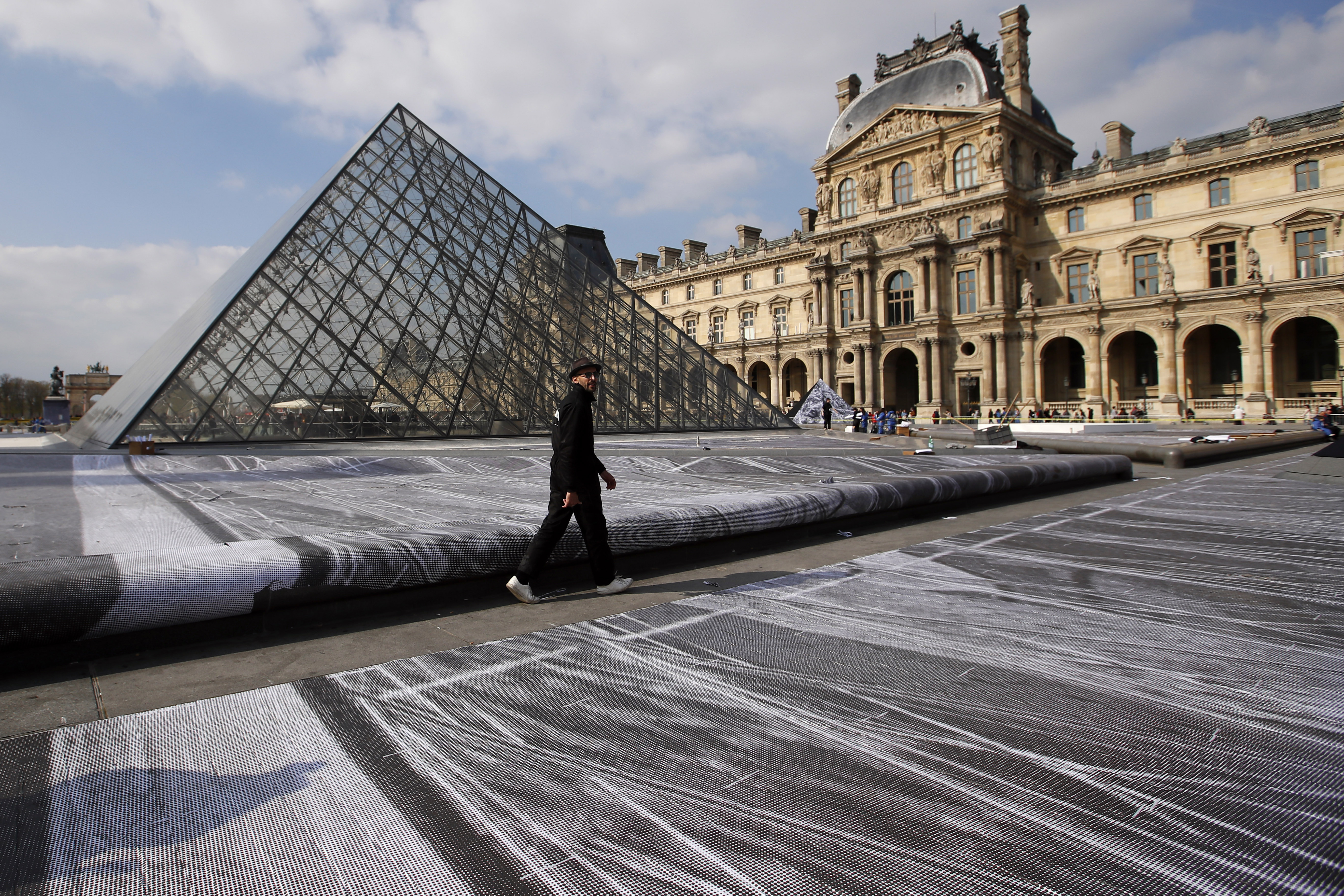 Una gigantesca illusione ottica è l’installazione con cui l’artista di strada JR celebra i primi 30 anni della Piramide nella piazza antistante il Museo del Louvre a Parigi. Per tre giorni, l’artista e 400 volontari hanno attaccato lunghissime strisce sulla pavimentazione del cortile Napoleone, che solo alla fine hanno svelato un disegno. L’immagine creata si può osservare dal terzo piano del museo e appare una voragine di rocce da cui la Piramide sembra emergere. Se non siete a Parigi questo weekend, ammirate le foto sul profilo Facebook dell’artista.