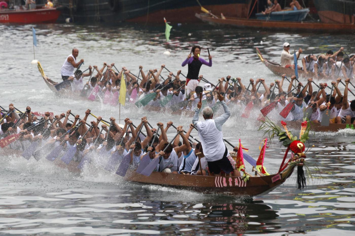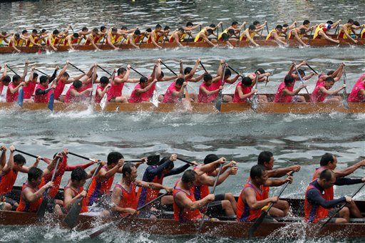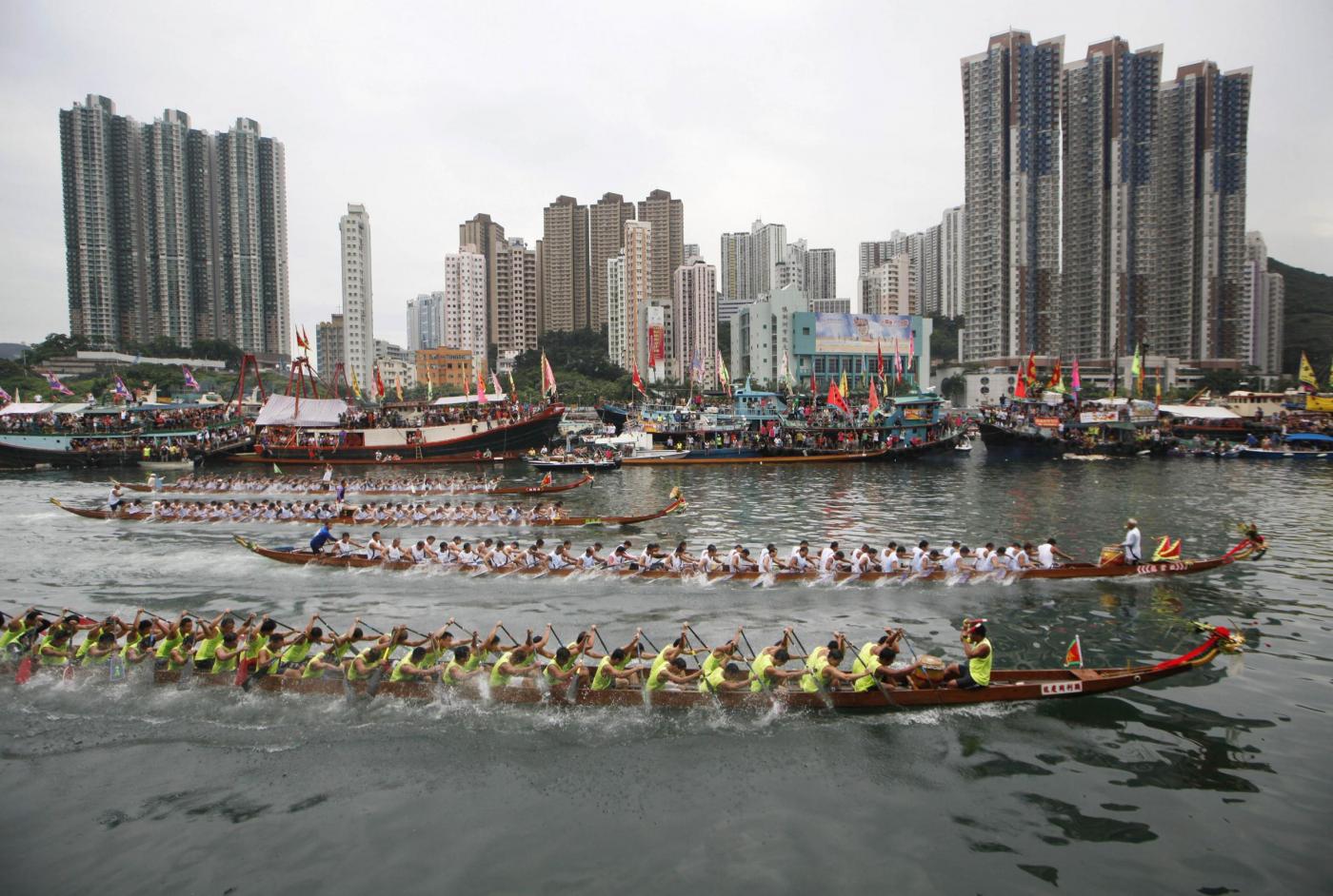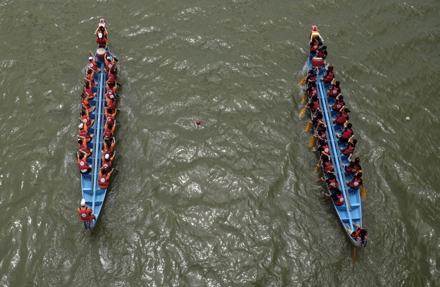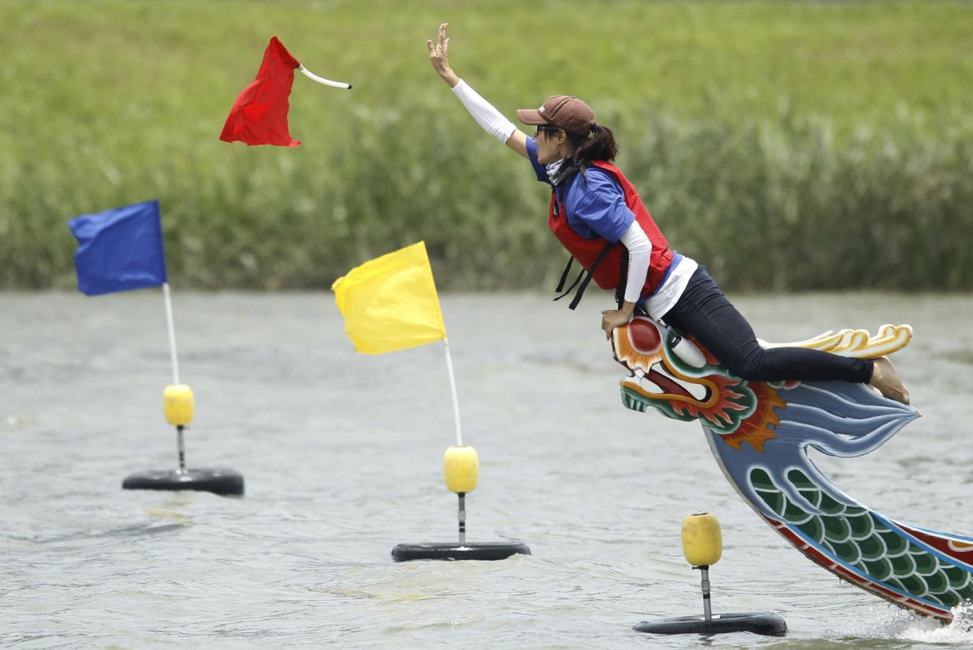 Centinaia di vogatori sono scesi nelle acque antistanti Taipei per partecipare al tradizionale festival Dragon boat, in onore di uno statista cinese che nel 277 a.C. annegò dopo aver denunciato la corruzione del governo. Le barche si sfidano fino alla vittoria, segnata dal lancio della bandiera nazionale (foto Ap).