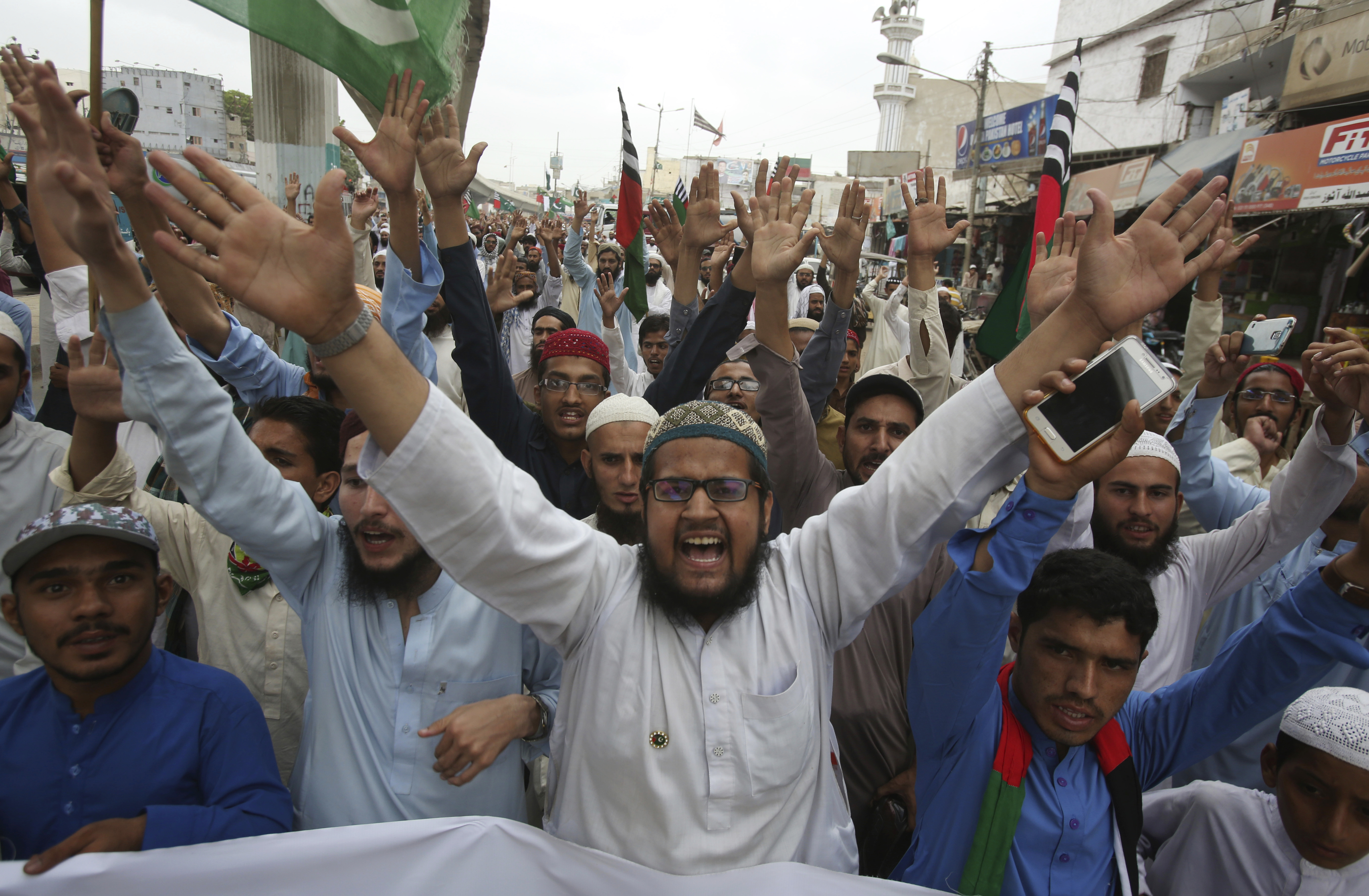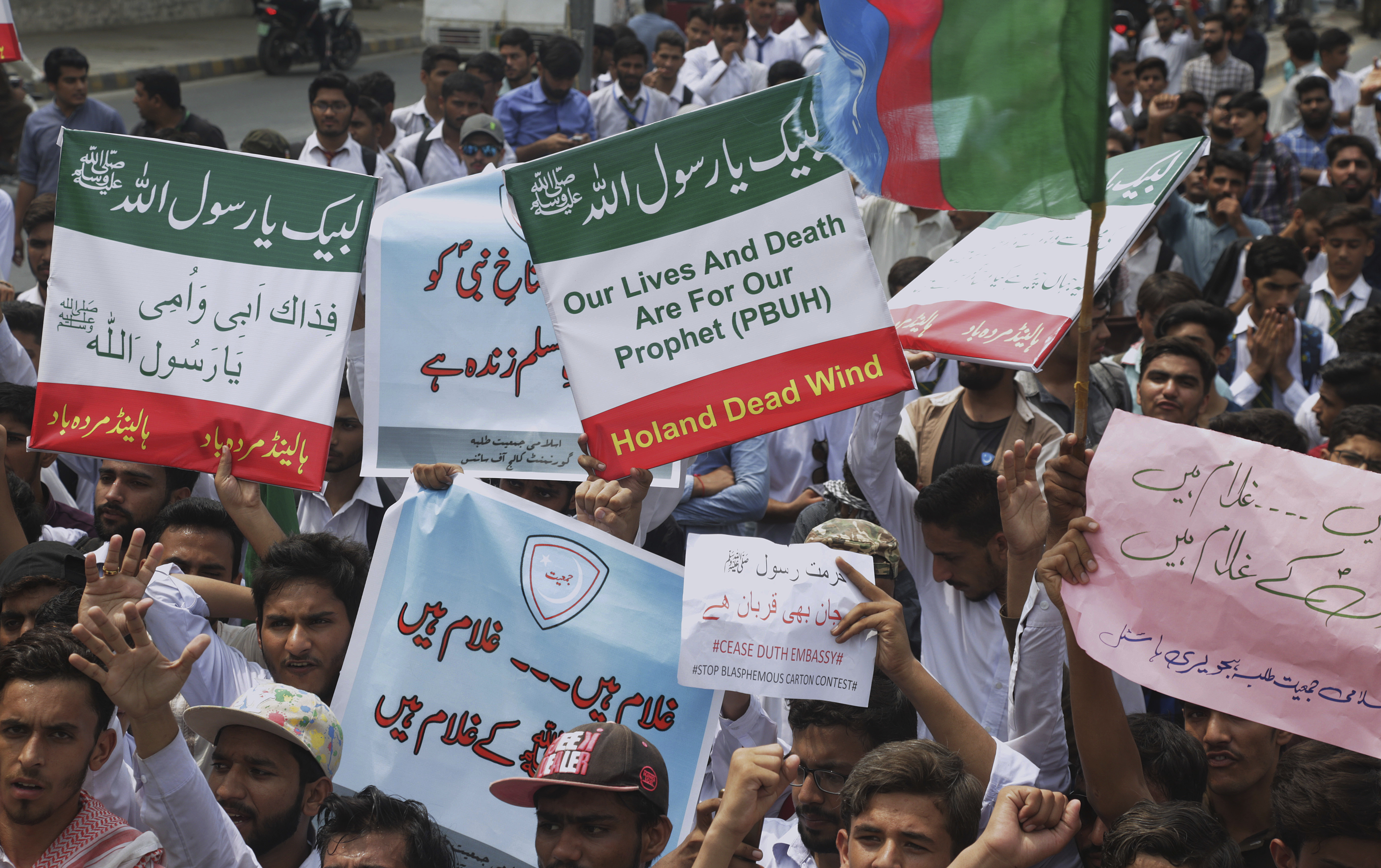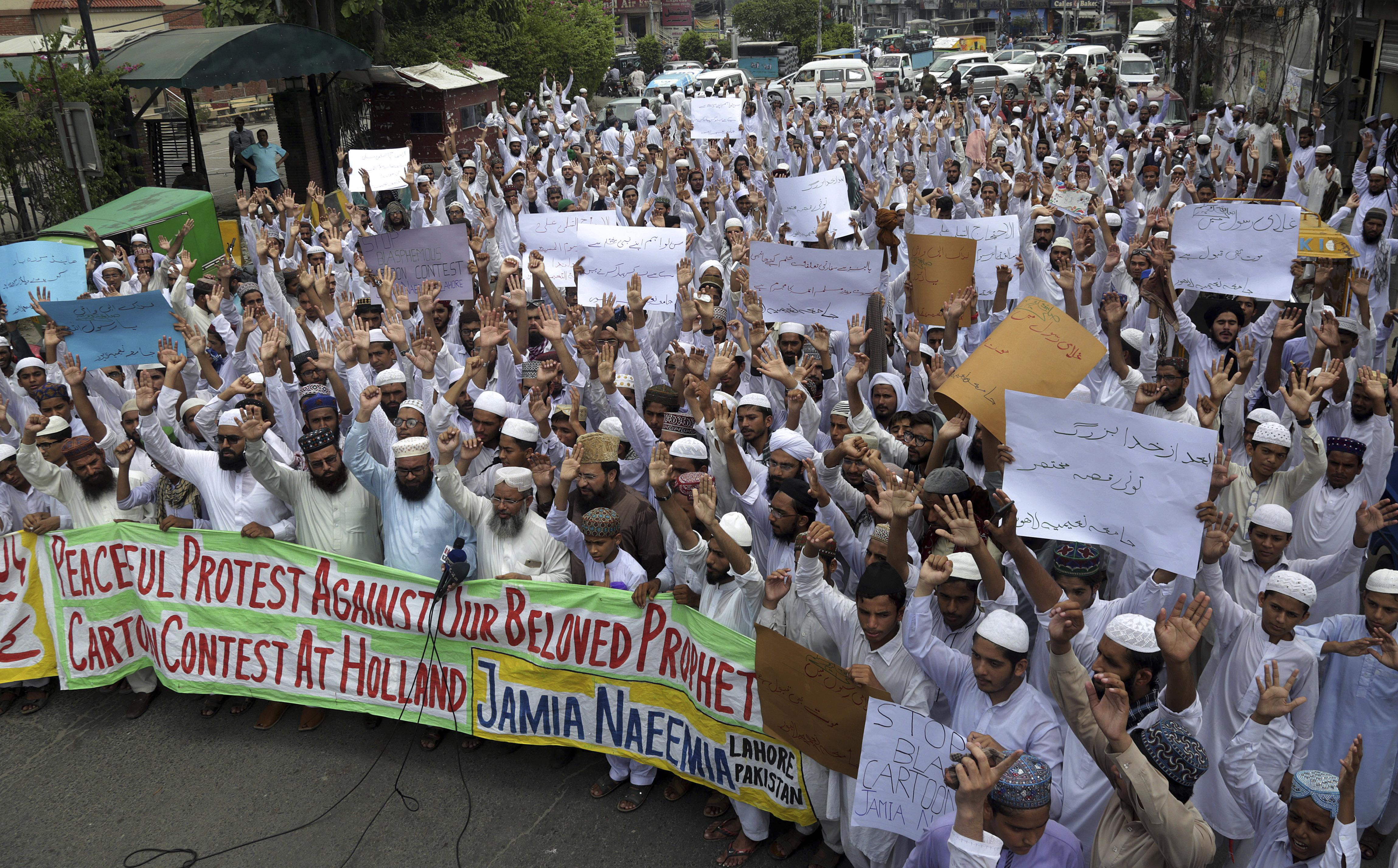 Molti manifestanti, a Hyderabad, in Pakistan, hanno condannato la prevista competizione di vignette anti-Islami, una gara di cartoni animati progettata da Geert Wilders, un parlamentare olandese. I membri di un gruppo islamista pakistano, che ha ottenuto risultati sorprendenti nelle elezioni nazionali del mese scorso, si sono radunati contro Wilders, che ha in programma di tenere una competizione a fumetti del Profeta Muhammad a novembre prossimo. (foto Ap)