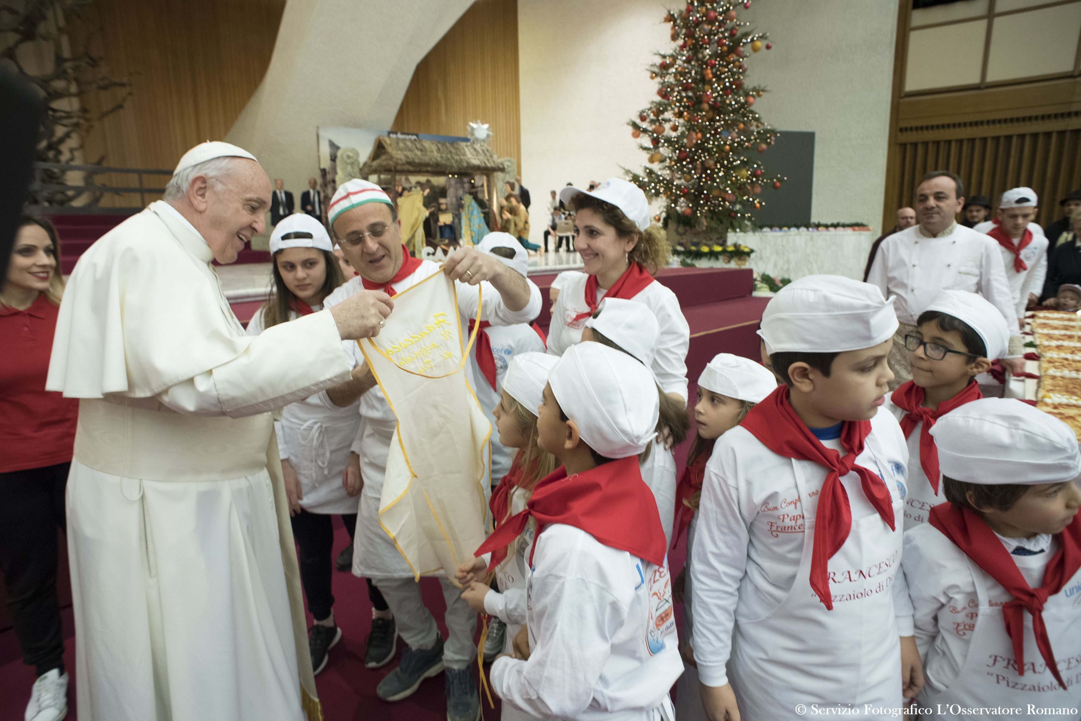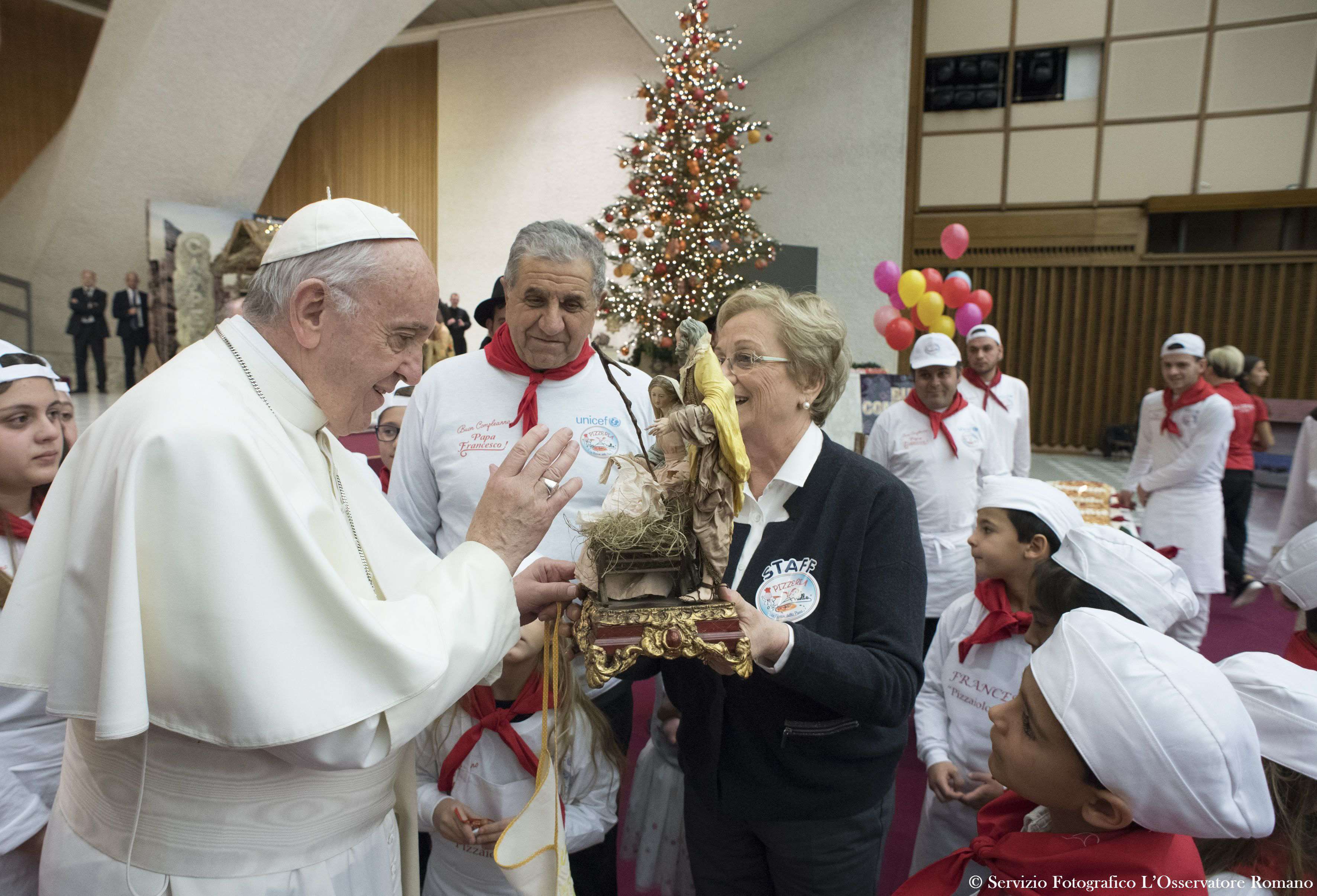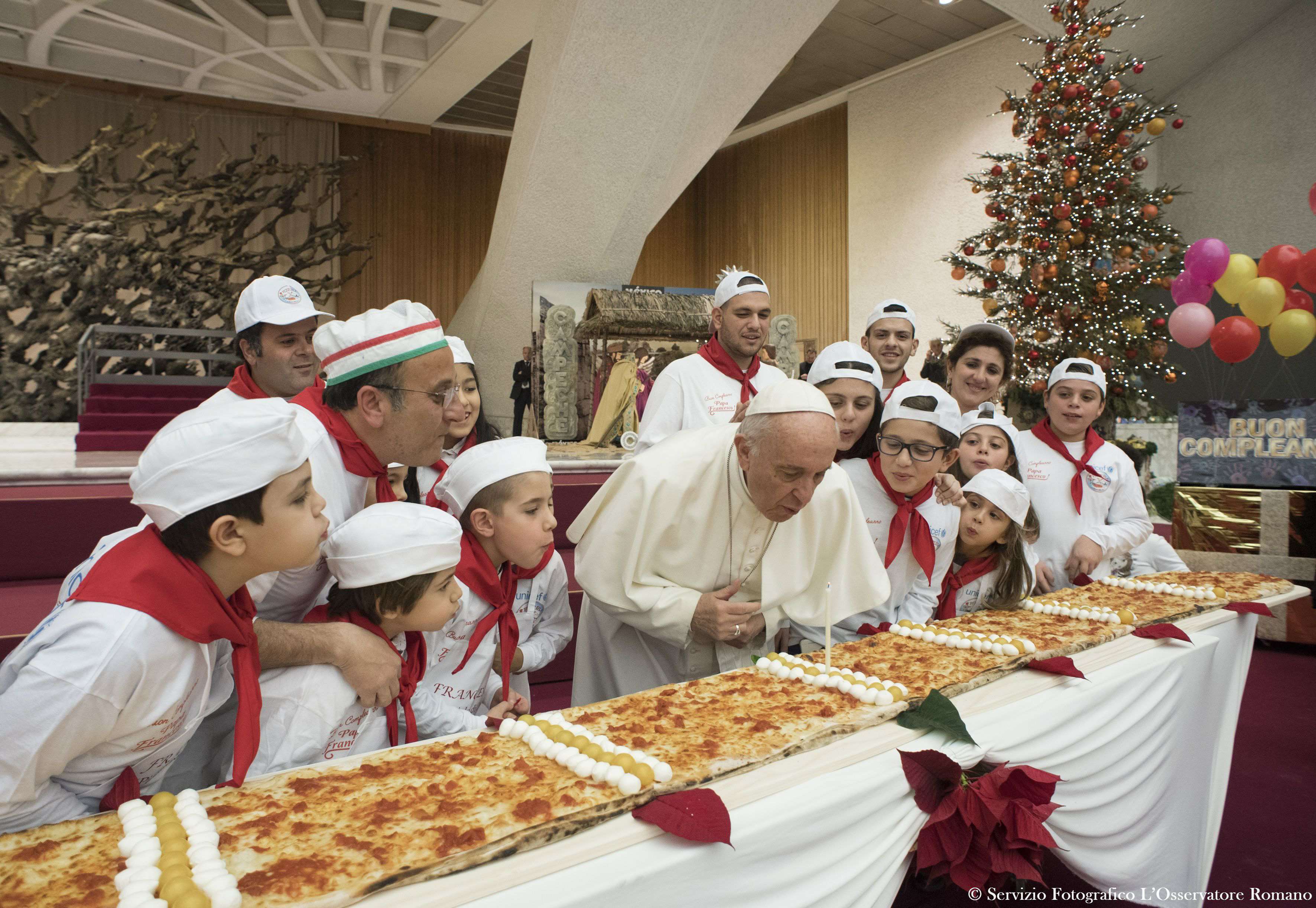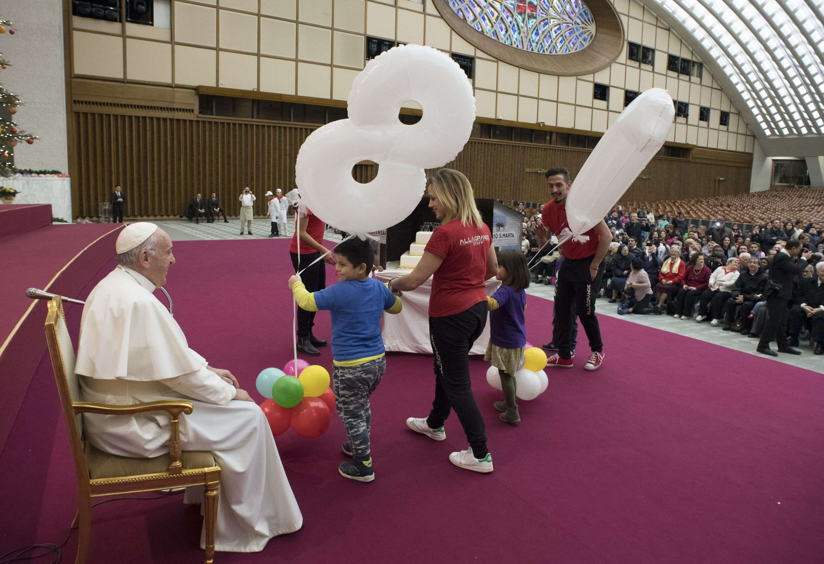 Il papa, nato il 17 dicembre 1936 a Buenos Aires, ha festeggiato i suoi 81 anni con i bambini del dispensario sanitario del Vaticano, che distribuisce medicinali alle famiglie indigenti. La torta è opera di un pasticcere del quartiere romano di Borgo Pio, vicino san Pietro. Il disegno sulla torta, realizzato dal noto illustratore Maupal, Maurizio Pallotta (che ha già fatto poster sul papa), rappresenta Francesco con il mondo sulle spalle. Un mondo spezzato in due e ricucito in qualche modo. In mano il papa ha una valigetta piena di valori.