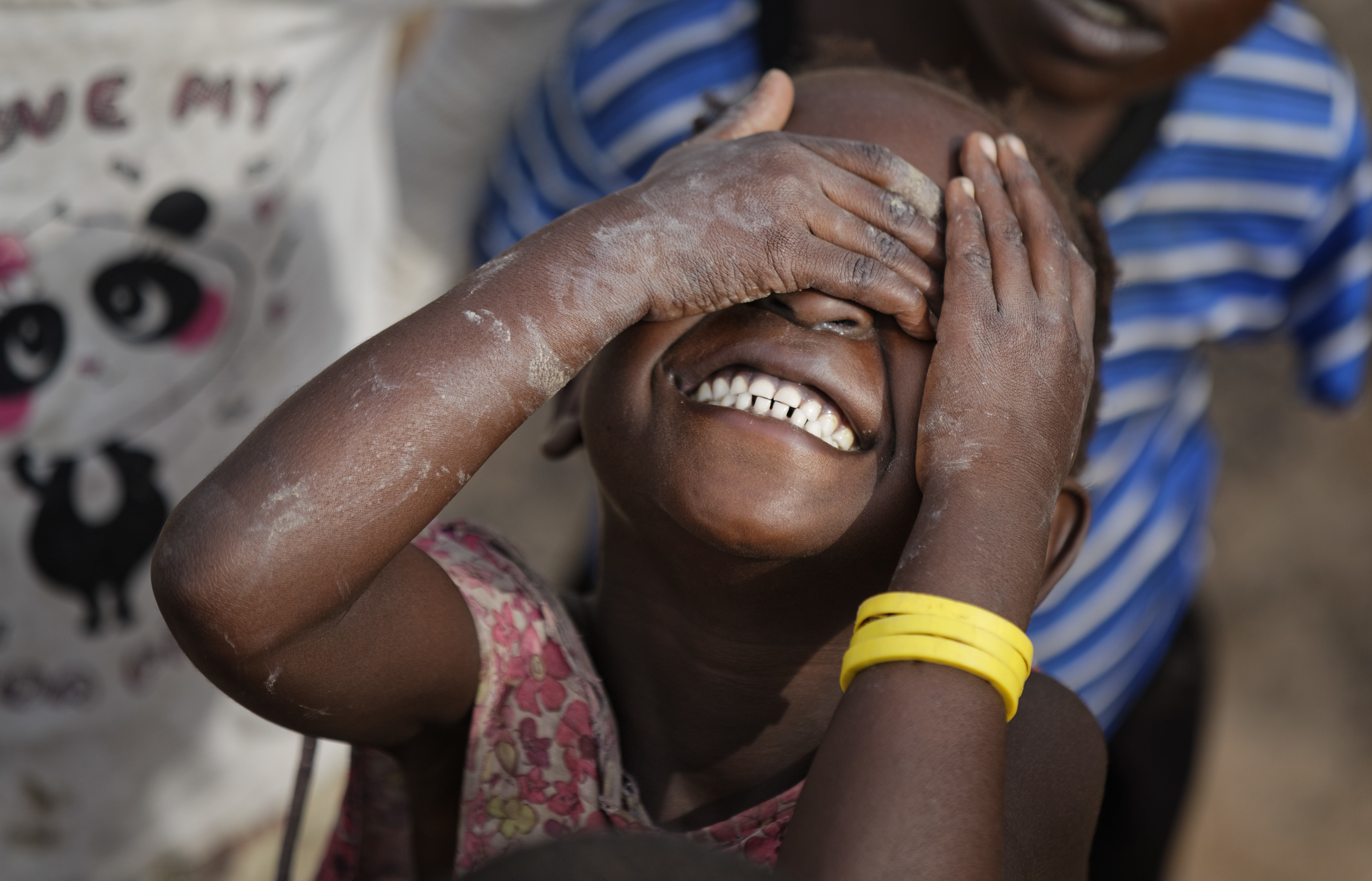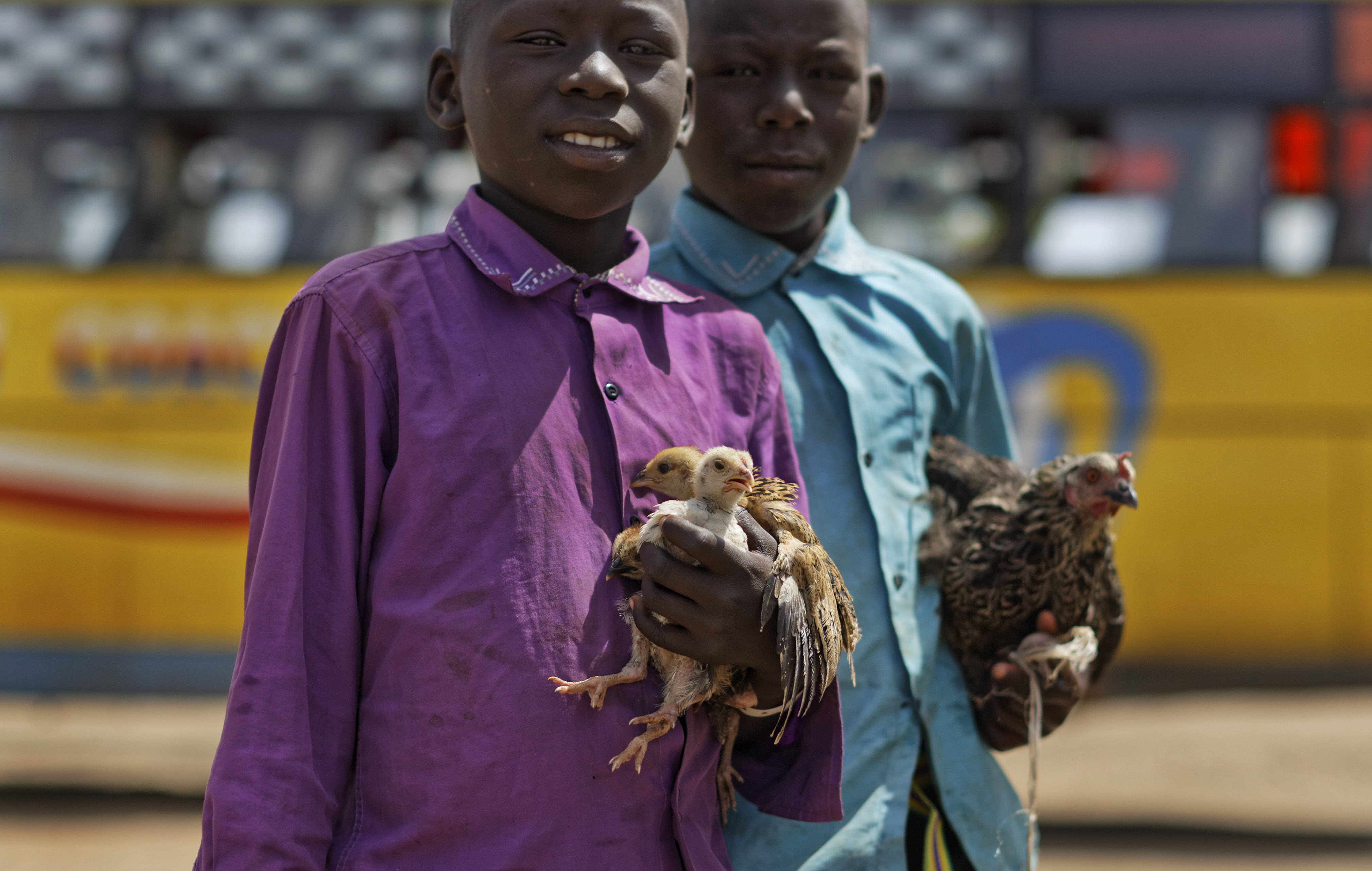 Nel campo sono numerosi i bambini: qui ne vediamo una che si protegge dalla piggia, una che si copre gli occhi in una risata, e una piccola in braccio alla mamma; mentre due ragazzini portano con sé qualche provvista – dei piccoli polli ancora vivi – in vista del viaggio di trasferimento in bus in un altro campo.