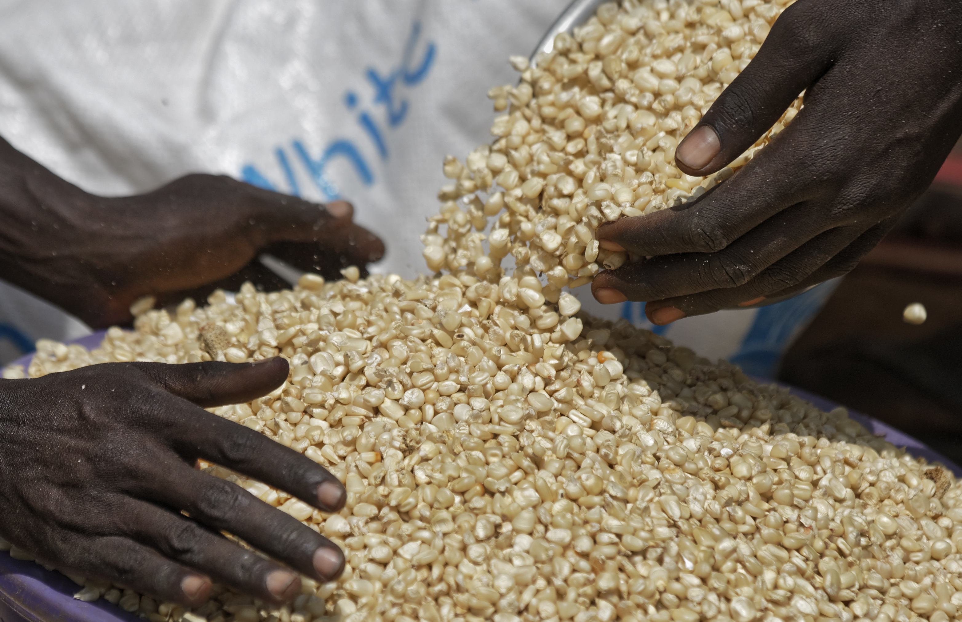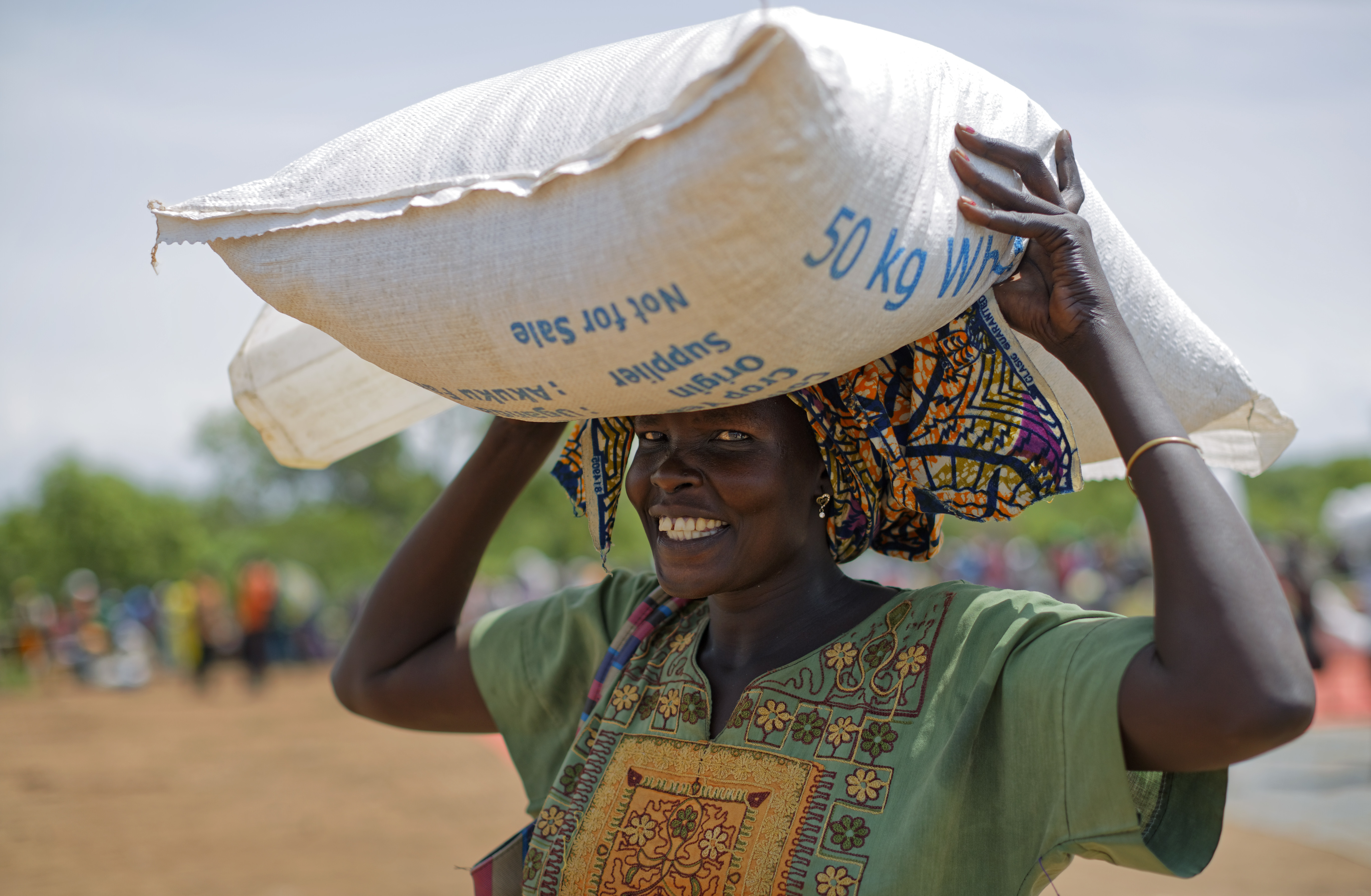 Nella prima foto, ragazzini giocano nel cortile della scuola di Ombechi, dove 500 alunni studiano grazie all’aiuto dell’Unicef. Una donna trasporta un sacco di mais, soddisfatta dopo la distribuzione viveri nel campo di Bidi Bidi; mais che viene poi diviso tra le famiglie, oppure distribuito in forma di una sorta di zuppa.