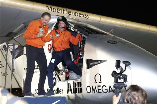 Partito da Abu Dhabi il 9 marzo dello scorso anno, il Solar Impulse 2 torna alla base dopo aver compiuto più di 42 mila chilometri ed aver effettuato il giro del mondo senza l'impiego di carburante. È il primo aereo, infatti, dotato di motori elettrici alimentati da celle fotovoltaiche (foto Ap).