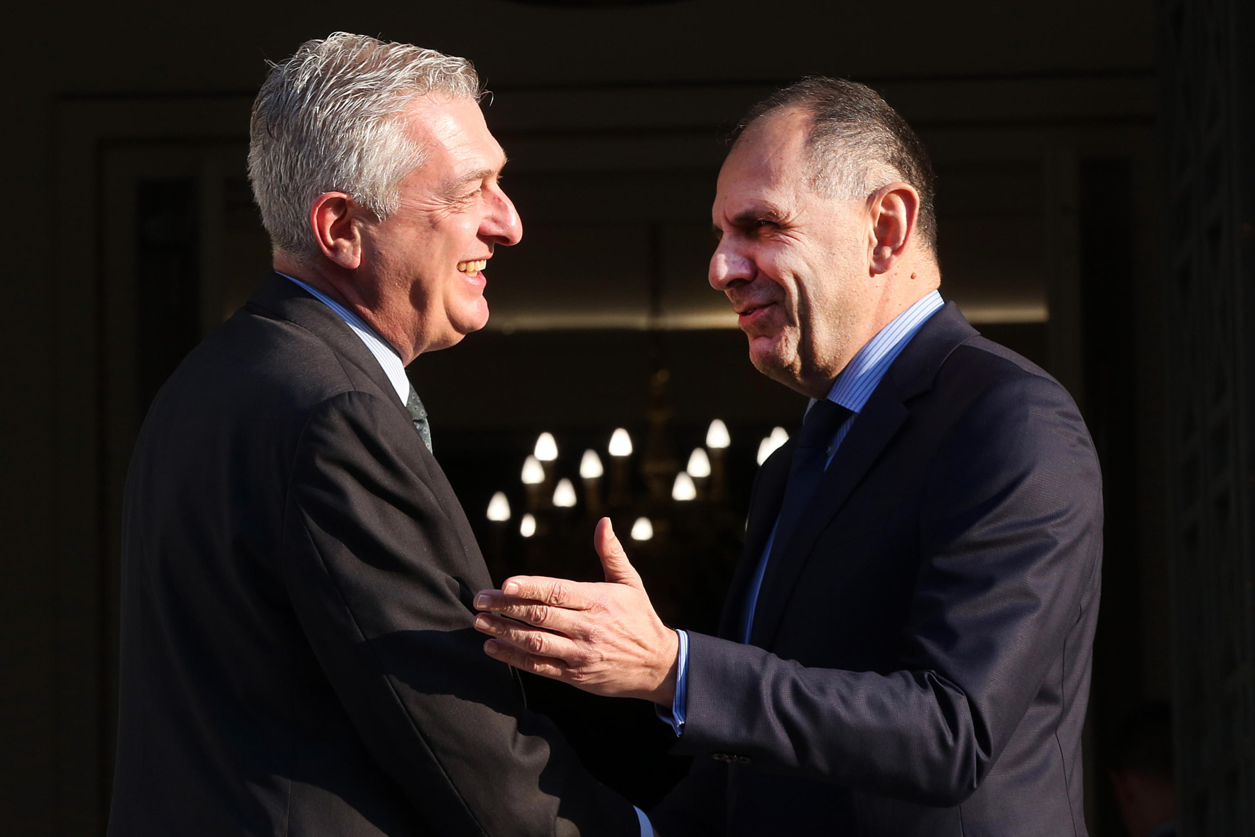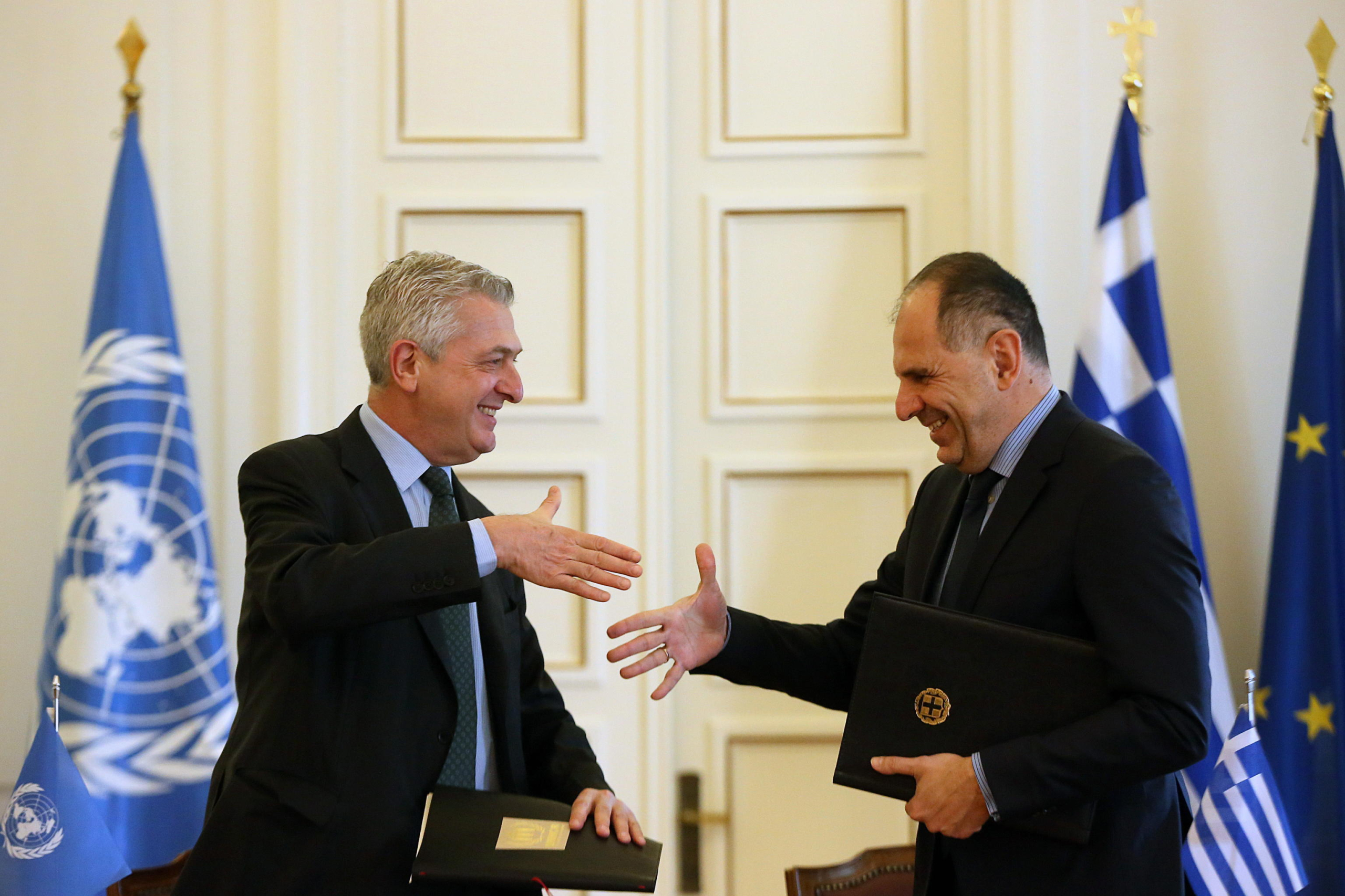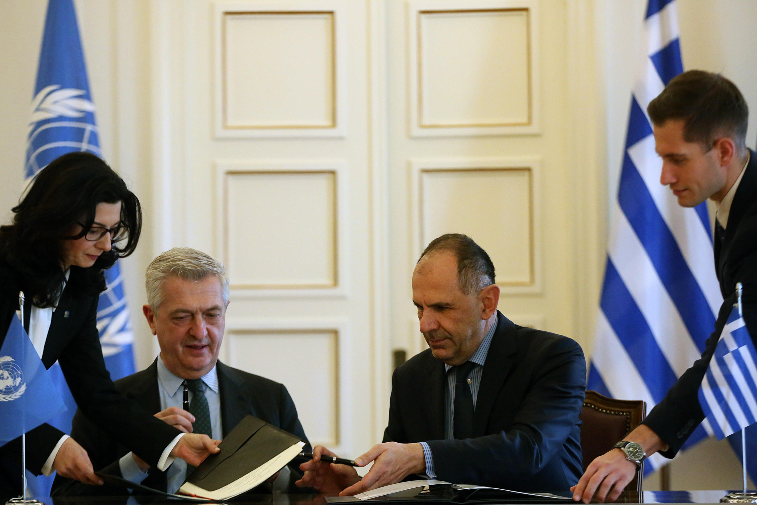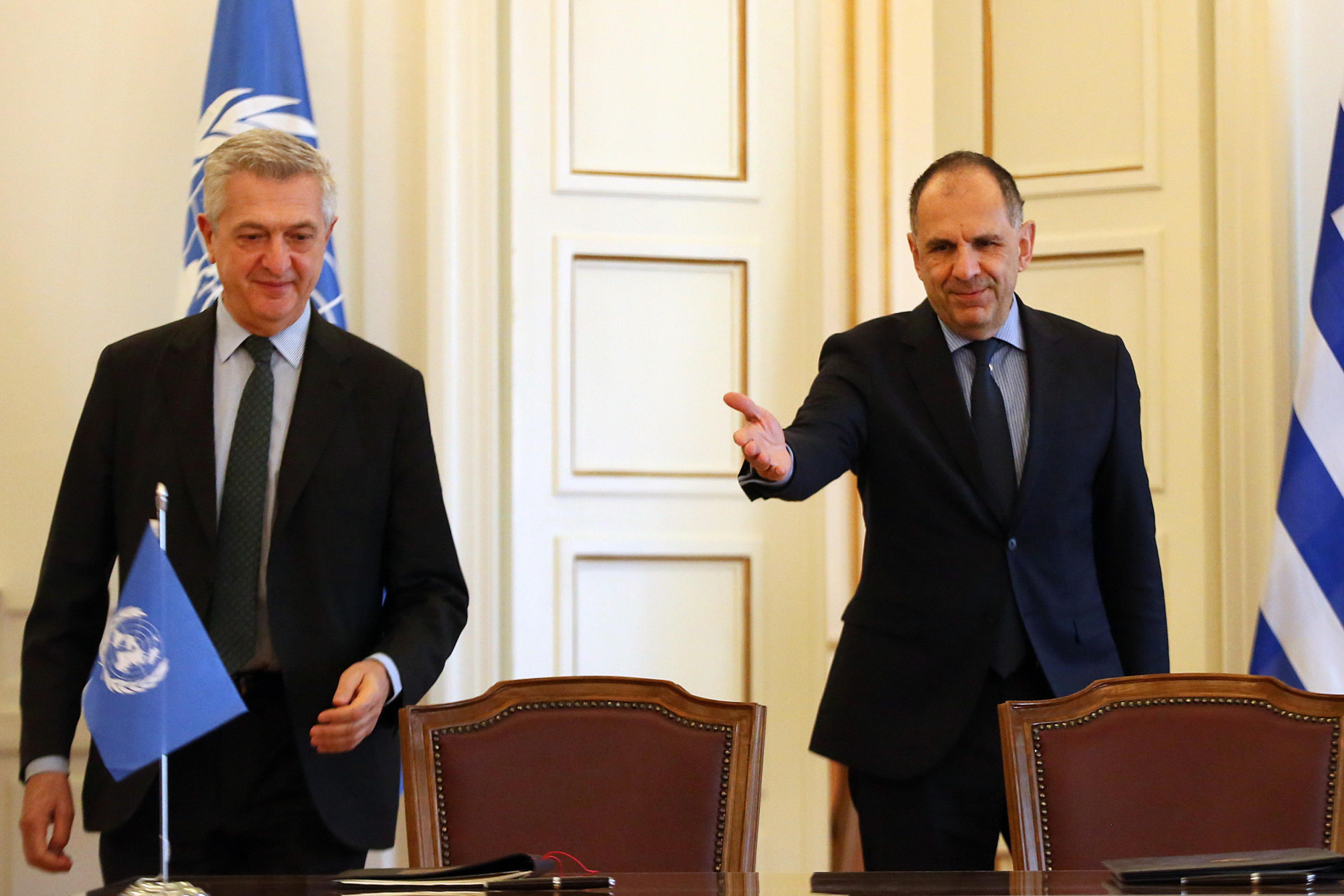 Il Ministro degli Esteri greco Giorgos Gerapetris (a destra) accoglie Filippo Grandi (a sinistra), Alto Commissario delle Nazioni Unite per i Rifugiati (UNHCR) durante il loro incontro oggi ad Atene, in Grecia. Filippo Grandi si trova ad Atene per la cerimonia di firma dell’Accordo di sede tra la Grecia e l’Agenzia delle Nazioni Unite per i Rifugiati. L’accordo regolerà lo status operativo dell’ufficio dell’UNHCR in Grecia.