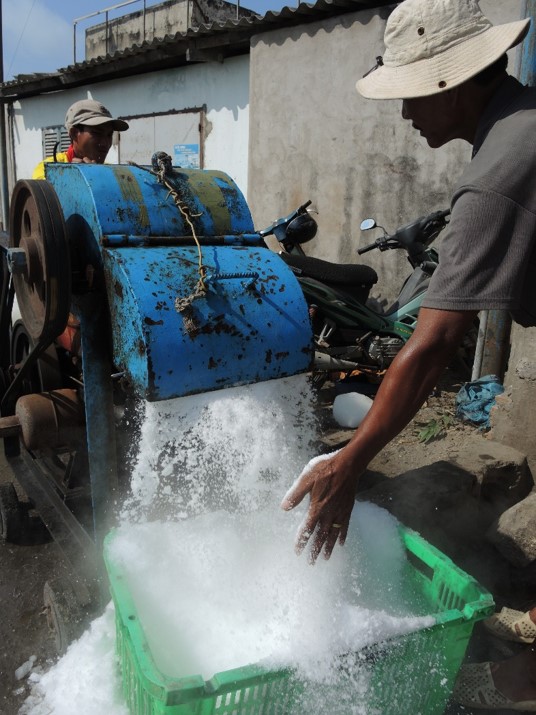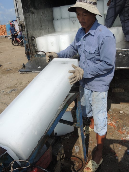 Riuscire a 'produrre' buon ghiaccio in brevissimo tempo, pulito, per la conservazione del pesce appena pescato, non è cosa da poco: richiede esperienza, velocità, mani esperte e tanta coordinazione dei lavoratori: ogni secondo è prezioso.