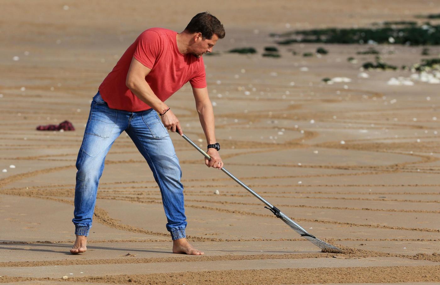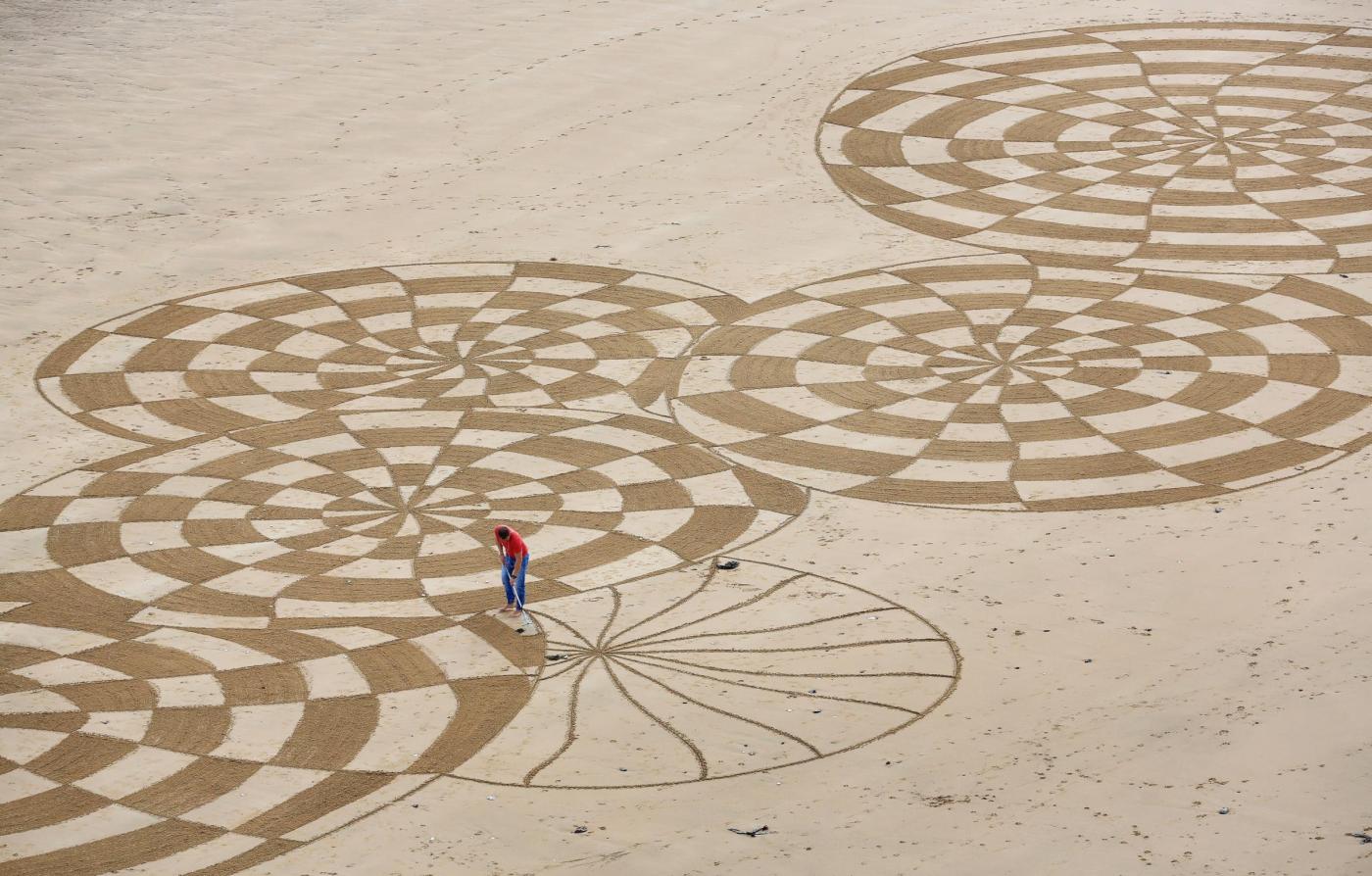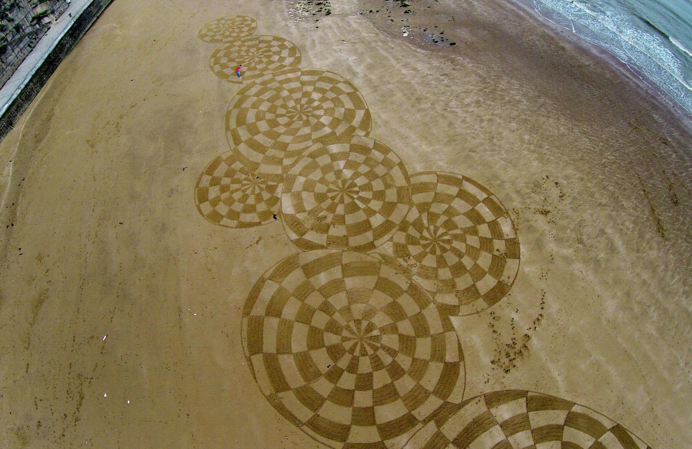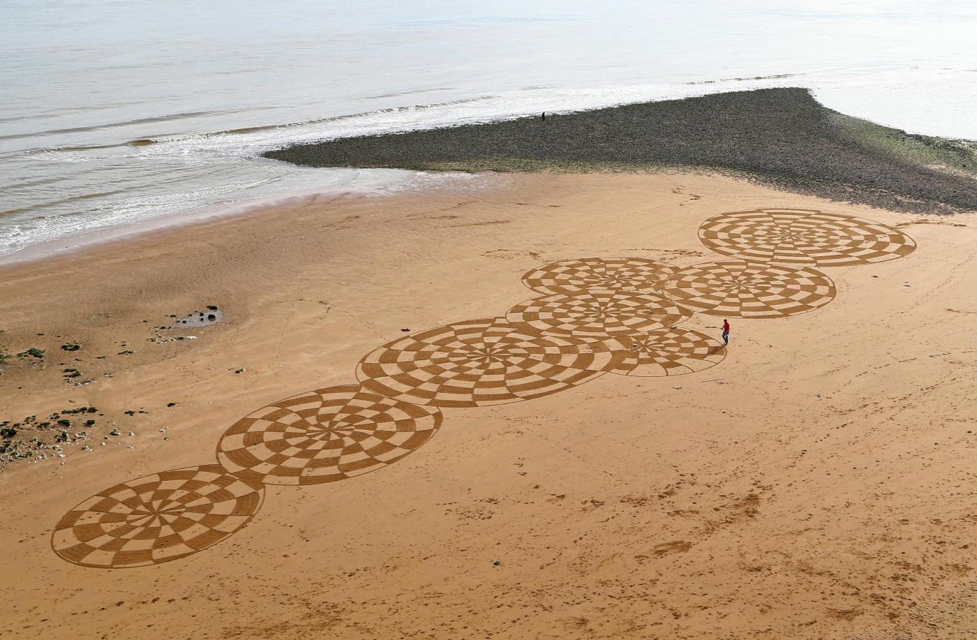 Le spiagge del Kent sono le tele che Ross Andrews utilizza per realizzare le sue opere su sabbia. In foto l'opera 'Legacy No.II'. I suoi strumenti tecnici sono un rastrello e un bastone. I disegni vengono realizzati sul momento, una sorta di "free style" in lotta contro le maree, che battono la scogliera. Quattro ore il tempo impiegato per ogni realizzazione, che Andrews propone anche alle aziende per promuovere i loro prodotti.