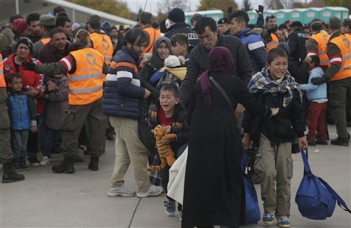 Continua il dramma dei rifugiati che tentano di raggiungere la Germania. Nella foto Ap, una famiglia affronta i disagi del lungo esodo al confine tra Austria e Slovenia.