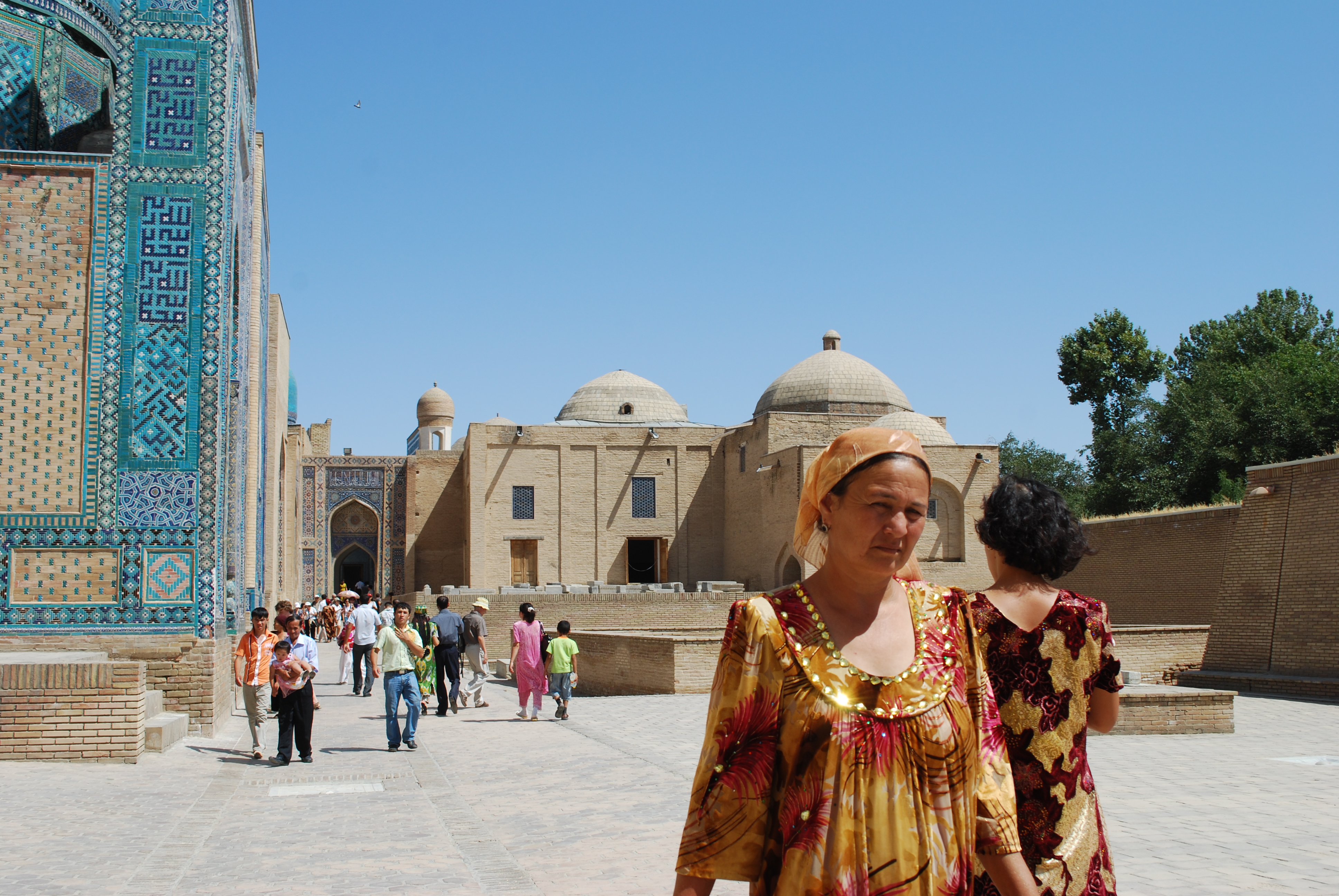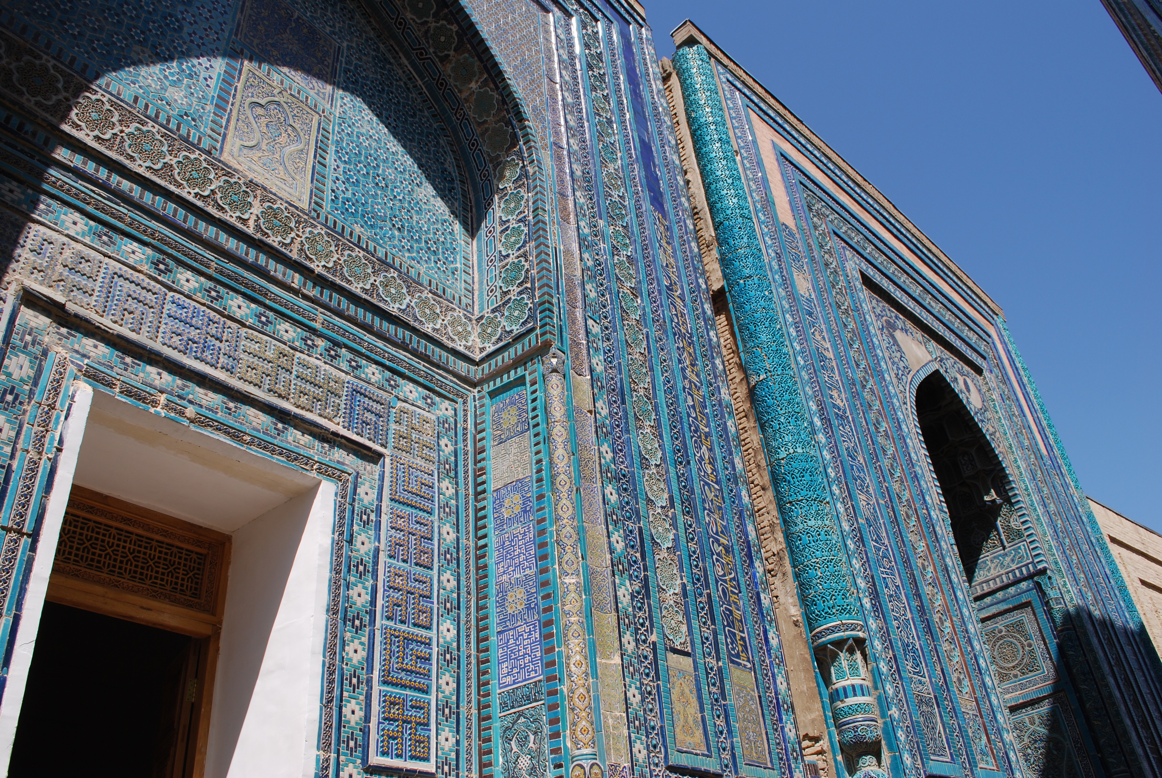 Allo Shah-i-Zinda, uno dei massimi capolavori dell’arte timuride, s’ammirano i colori del cielo racchiusi in pezzi di terracotta.