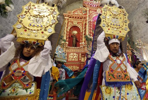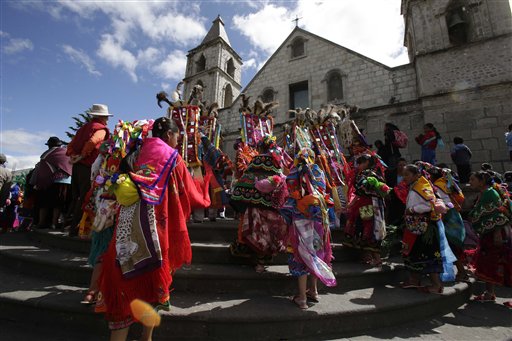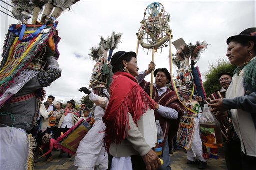 Nel suo viaggio in Equador papa Francesco incontrerà tante tribù indigene che hanno accolto il cristianesimo mescolandolo ai loro rituali e alle danze tributate alle divinità degli avi. Costumi colorati, specchi, perline si intrecciano alle processioni per il Corpus domini o per la Madonna addolorata. Anche il papa, in una delle foto, diventa un'icona da venerare al pari di altri santi