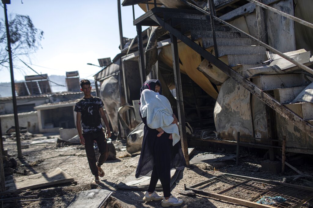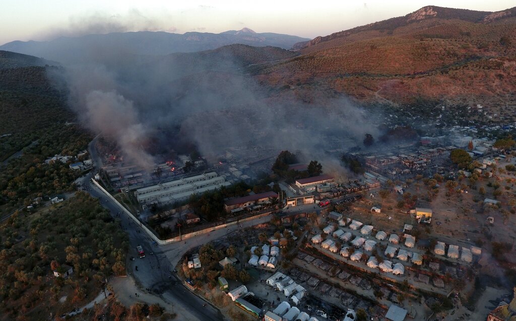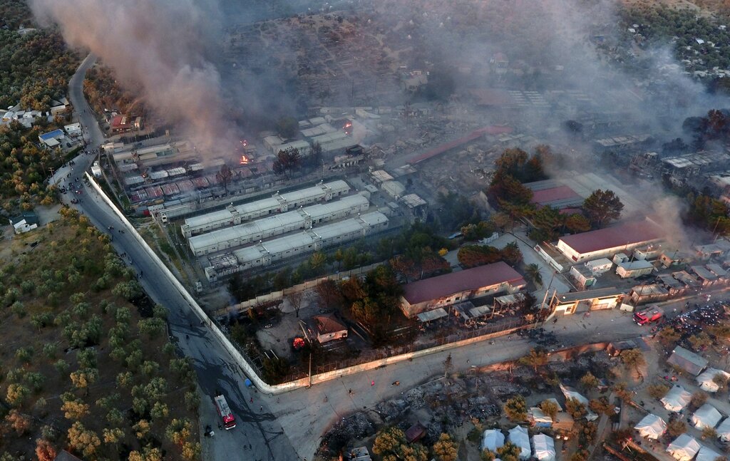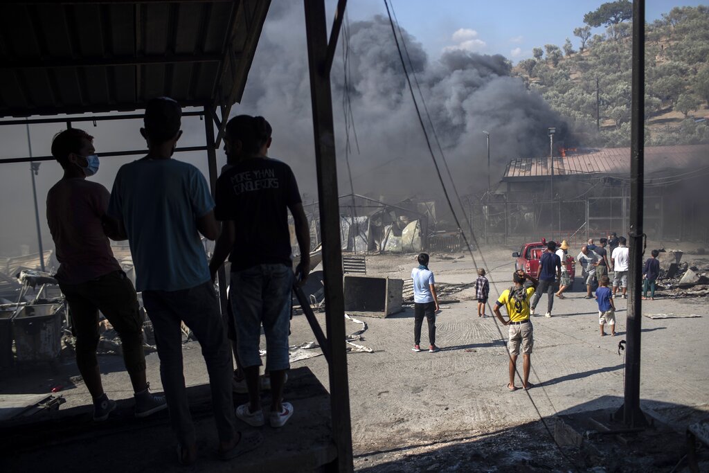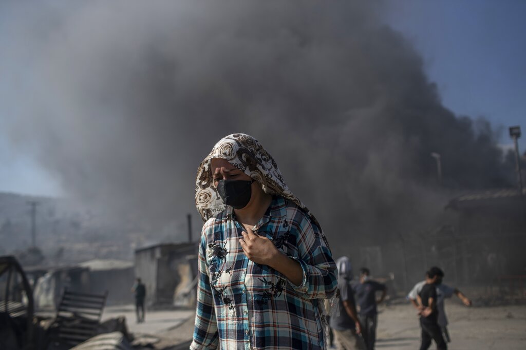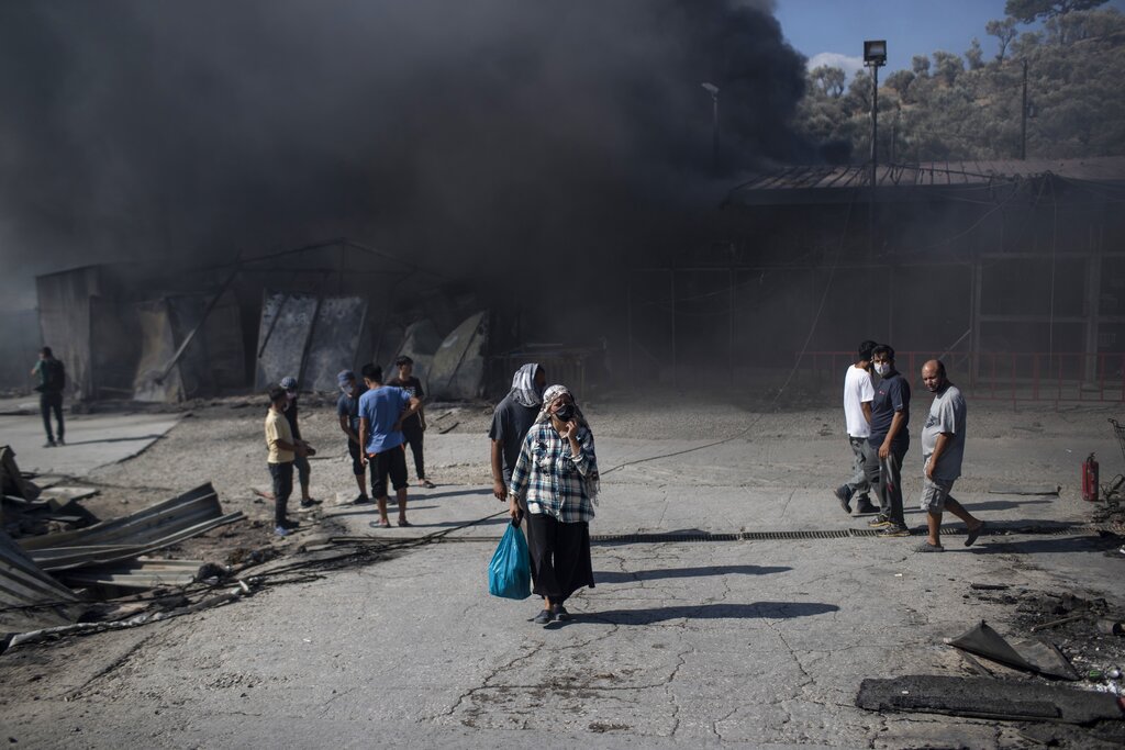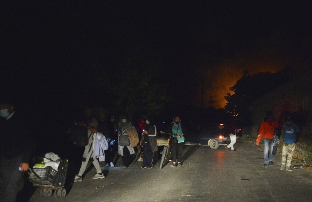 Brucia nella notte il campo profughi di Moria a Lesbo, in Grecia. il governo greco ha fatto sapere che dichiarerà lo stato d’emergenza. Le fiamme hanno distrutto l’intero sito e lasciato quasi 13 mila persone senza casa. Stelios Petsas, portavoce del governo, ha sottolineato che è stato deciso di vietare l’evacuazione dell’isola per evitare ulteriori contagi da Coronvirus, dopo che nelle scorse settimane si sono registrati diversi casi di positività tra i migranti. Nessuna vittima , ma diverse persone con crisi respiratorie per il fumo inalato. Secondo alcuni media locali le fiamme sarebbero una conseguenza delle proteste contro il lockdown, ma la polizia non ha ancora confermato questa tesi. (AP Photo/Petros Giannakouris, Panagiotis Balaskas)