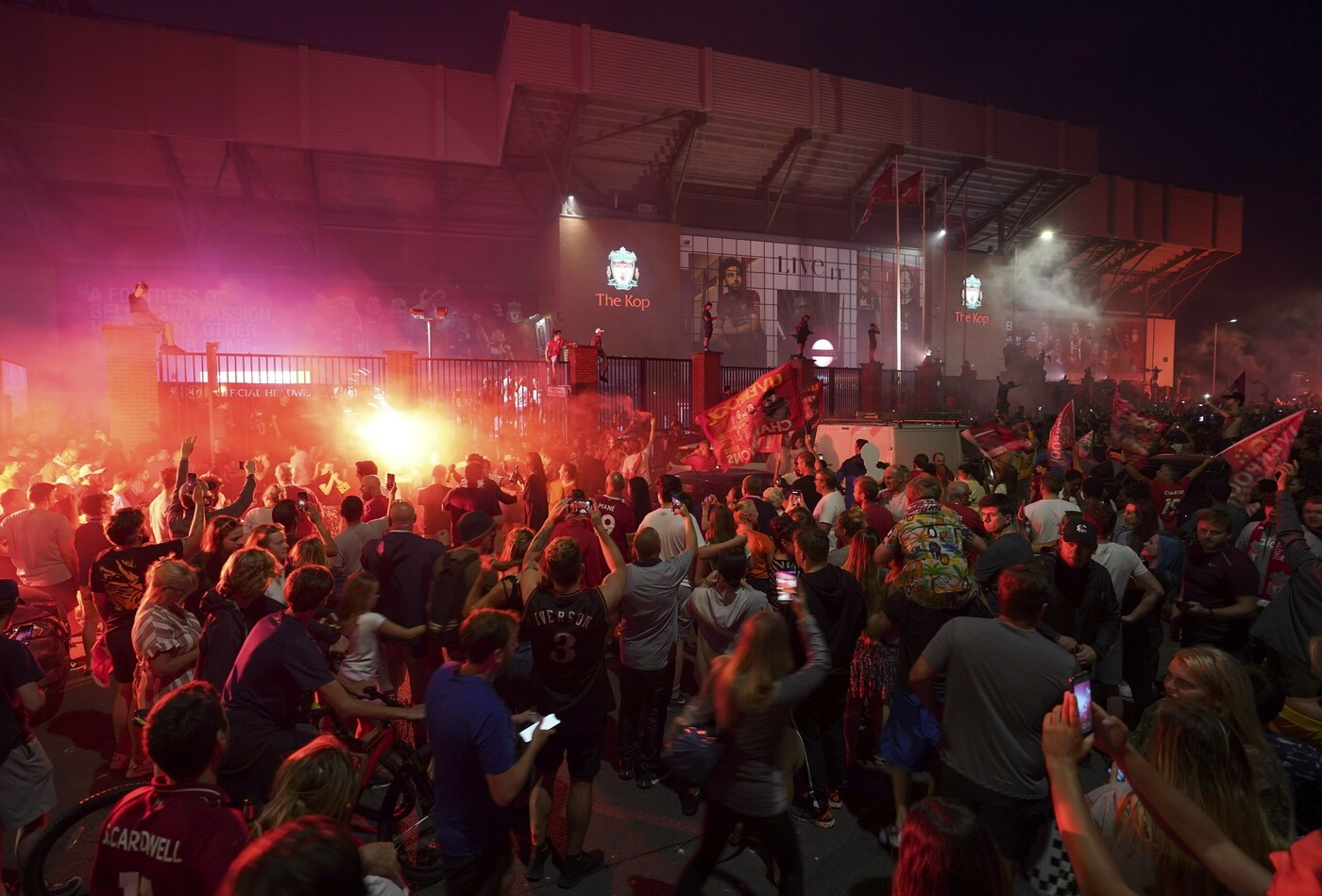 Il Liverpool è campione d’Inghilterra dopo 30 anni e niente e nessuno ha potuto frenare l’entusiasmo dei tifosi che anche con pub e locali chiusi si sono riversati in strada portando alcol e fumogeni da casa. La vittoria è arrivata con ben 7 turni di anticipo, senza giocare con il Chelsea che ha battuto il Manchester City di Pep Guardiola, ed è arrivata dopo aver vinto la Champions League e la Coppa del mondo per club. Veri fuoriclasse. (foto Lapresse)