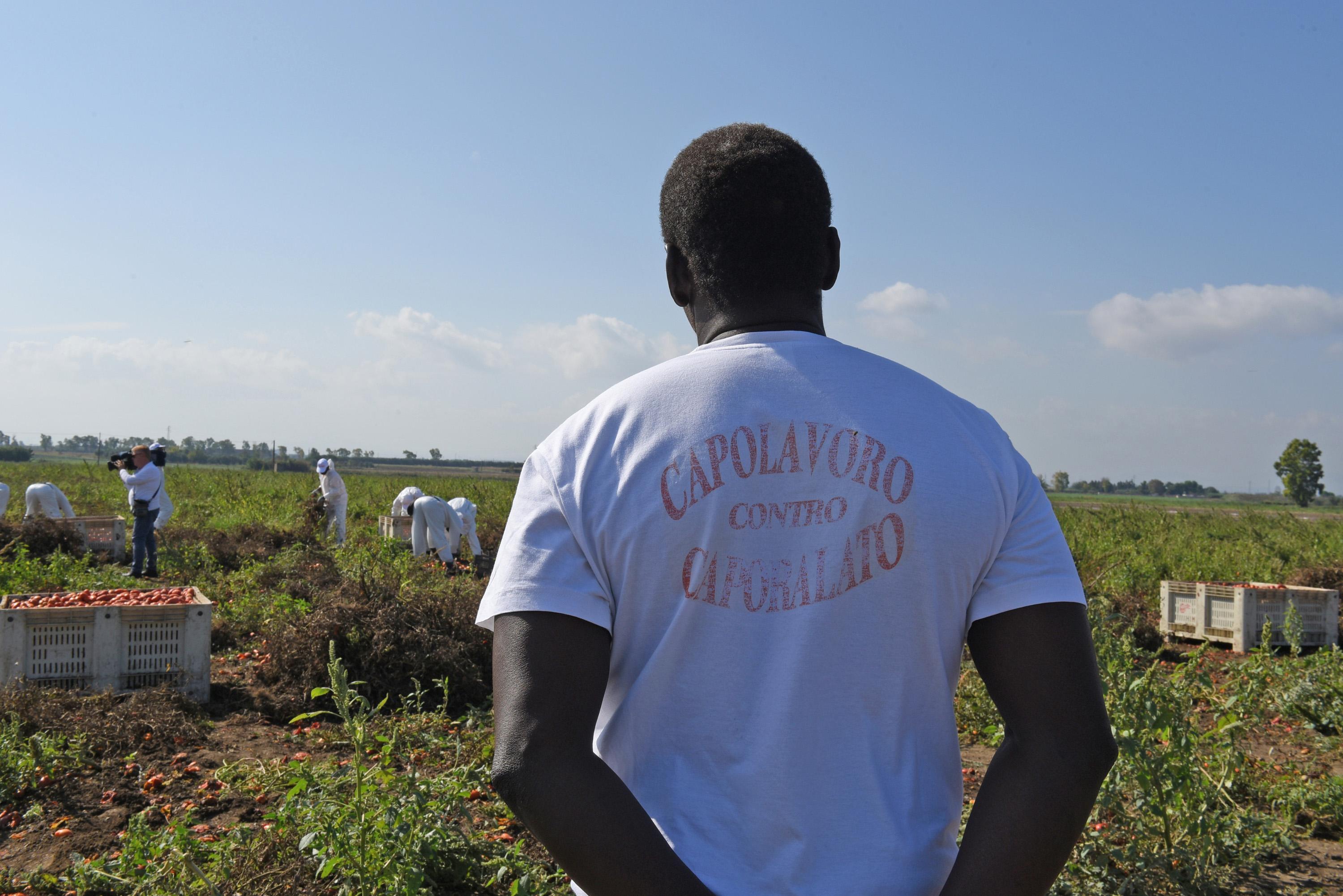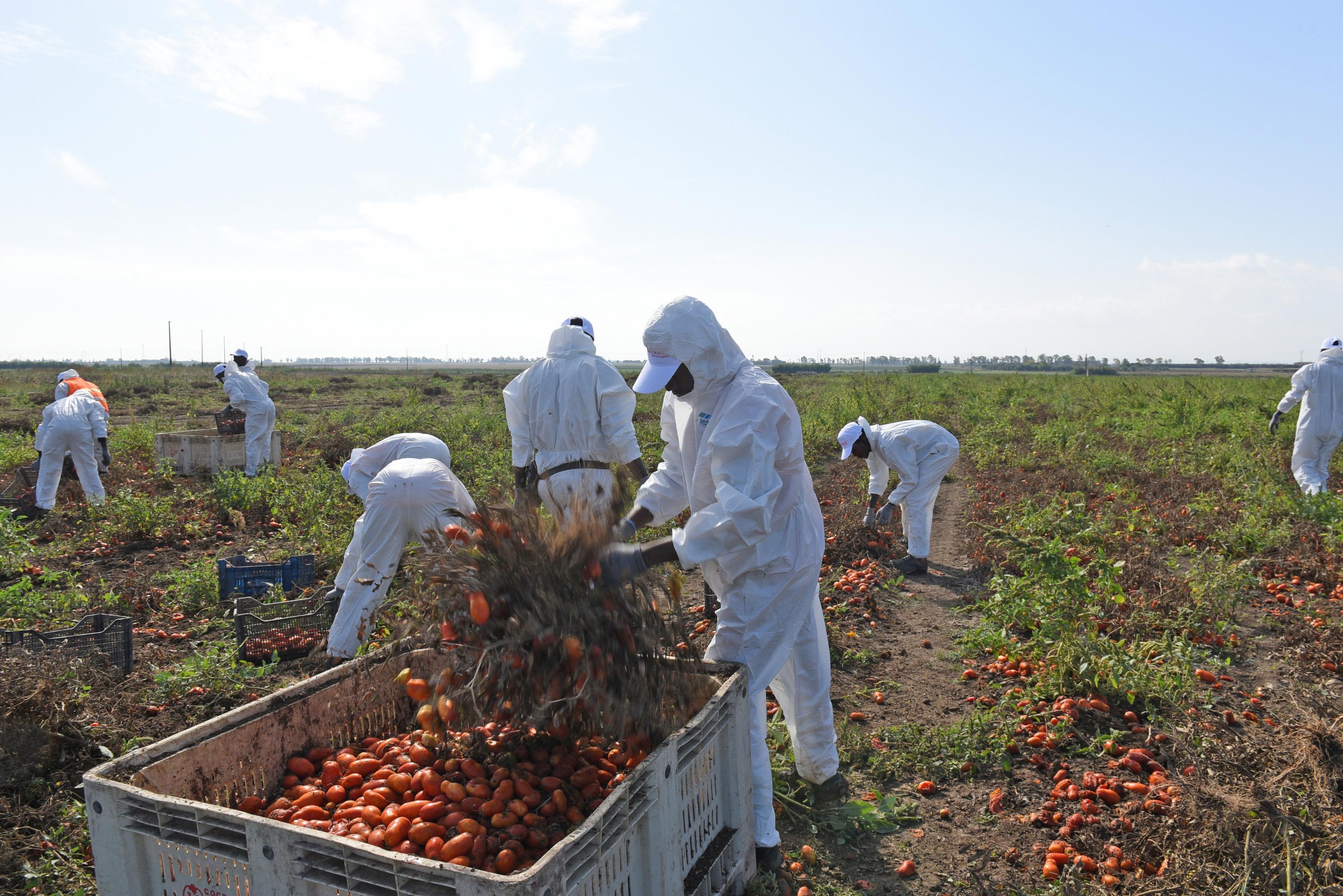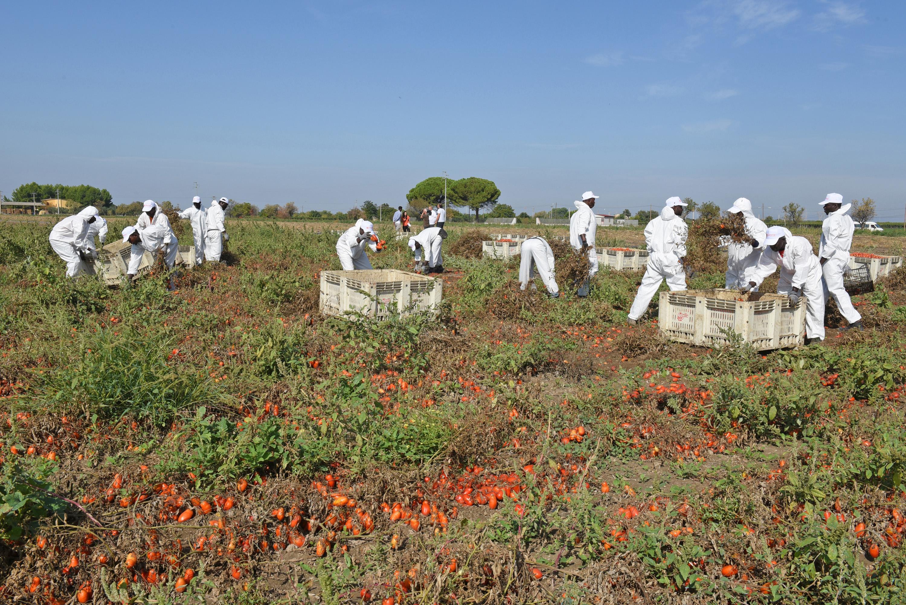Nelle foto, alcuni lavoratori del Gruppo Megamark di Trani mentre raccolgono i pomodori a Foggia. Infatti, parte dalle campagne del Foggiano la prima filiera etica in Italia contro il caporalato. I prodotti, 5 tipi di conserve di pomodori biologici, frutta e verdura, sono contrassegnati dal bollino etico ‘NoCap’. È un progetto sperimentale nato dall’intesa tra il Gruppo Megamark di Trani (Bat), l’associazione internazionale anticaporalato NO CAP e Rete Perlaterra. (foto Ansa)