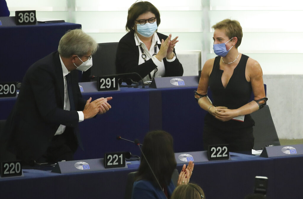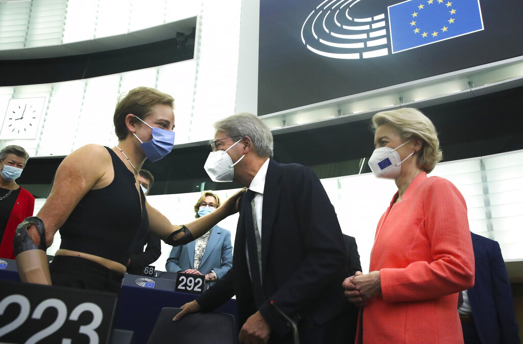 Nella sala del Parlamento si trovava anche la sportiva paralimpica Bebe Vio, a cui la presidente ha fatto riferimento come esempio di tenacia, ispirazione e «spirito della prossima generazione dell’Europa». (Yves Herman, Pool via AP)