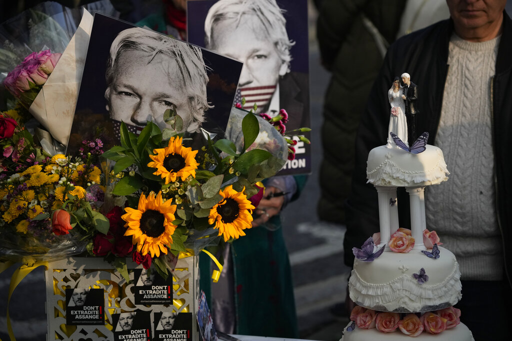 Il 23 marzo 2022 Julian ha sposato Stella Moris all’interno della prigione di alta sicurezza di Belmarsh, nel sud-est di Londra, dove è detenuto dal 2019. Precedentemente aveva trascorso sette anni all’interno dell’ambasciata ecuadoriana a Londra. (AP Photo/Alastair Grant)