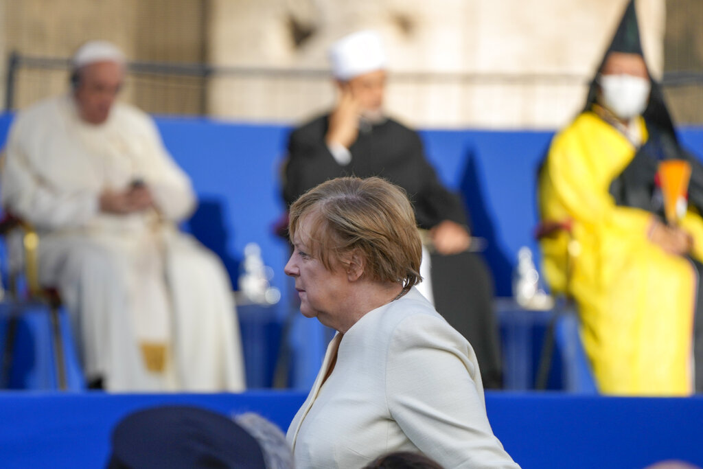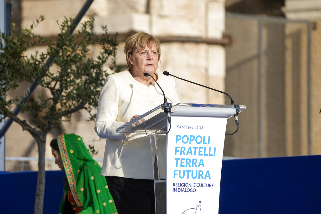 La giornata di giovedì 7 ottobre si è conclusa con l’incontro “Popoli fratelli, Terra futura” organizzato dalla Comunità di Sant’Egidio presso il Colosseo. Nel senno del convegno si è svolta una preghiera ecumenica presieduta da papa Francesco, chi ha rilanciato l’appello per la pace. “Deve sorgere la coscienza che l’umanità è una”, ha intervenuto la cancelliera, che considera indispensabile la comprensione reciproca delle persone, l’apertura, la tolleranza e il dialogo rispettoso. Foto: AP/Gregorio Borgia e Andrew Medichini