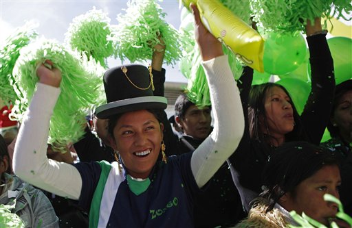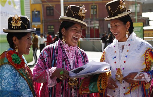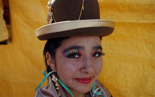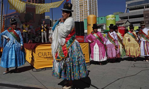 Diciassette donne aymara, vestite con i coloratissimi abiti tradizionali e il tipico cappello a bombetta sulla testa, partecipano, danzando accompagnate da musica folk, all'annuale concorso di bellezza a La Paz, in Bolivia, voluto dall'Ufficio per la promozione del folclore e delle arti popolari (foto Ap).