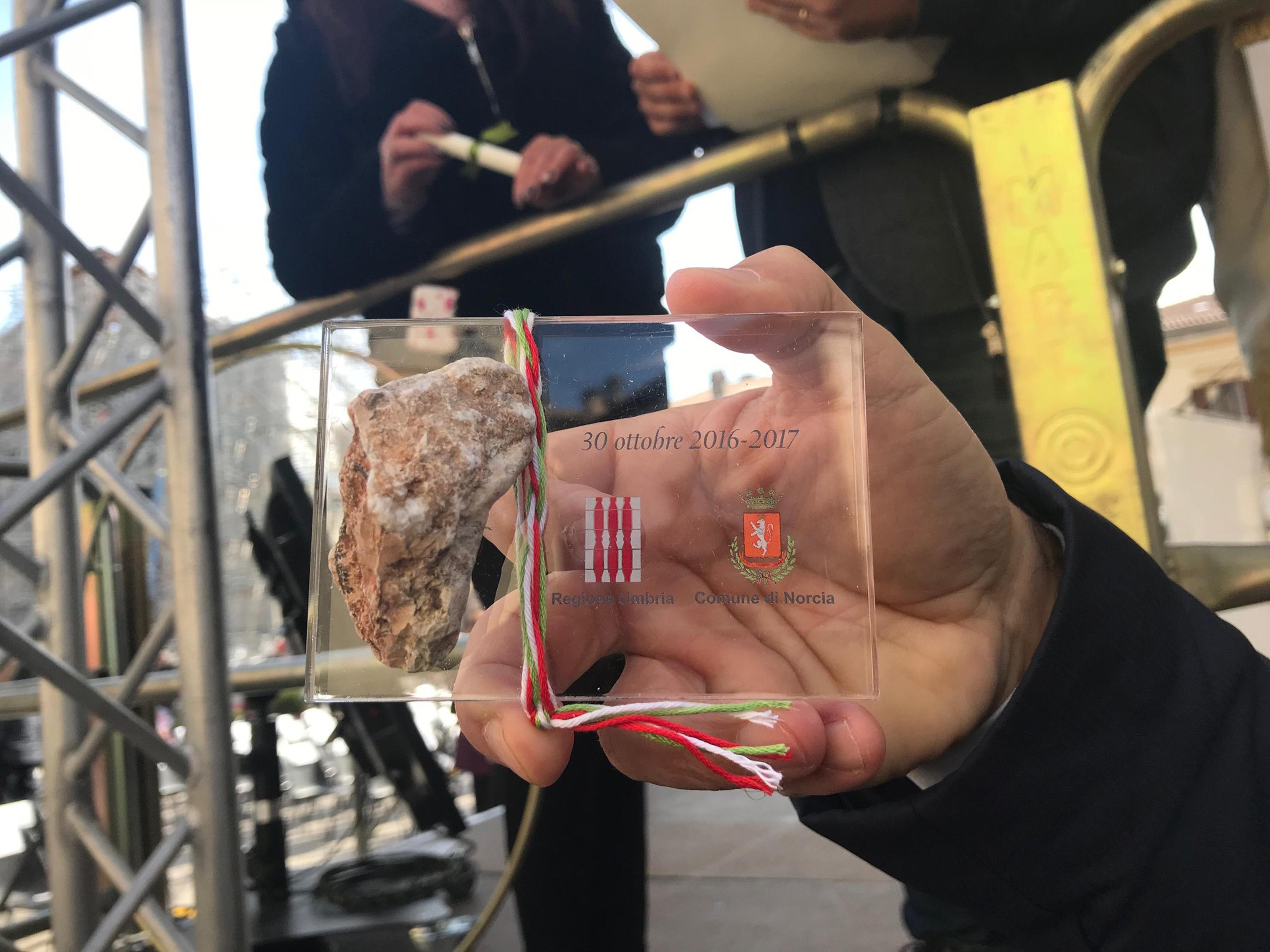 Il sindaco di Norcia Nicola Alemanno ha donato pietre delle macerie di Norcia agli esponenti del mondo istituzionale, alle forze dell’ordine e alle associazioni del volontariato.