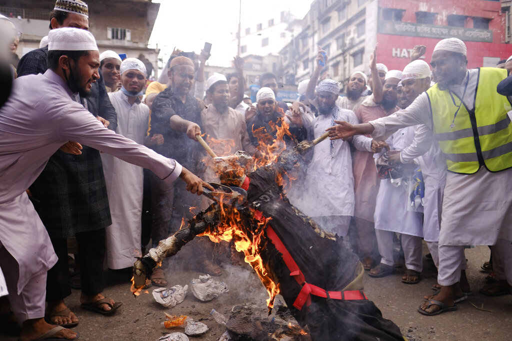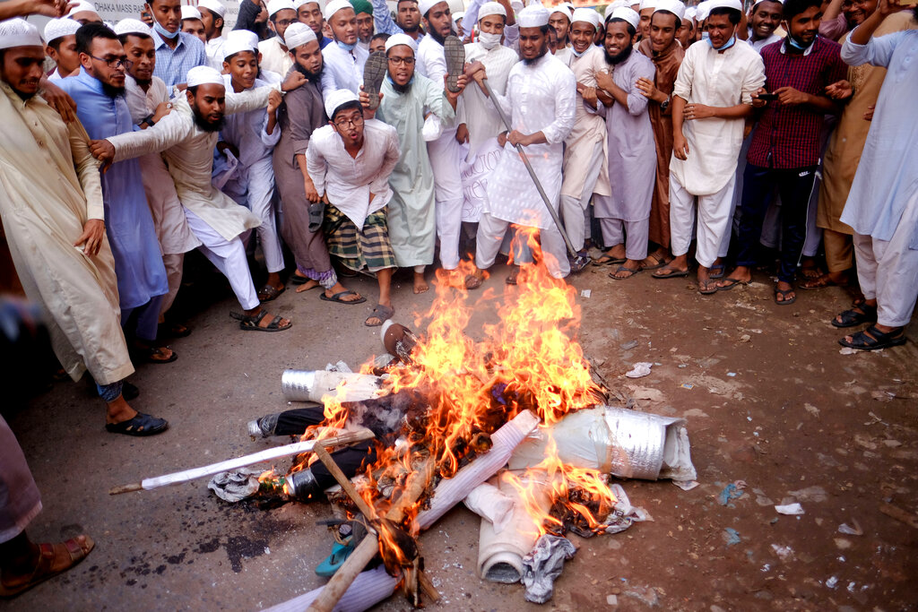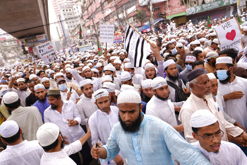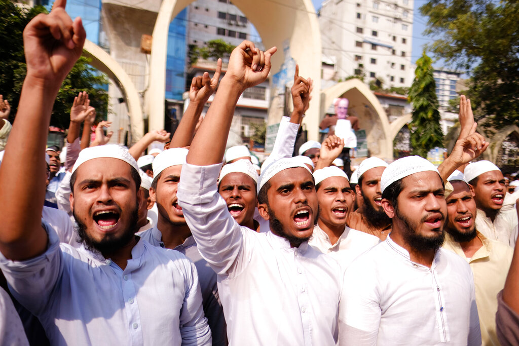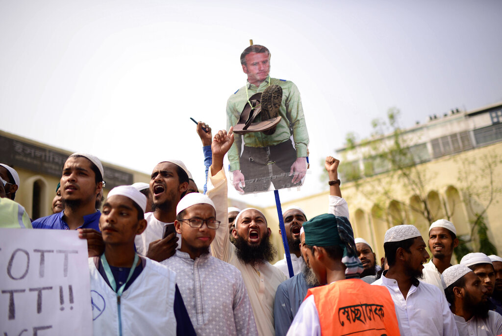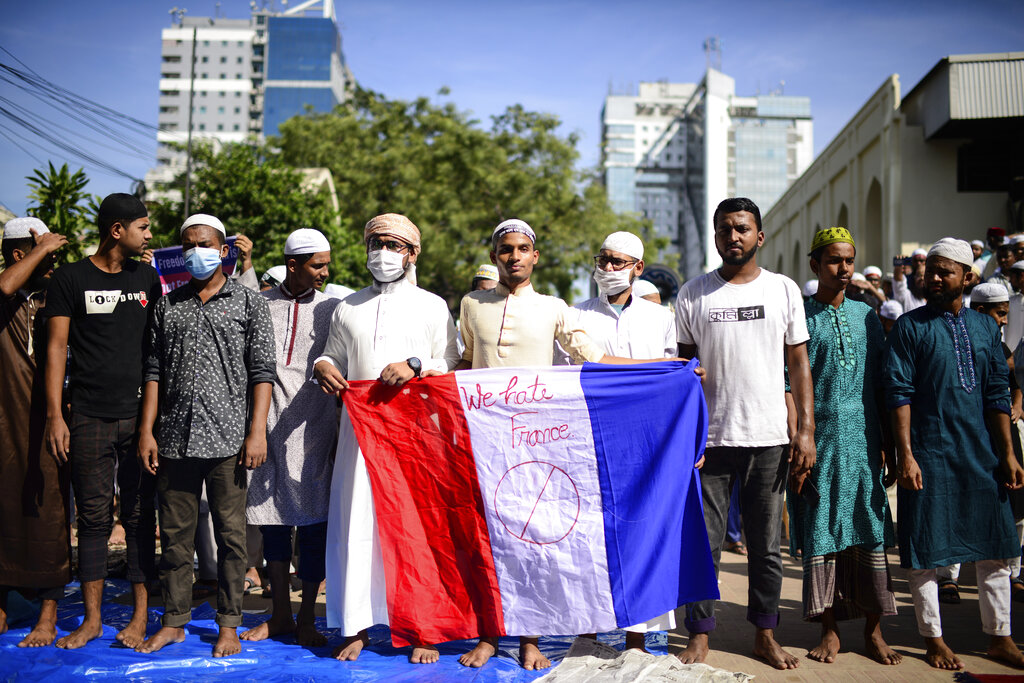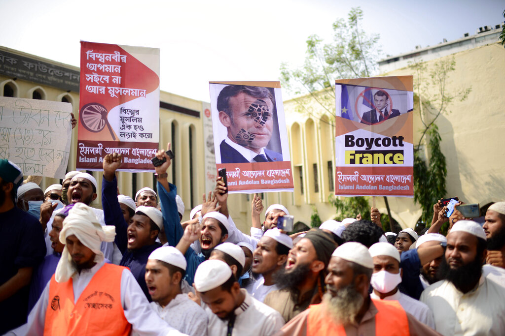 In piazza per boicottare i prodotti francesi. E’ questa la richiesta delle 50mila persone scese in piazza a Dacca, in Bangladesh, come riportano le forze dell’ordine. Non è bastato il terribile attentato di Nizza, un ennesimo corteo di protesta è andato in scena dopo che il presidente francese Emanuel Macron ha difeso la libertà d’espressione e il diritto di pubblicare vignette su Maometto. I manifestanti stavano rispondendo all’appello di Hefazat-e-Islam, uno dei principali gruppi islamisti del Paese. Le forze dell’ordine hanno impedito loro di avvicinarsi troppo alla sede dell’ambasciata francese. Questa è la terza manifestazione contro la Francia in Bangladesh, un paese di 160 milioni di abitanti principalmente musulmani (AP Photo/Mahmud Hossain Opu).