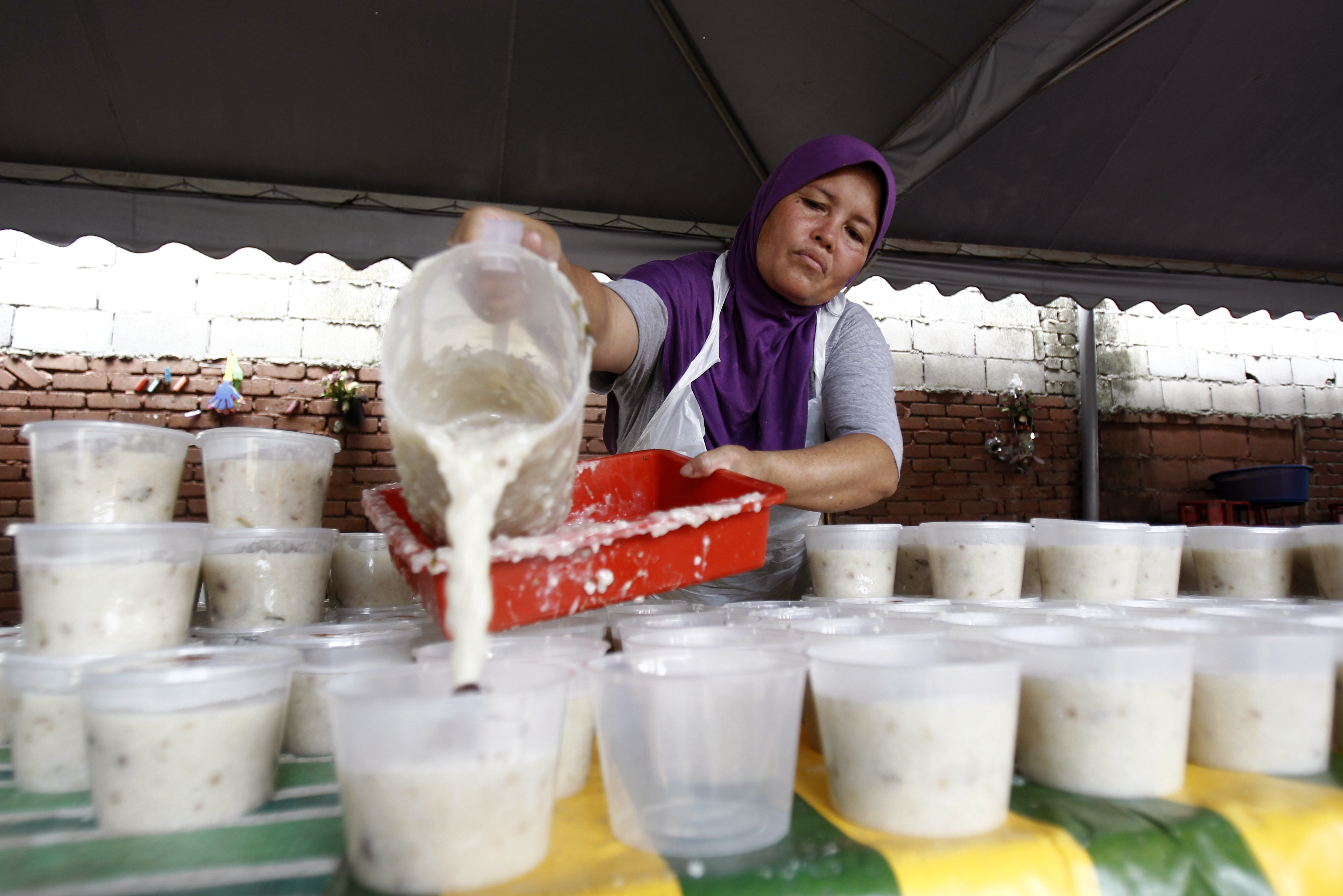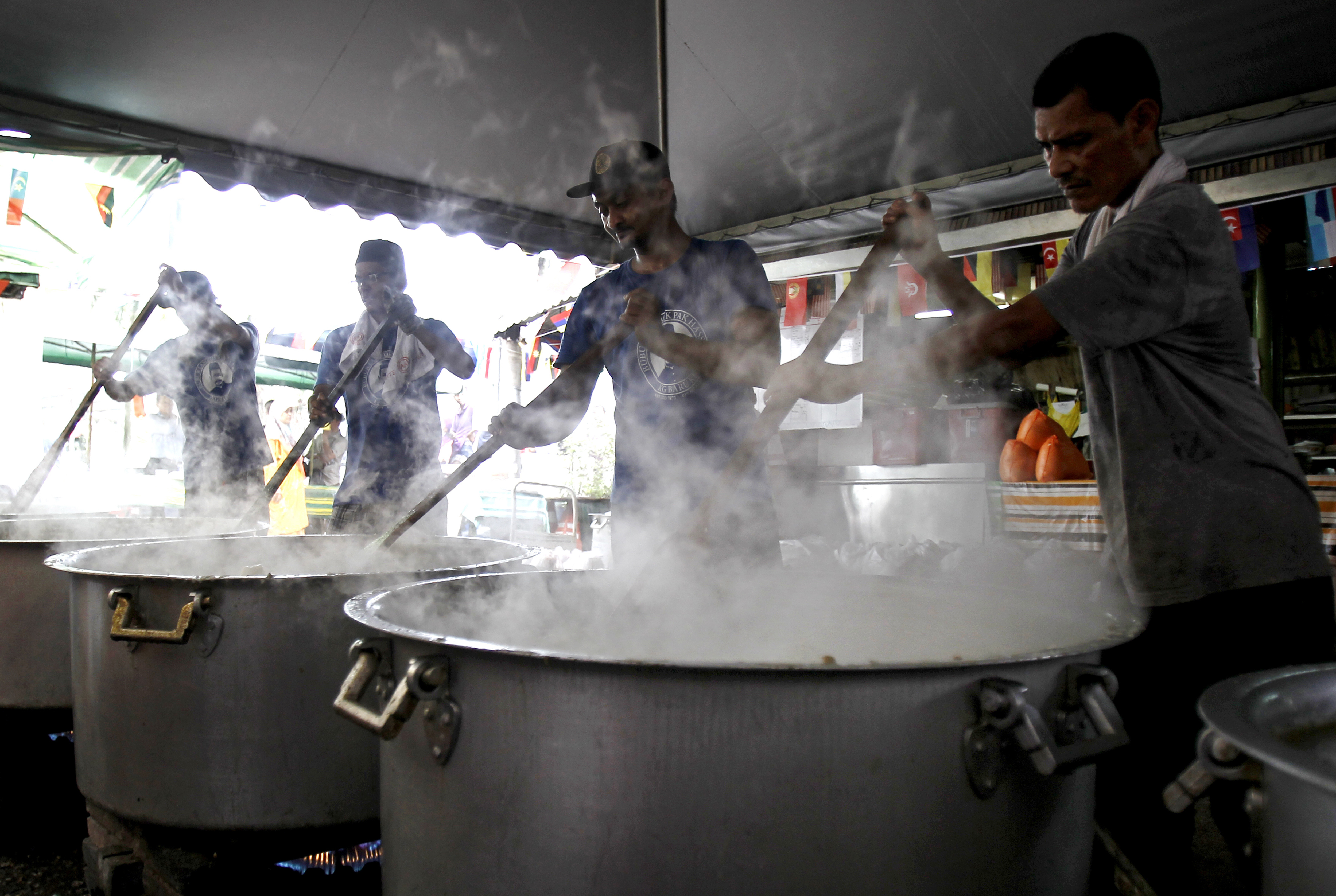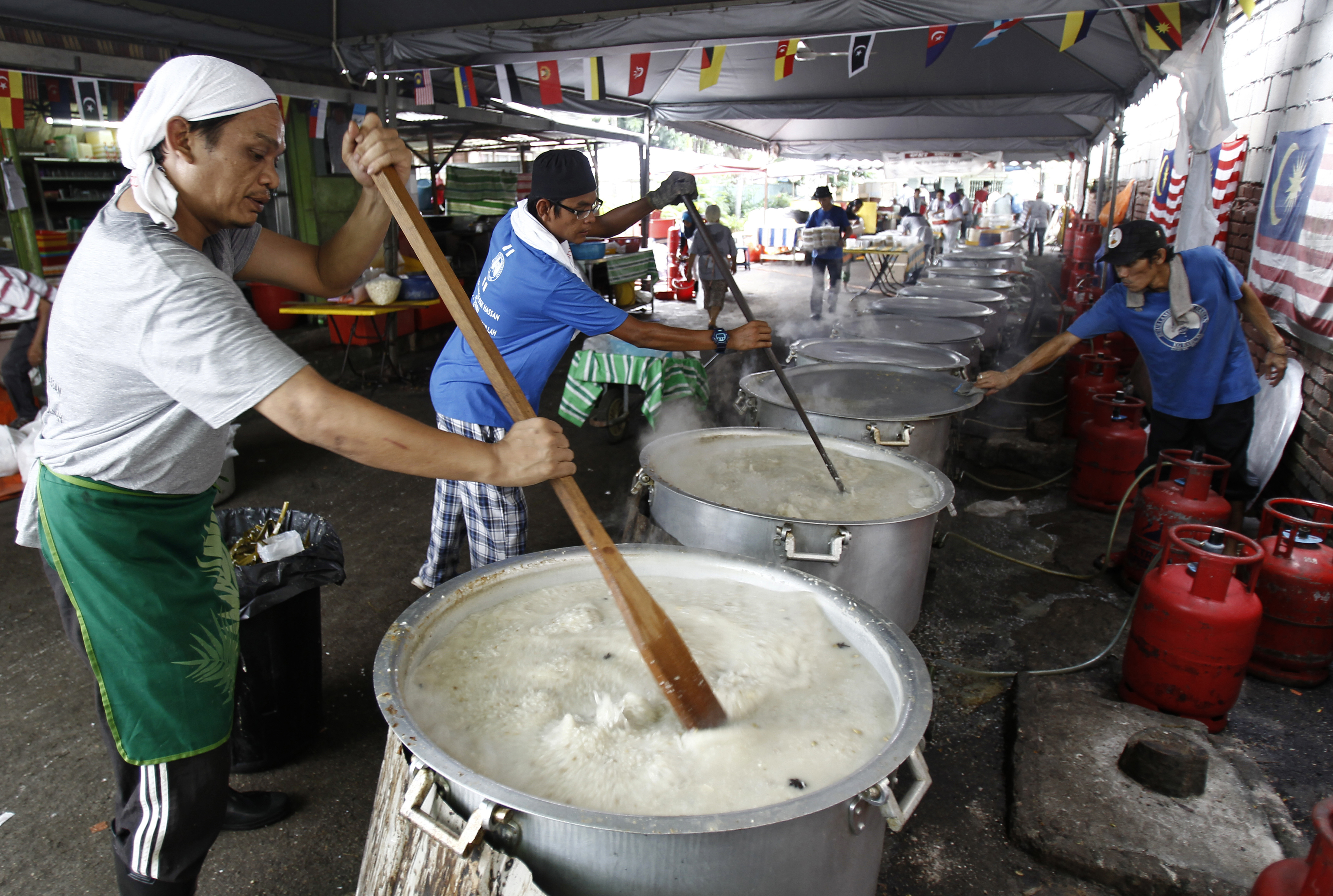 Nelle tre immagini seguenti ci spostiamo in Malesia: qui è tradizione rompere il digiuno con il Bubur Lambuk, una sorta di minestra di riso molto densa, cucinata per tutta la comunità all’interno di grandi pentoloni e distribuita in grandi bicchieri.