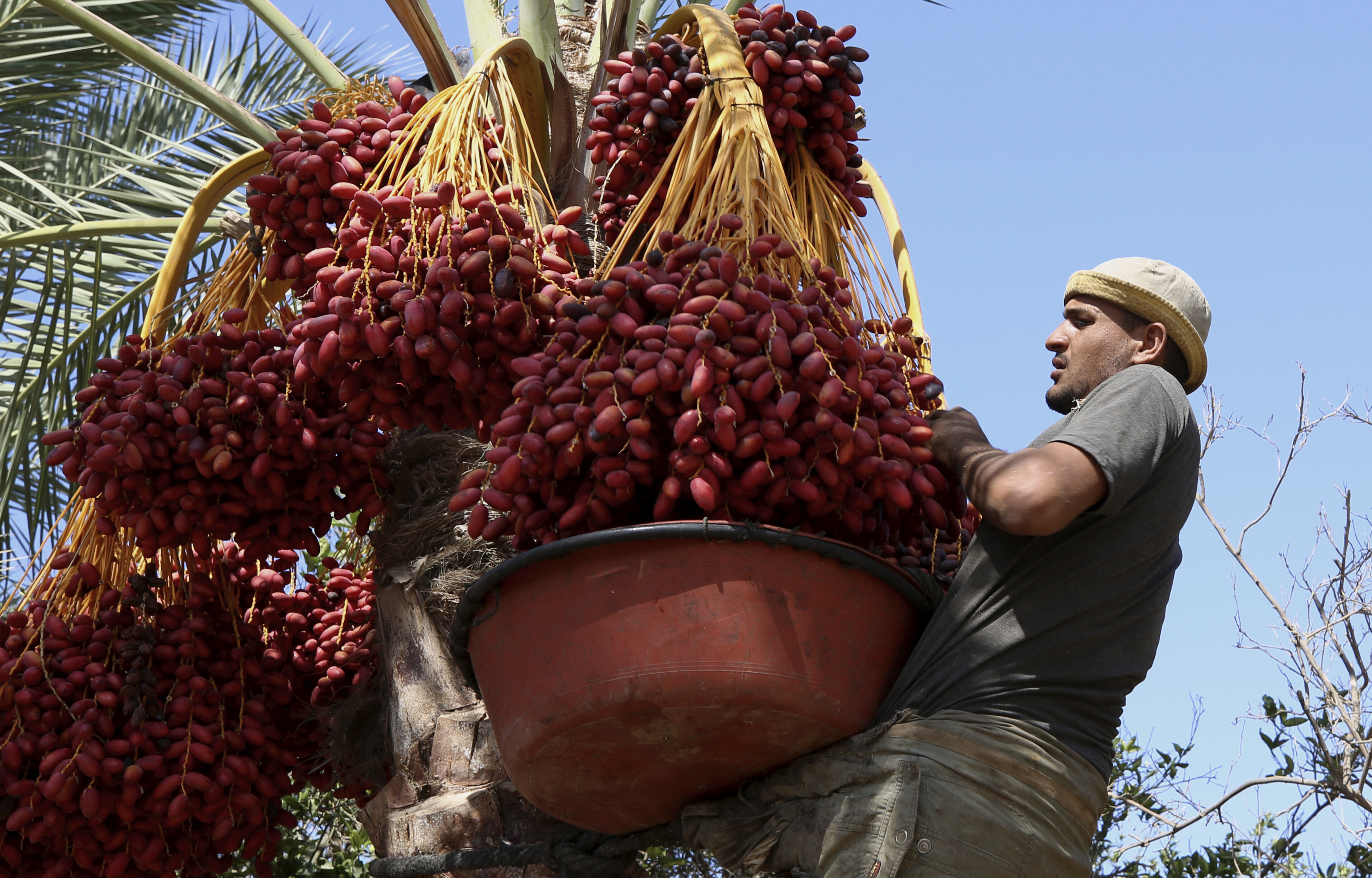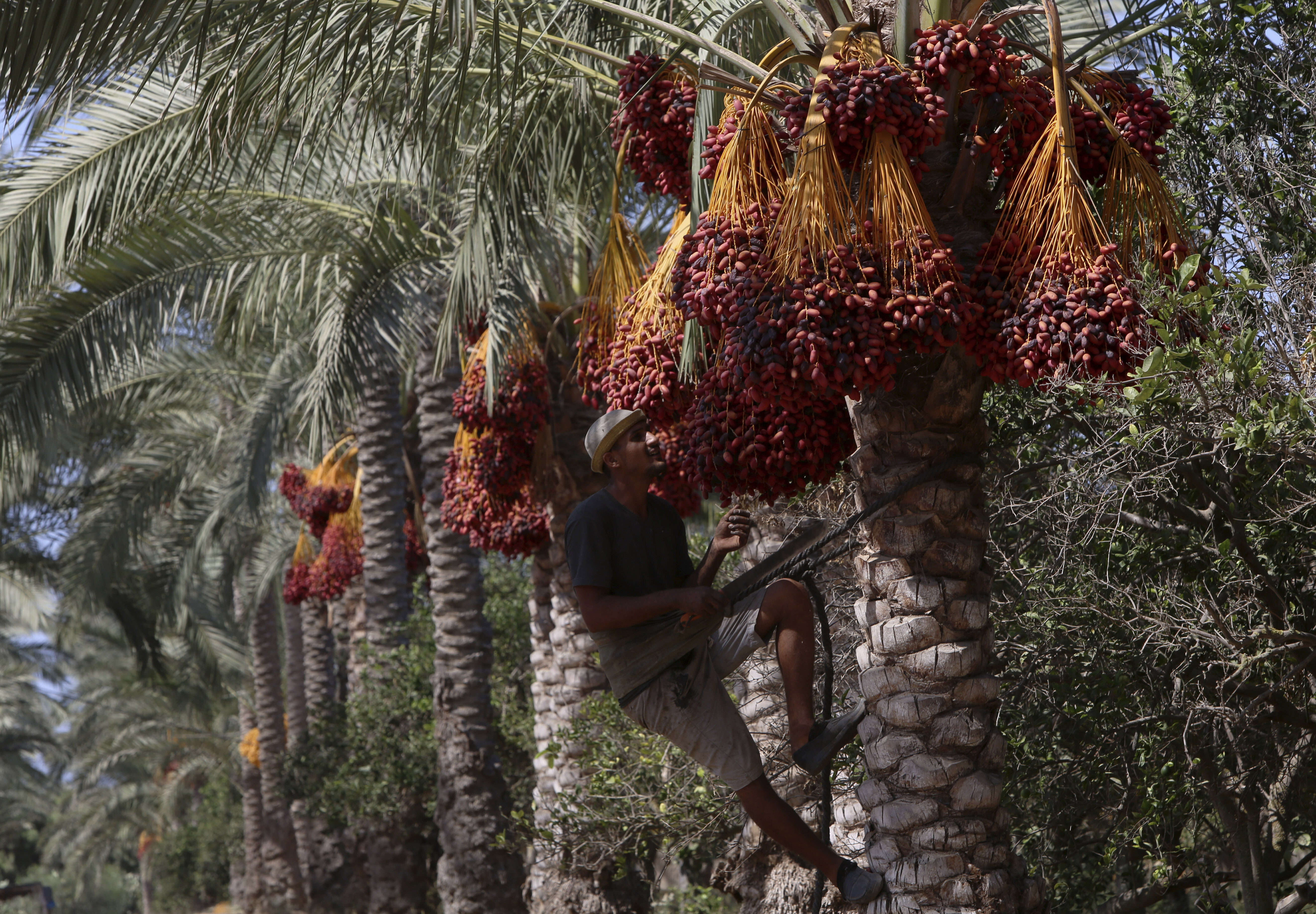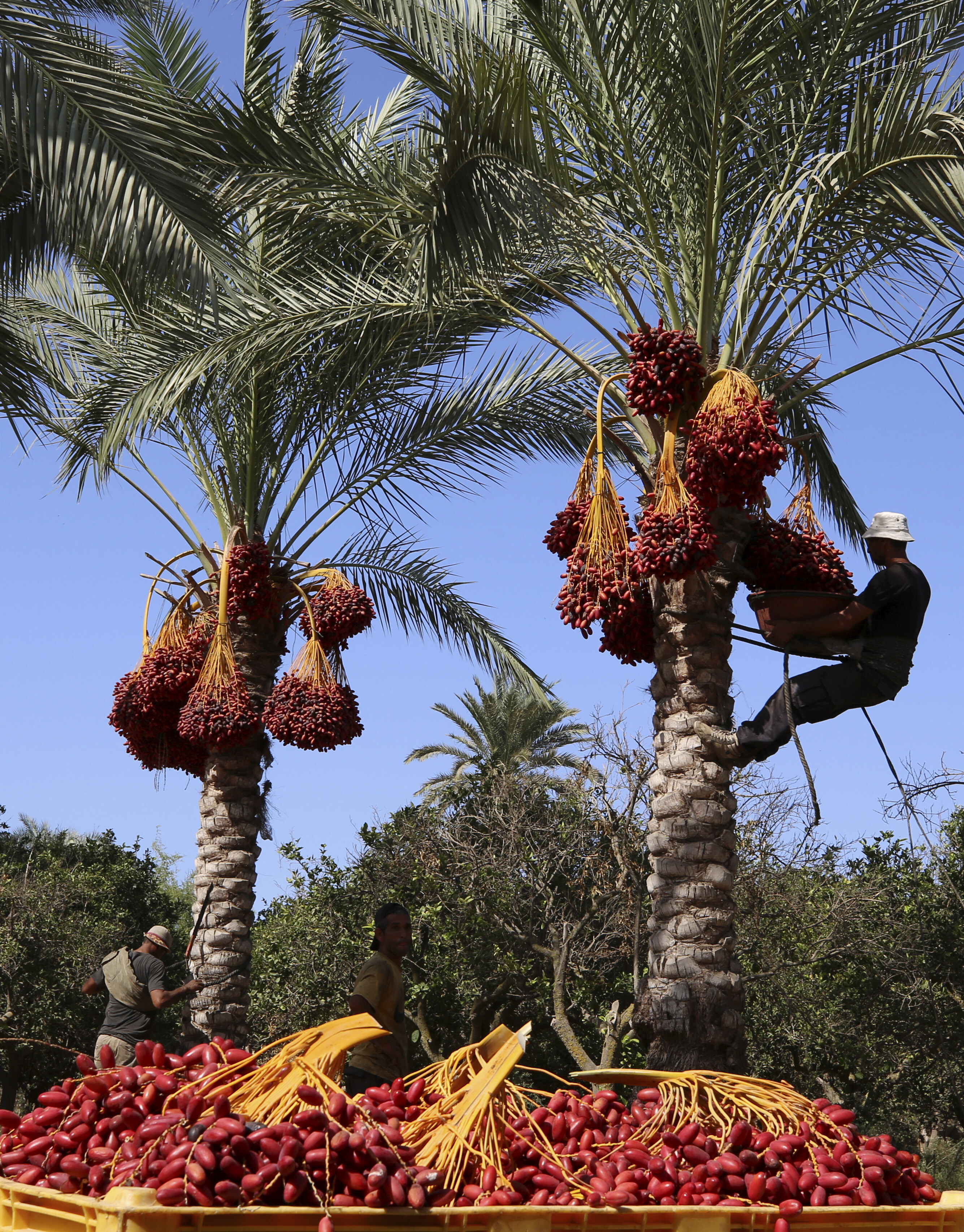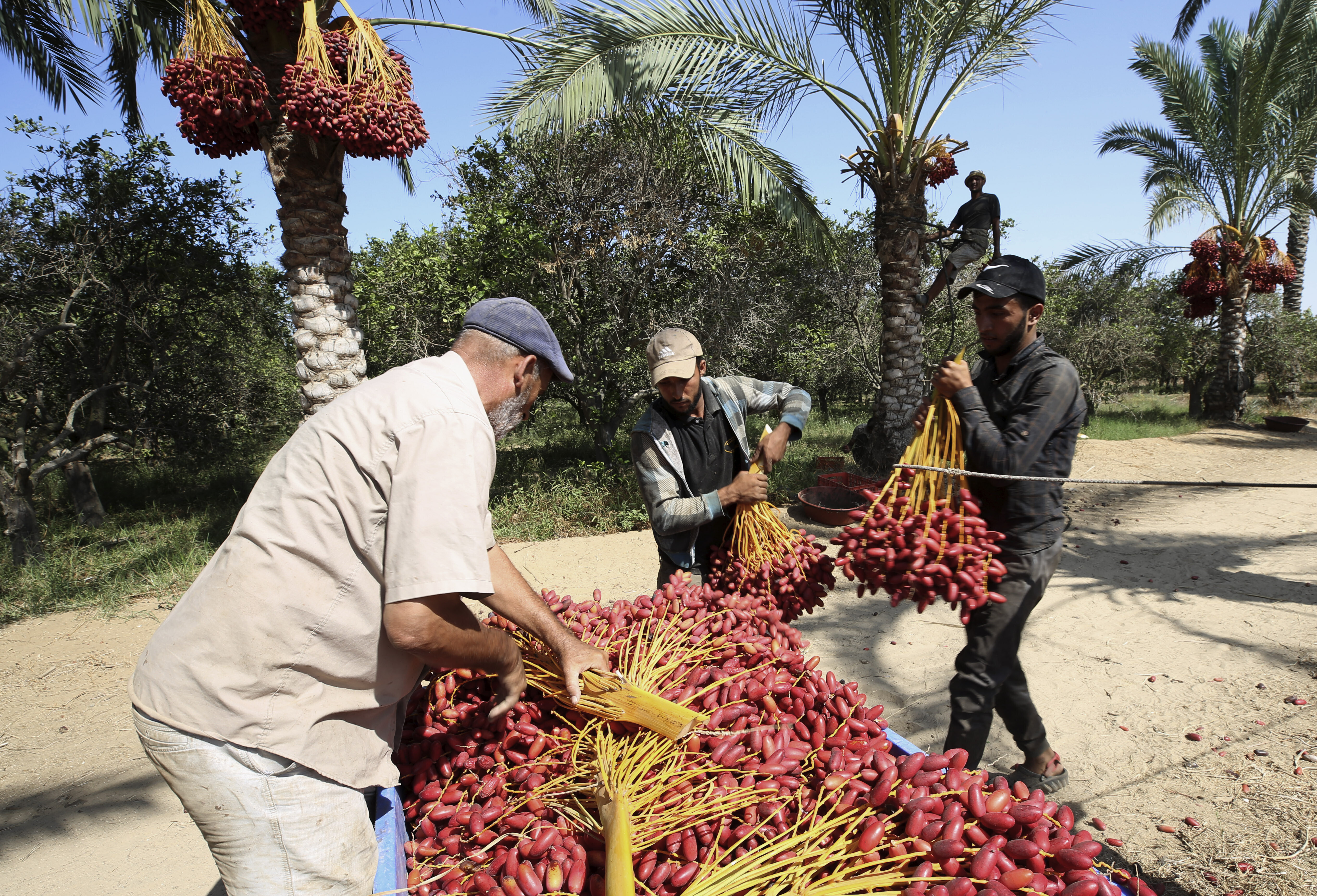 Nella striscia centrale di Gaza, la raccolta dei datteri parte di solito all’inizio di ottobre, dopo la prima pioggia. I palmeti sono piantati soprattutto dai palestinesi, ma c’è il problema della mancanza di acqua, visto che scavare pozzi non si potrebbe e le terre ben irrigate sono poche e già occupate (Foto AP / Adel Hana)