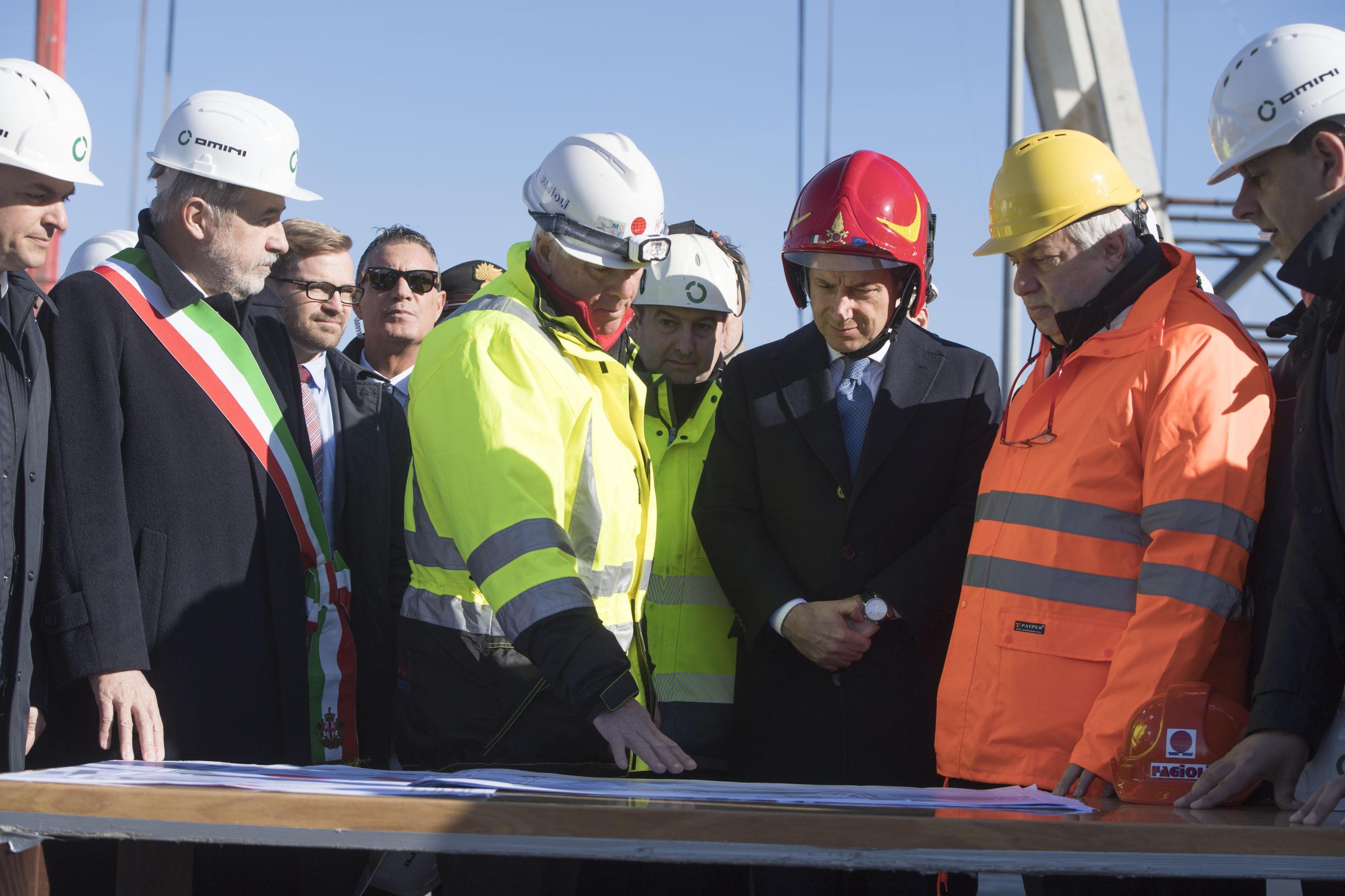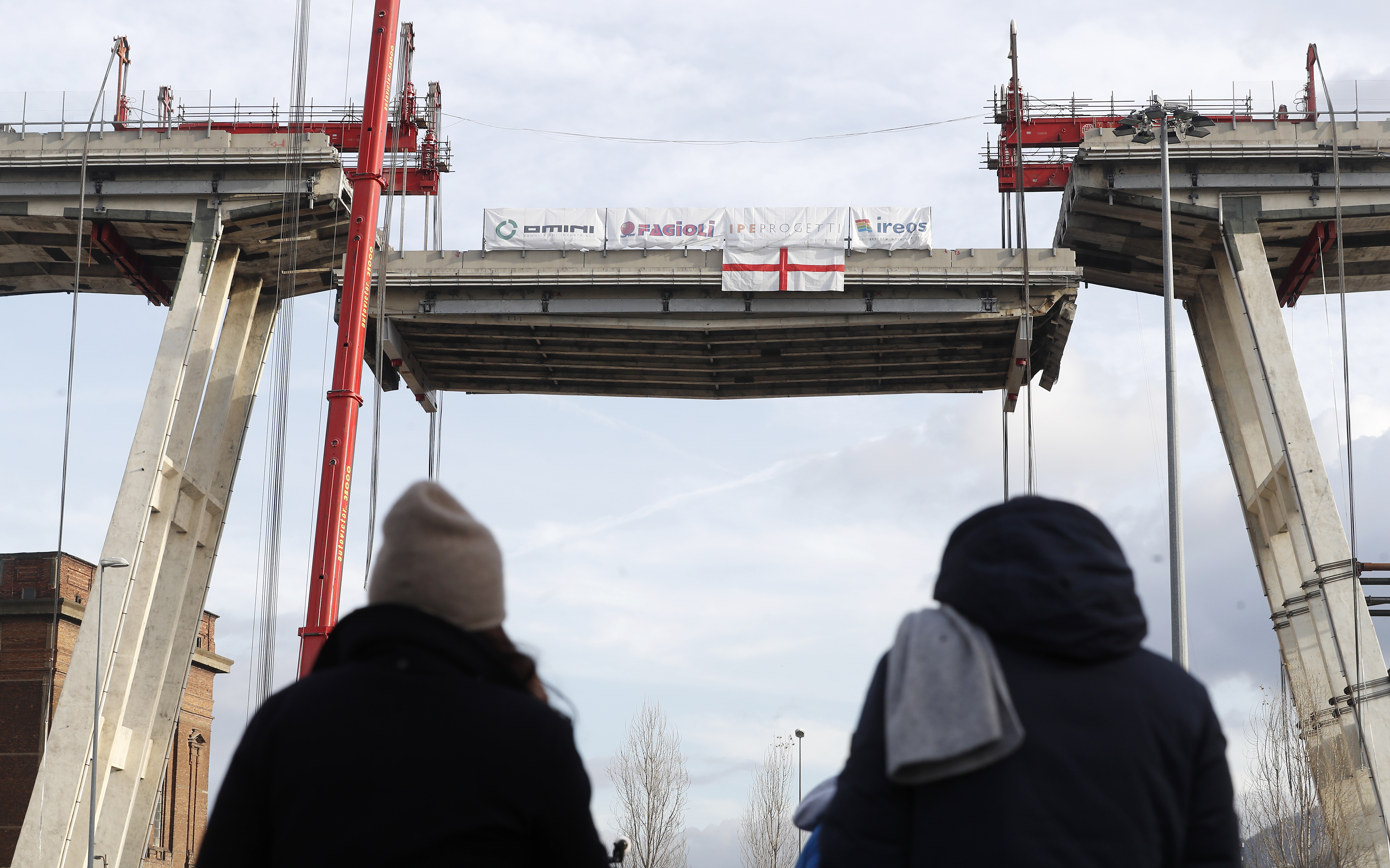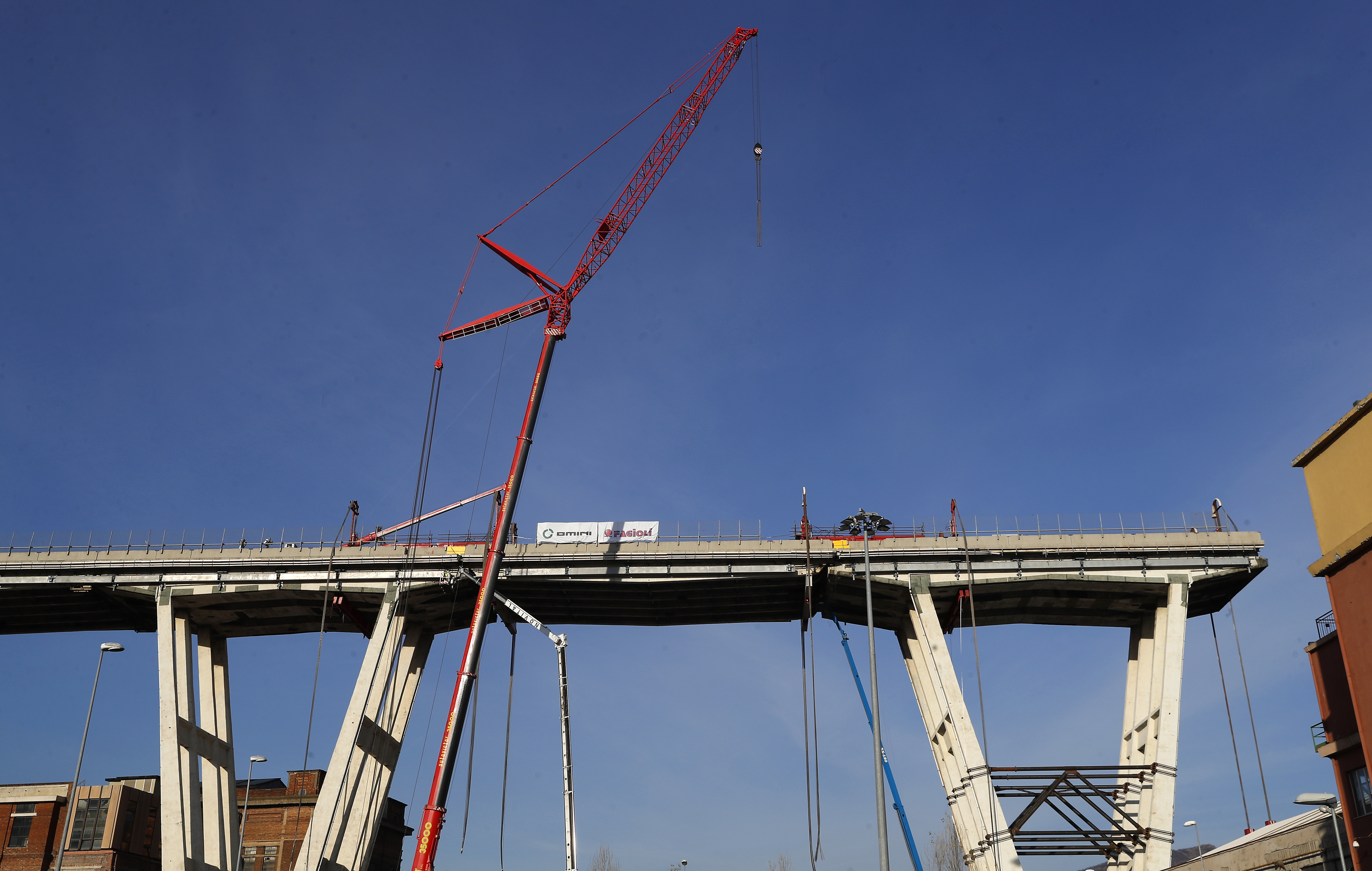 Le gru sono al lavoro per demolire la prima sezione del ponte Morandi, il moncone ovest, i primi 40 metri da smontare dopo 6 mesi dal crollo. Ieri il premier Conte ha inaugurato i lavori: «Un momento di riscatto per l’Italia». Renzo Piano sarà il supervisore dell’intero progetto realizzato dalla ditta Salini-Impregilo. Il ponte dovrà essere percorribile ad aprile 2020, lo ha annunciato il sindaco di Genova e commissario per la ricostruzione del viadotto Polcevera, Marco Bucci. (foto Ansa/Ap)