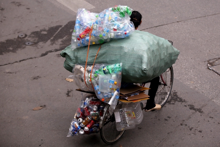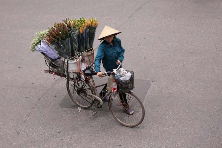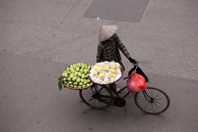 Venditori ambulanti solcano le vie della capitale in Vietnam: abiti, cereali, frutta, fiori, bottiglie in plastica le merci da vendere. L'economia del Paese, secondo i dati ufficiali, è in difficoltà: il Pil è in calo di 6,12 punti percentuali rispetto al primo trimestre del 2015 (foto Ansa).
