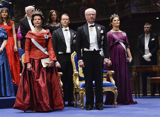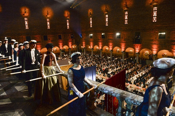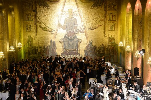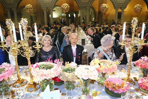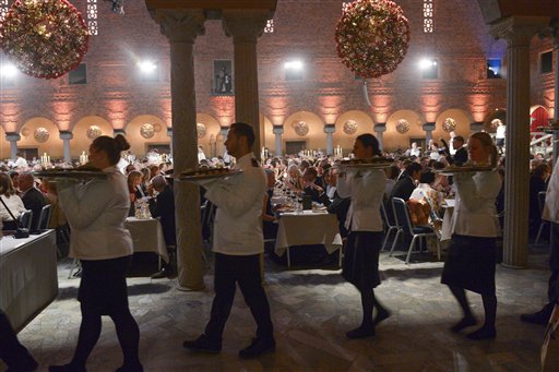 È sembrato uno spettacolo d'altri tempi quello che ha visto banchettare il 10 dicembre re e regine, principi e principesse su tavoli lunghissimi e riccamente imbanditi con rose (donate dal comune di Sanremo). Al palazzo comunale di Stoccolma infatti si è svolta la rituale cena in onore della cerimonia dei Premi Nobel con 1300 selezionatissimi invitati. (foto Ansa e Ap)