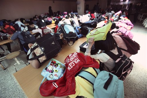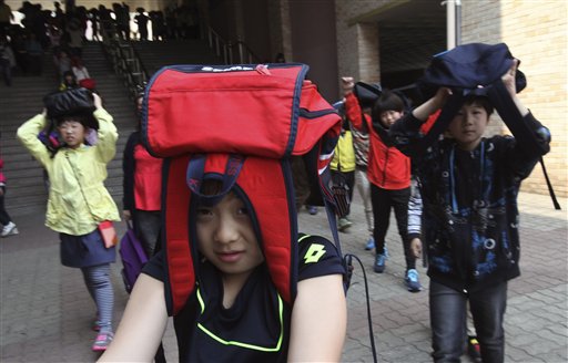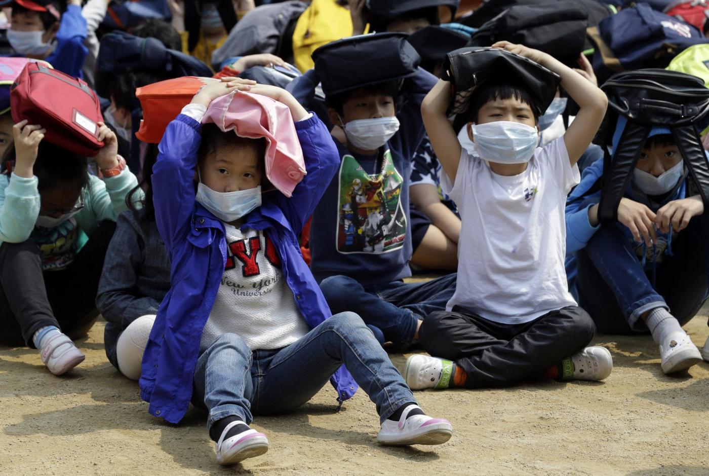 In una scuola elementare della Corea del Sud, situata a Paju, al confine con la Corea del Nord, i piccoli studenti si esercitano a scappare in caso di attacco aereo: una nuova procedura di sicurezza che si affianca a quelle "solite" da mettere in atto in caso di terremoti ed eventi terroristici. Ma riuscirà uno zaino a difendere la vita di un bambino dalle bombe? (foto LaPresse)
