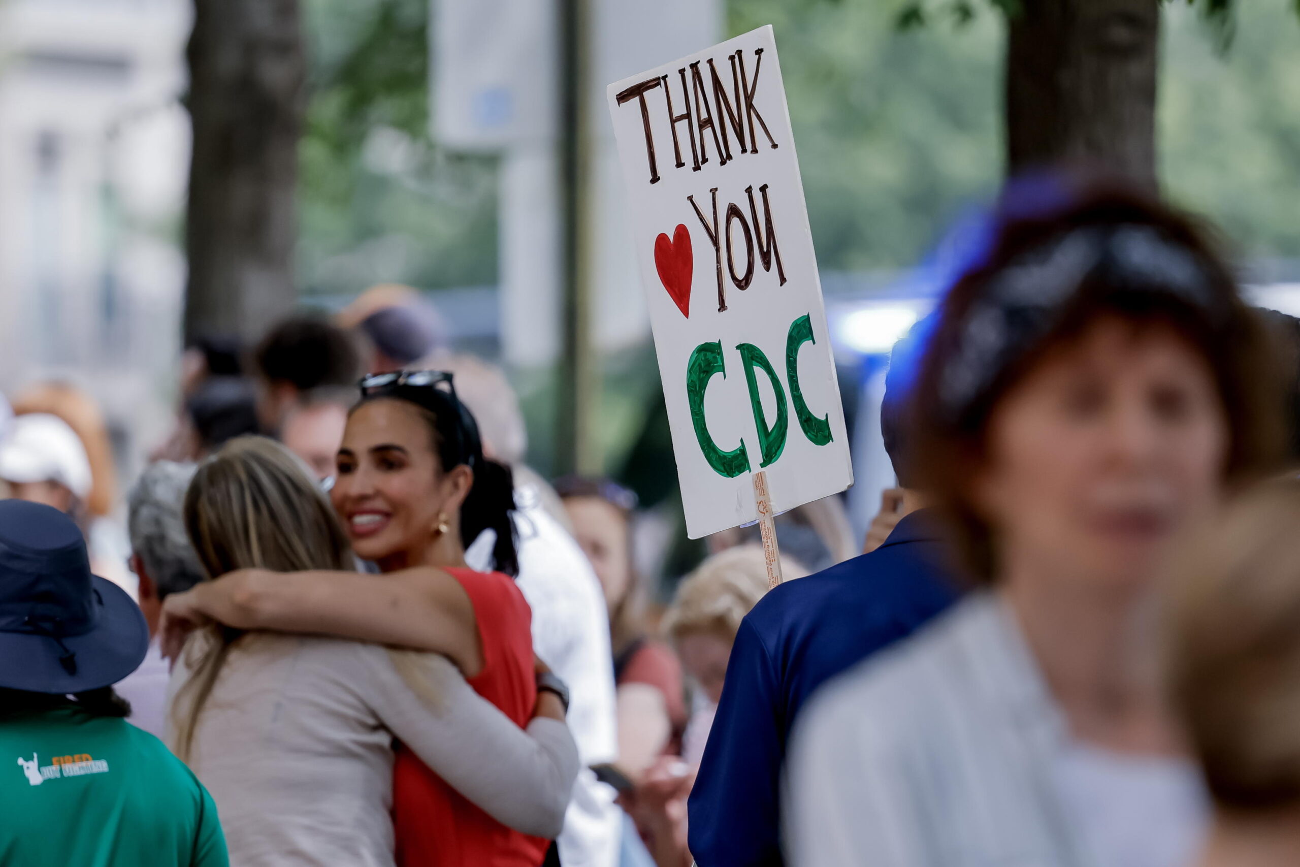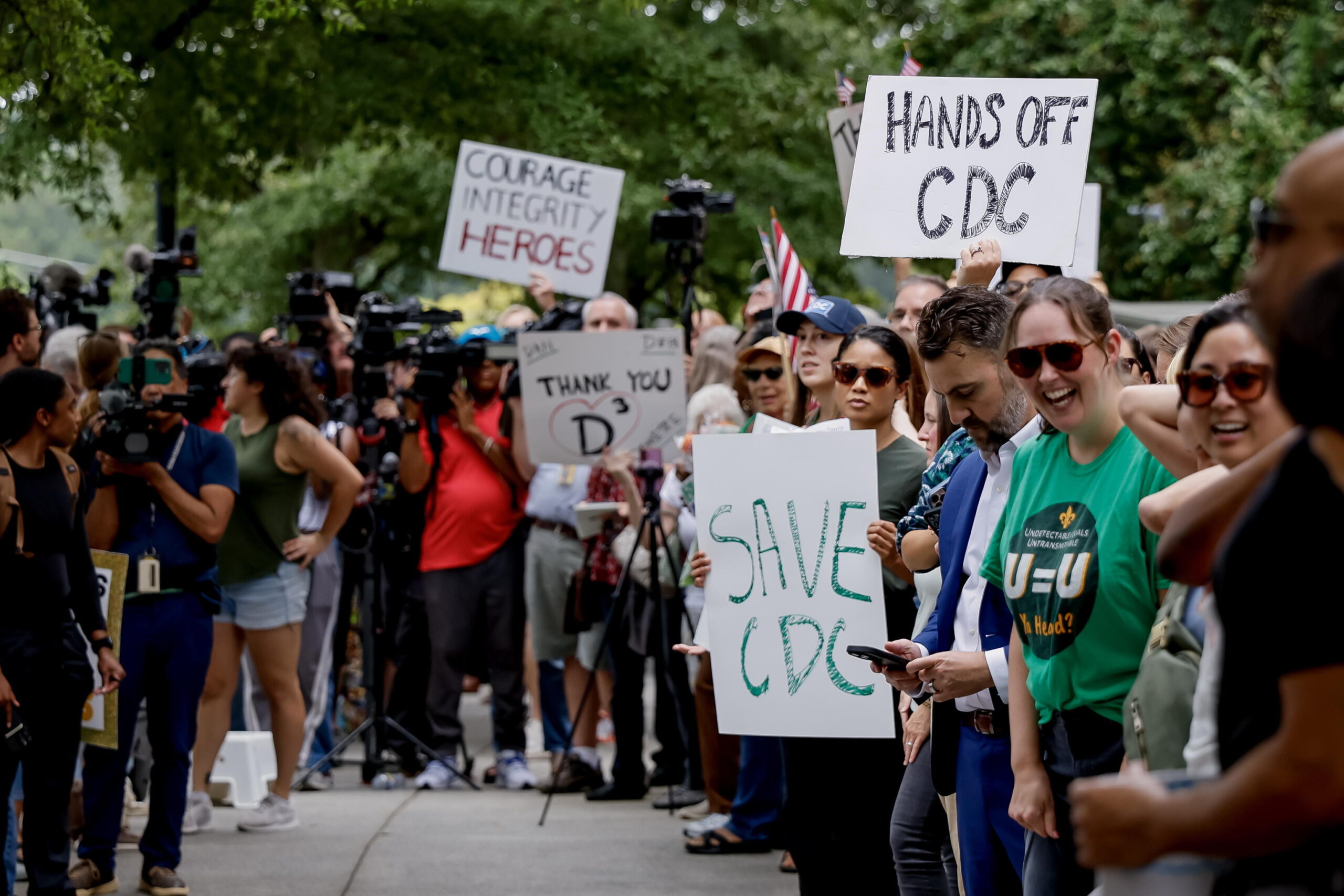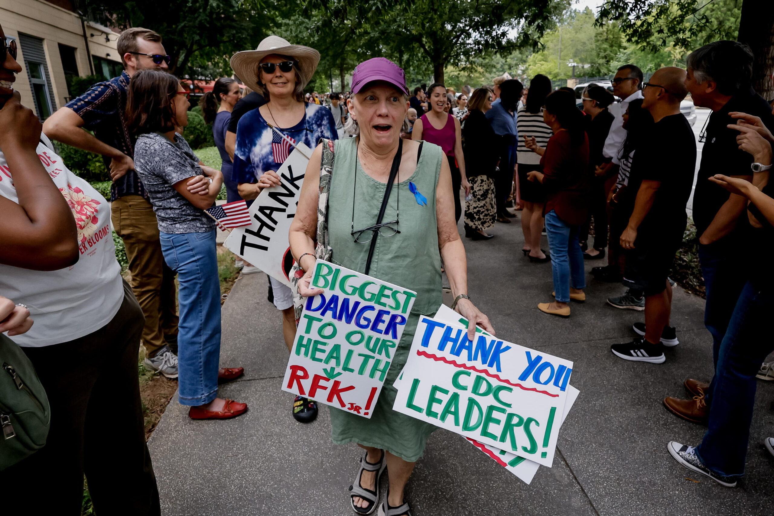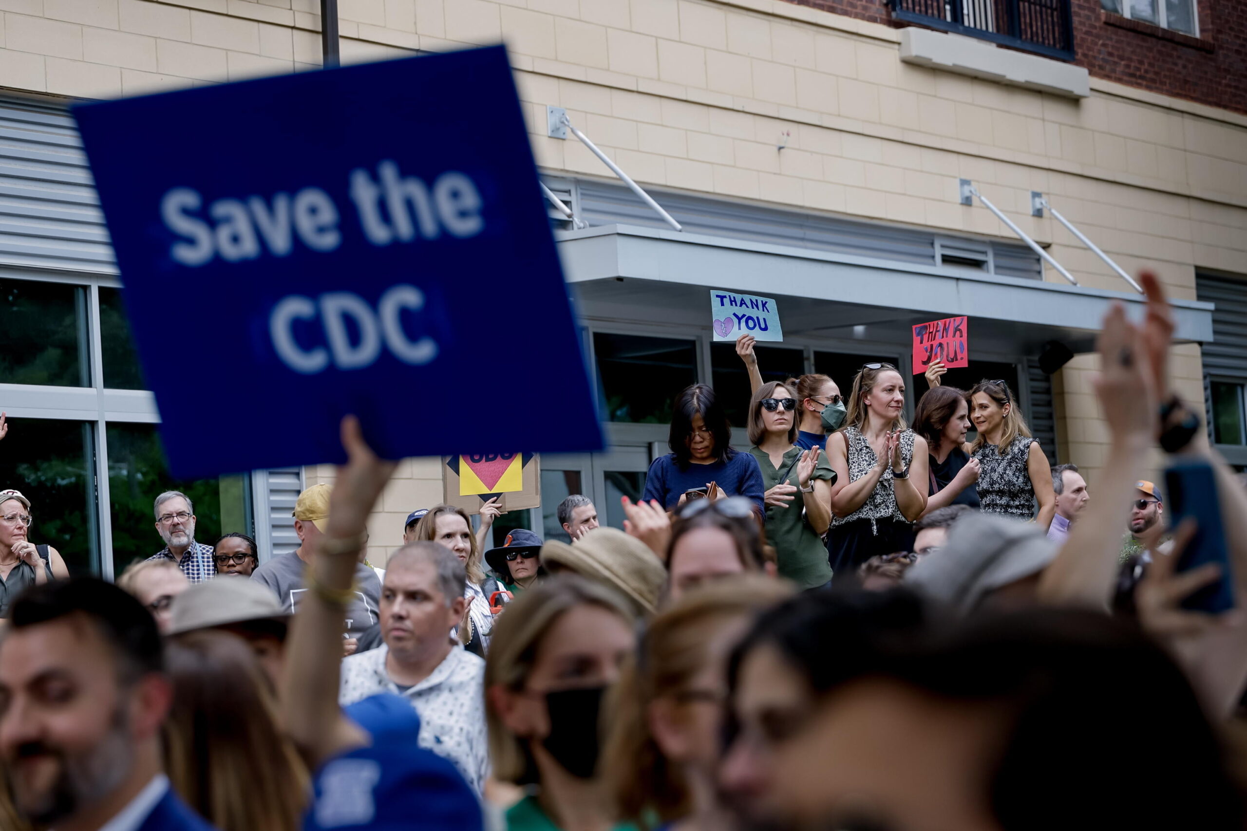 Nelle foto si vede una delle proteste tenutesi il 28 agosto alla sede del CDC ad Atlanta, a sostegno della direttrice licenziata e dei dimissionari.