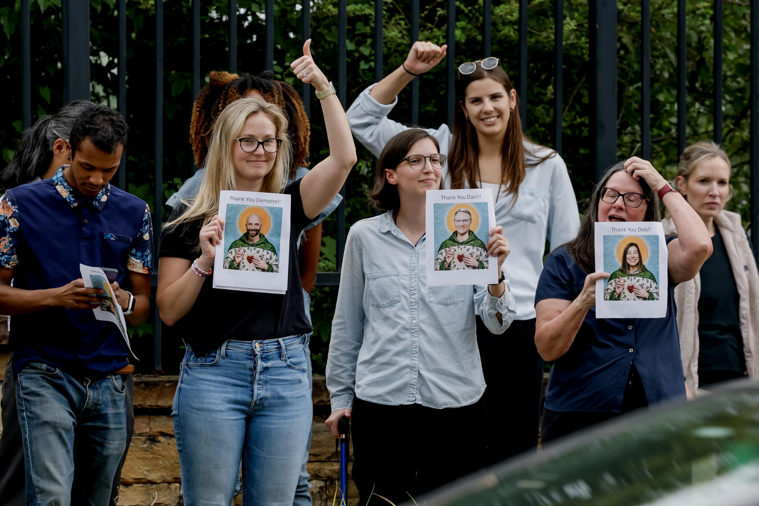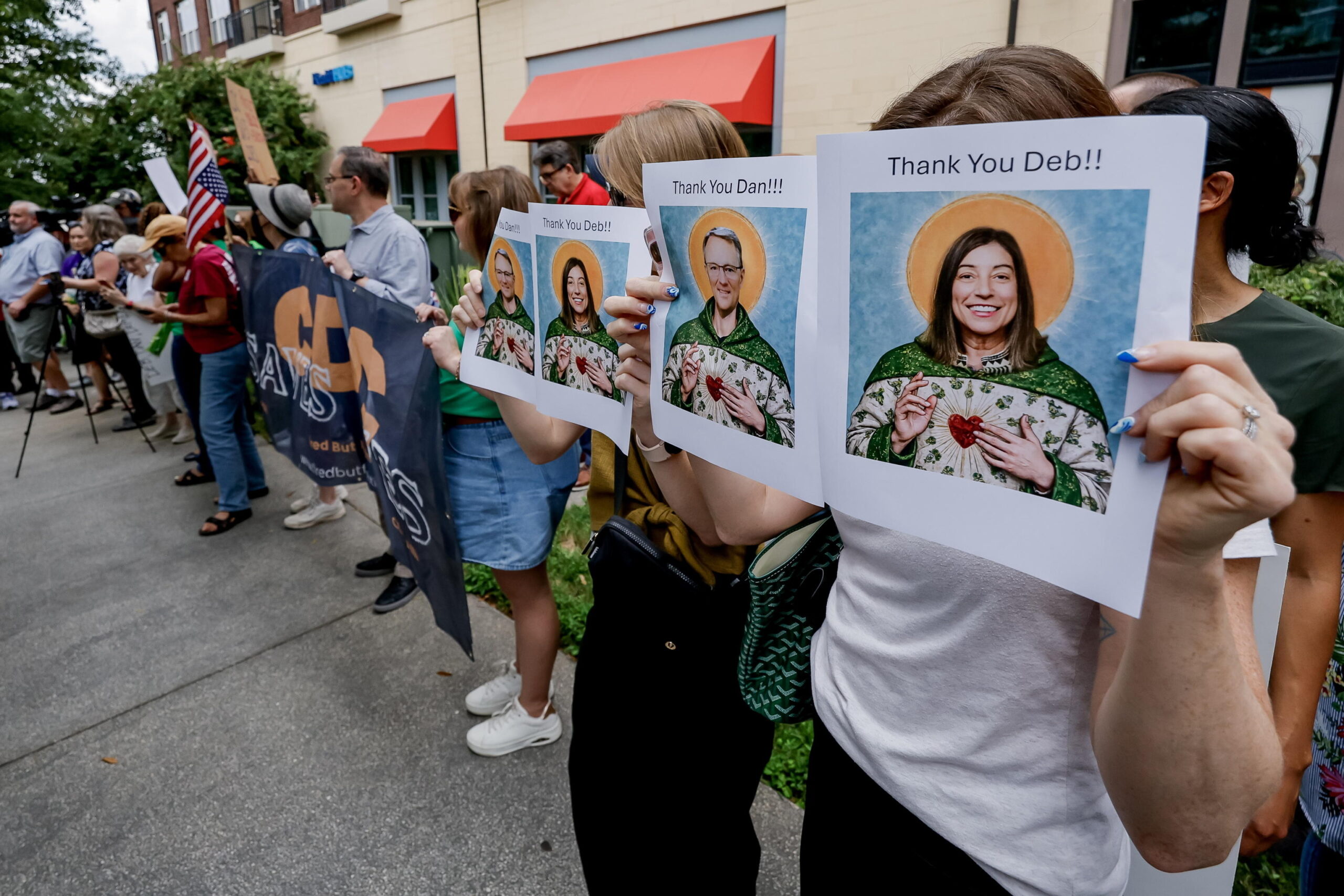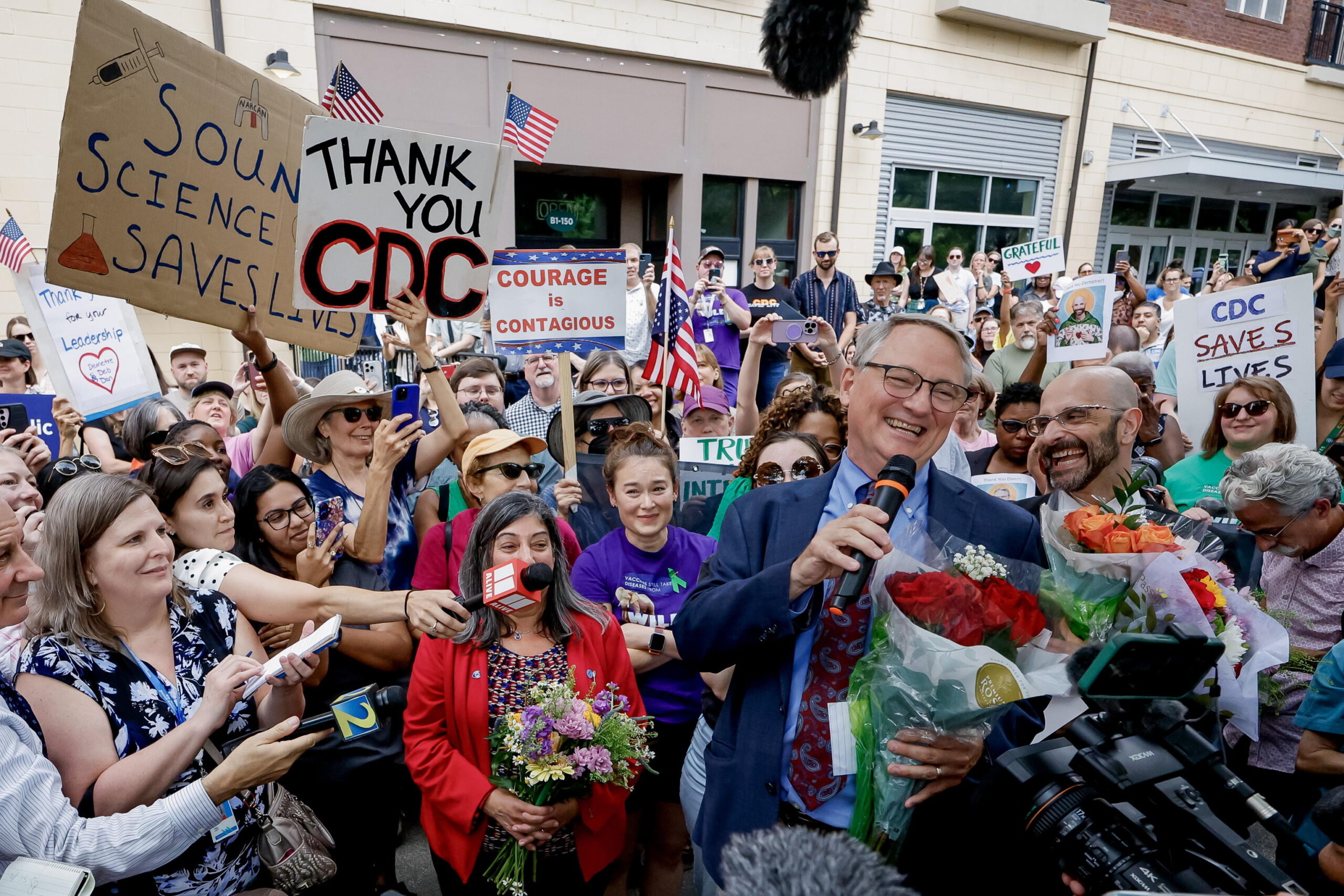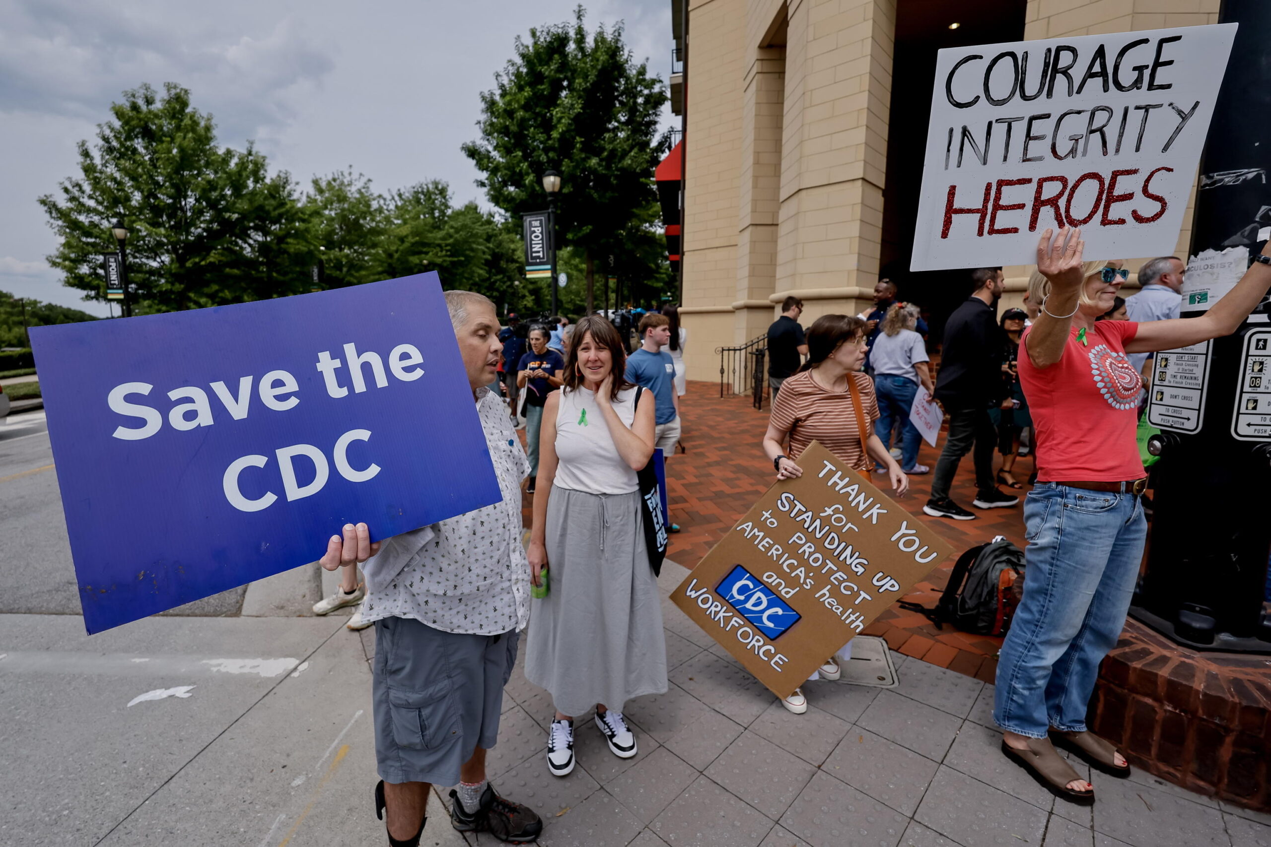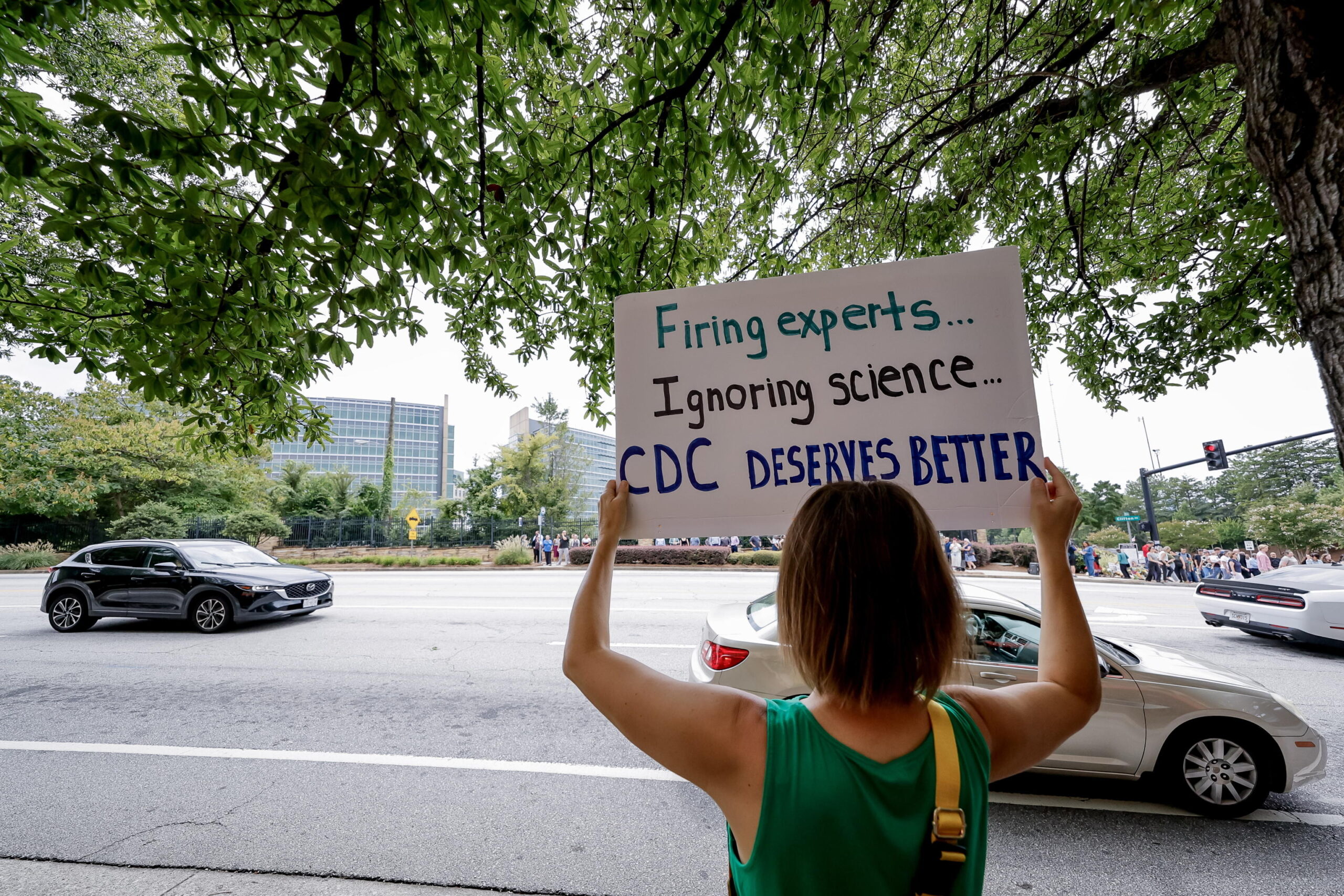Nelle foto si vede una delle proteste tenutesi il 28 agosto alla sede del CDC ad Atlanta, a sostegno della direttrice licenziata e dei dimissionari.